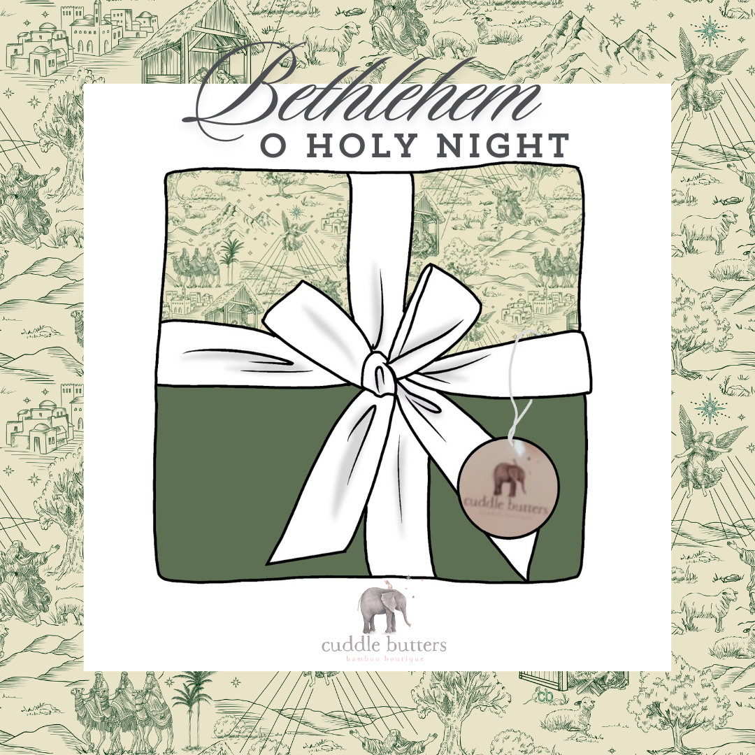 "Bethlehem" - Come celebrate the true meaning of Christmas with Cuddle Butters Bamboo Boutique and Pamela Jean Noble as we collaborate together to create the "O Holy Night Collection." This vintage classic "Toile De Jouy" inspired design is exclusive to our brand and was created to tell the story of the most holy night. 3 Wise Kings travel by camel bearing gifts for the Newborn King lying in the humble manger. Shepards are watching their flocks as Angels heard on high sing "Gloria!" with beams of heavenly light.