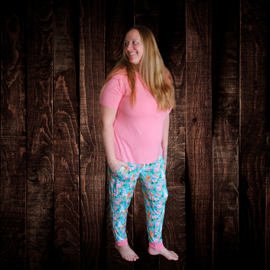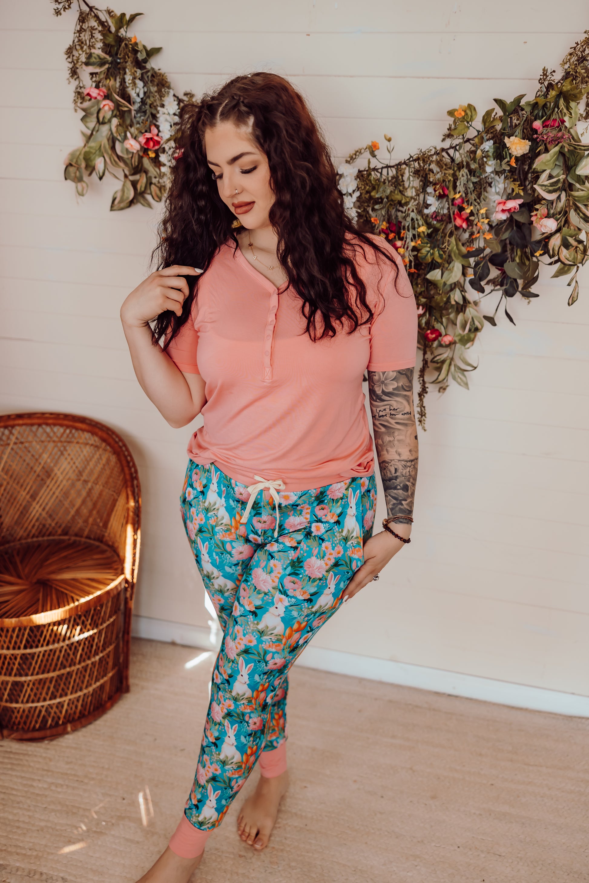 Women's Butter Jams are the softest, most buttery pajamas you have ever slept in. The top features functional snaps on the chest for nursing or pumping in those midnight hours. The jogger bottoms have a functional drawstring and a tapered leg with a comfortable ankle cuff. These are perfect for photos, or general loungewear comfort. We won't judge you if you want to wear them all day. Short sleeve spring pajamas run a bit more fitted so you may want to size up if you prefer a looser fit.