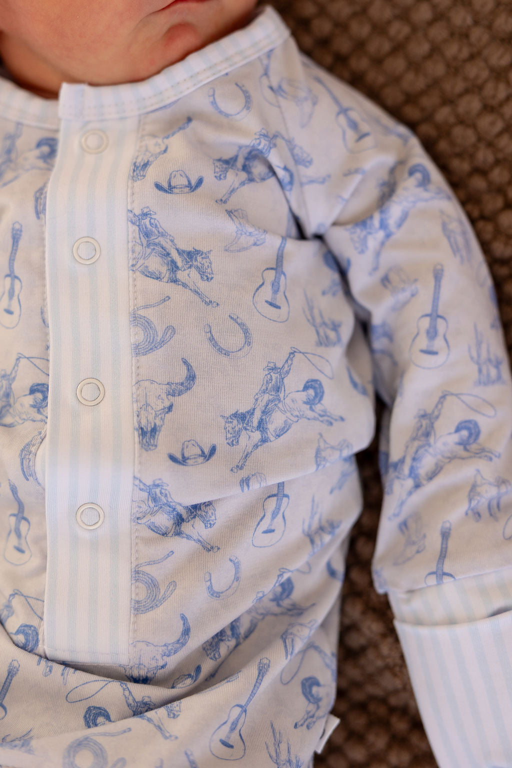 Adorned with the charming "Beau Blue" print featuring soft blue toile with a western cowboy motif