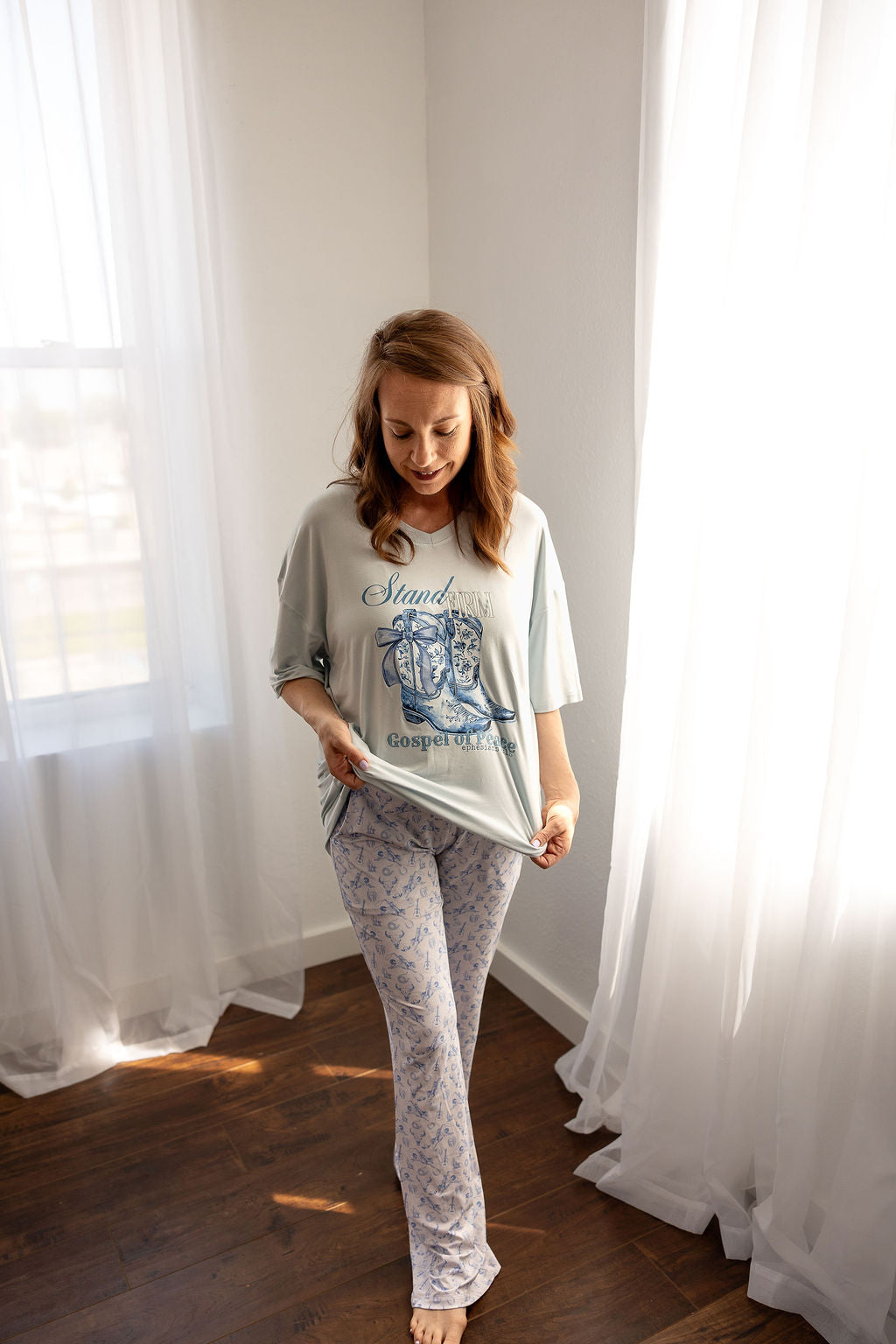 Find inspiration and comfort with our "Stand Firm" Women's Perfect Sleep Tee. This oversized, tunic-length tee is made from ultra-soft bamboo viscose, offering a breathable and lightweight feel. Featuring a meaningful "Stand Firm" design with blue toile cowgirl boots, it's perfect for restful nights and reflective mornings. Pair it with our Beau Blue sleep shorts or flare pants for a complete look.