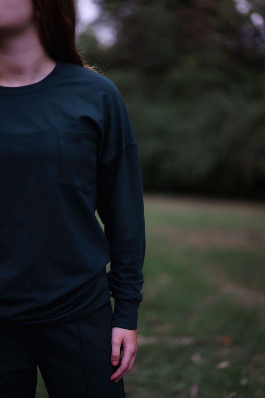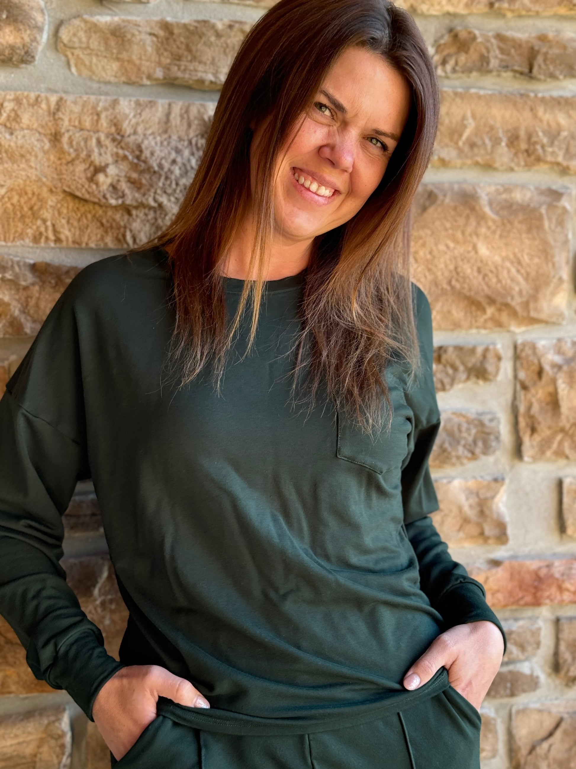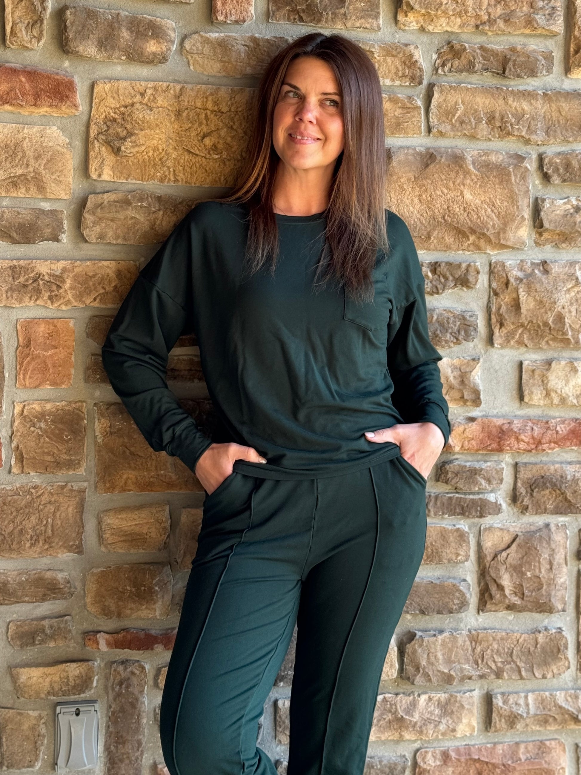 We absolutely love the softness and quality of bamboo. So much, that we want to wear it all day! Now you can in the Bamboo French Terry Jogger. Even softer than other French Terry products, this lounge set is perfect for nights at home or errands by day. Oversized crew neck long sleeve top with pocket detail on the chest. Drawstring jogger with wide waistband, pockets, front seam detail and elastic ankles.