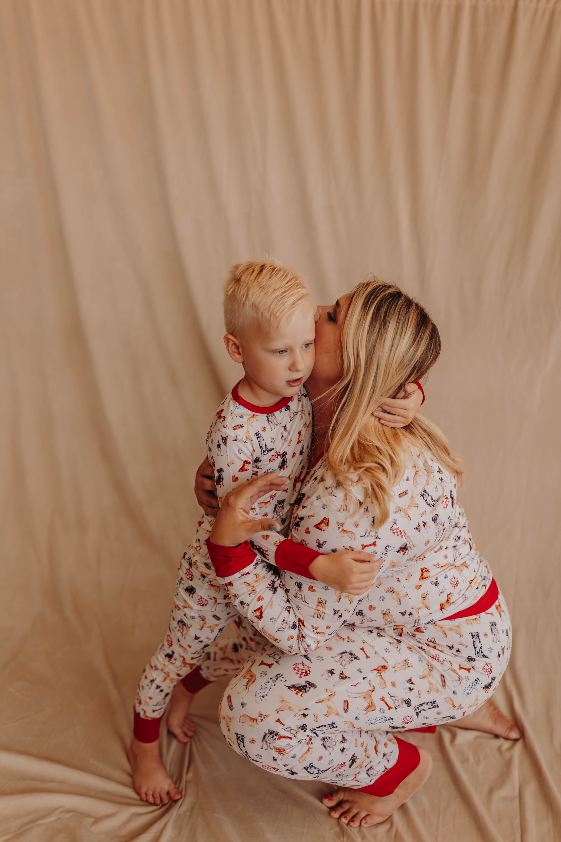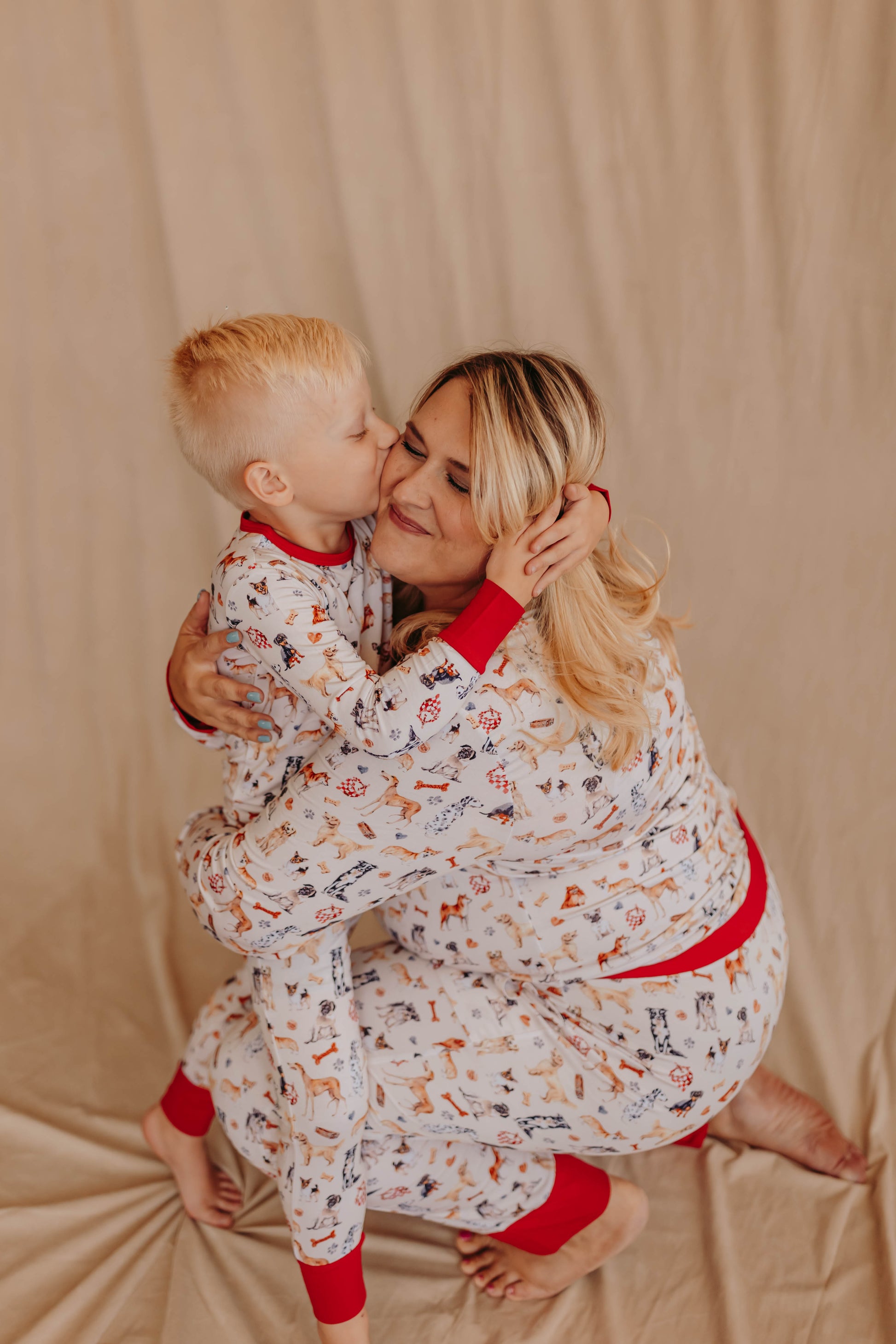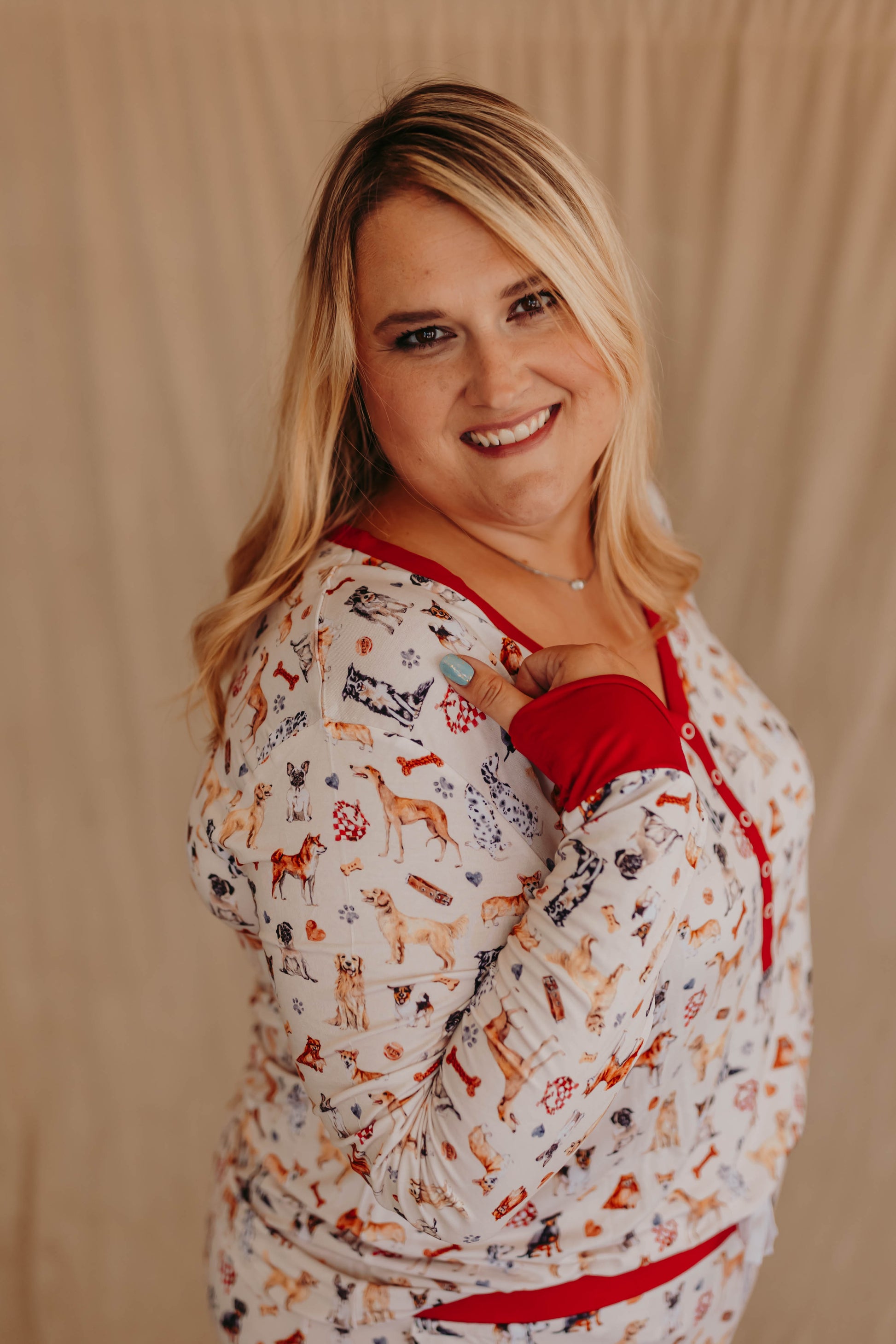 Who's a good boy? The Fetch women's butter jams are perfect for showing love to the fur-babies. Trimmed in bright red with so many dog breeds to count, The fetch pattern is perfectly neutral for cozy furry cuddles and family coordinating.