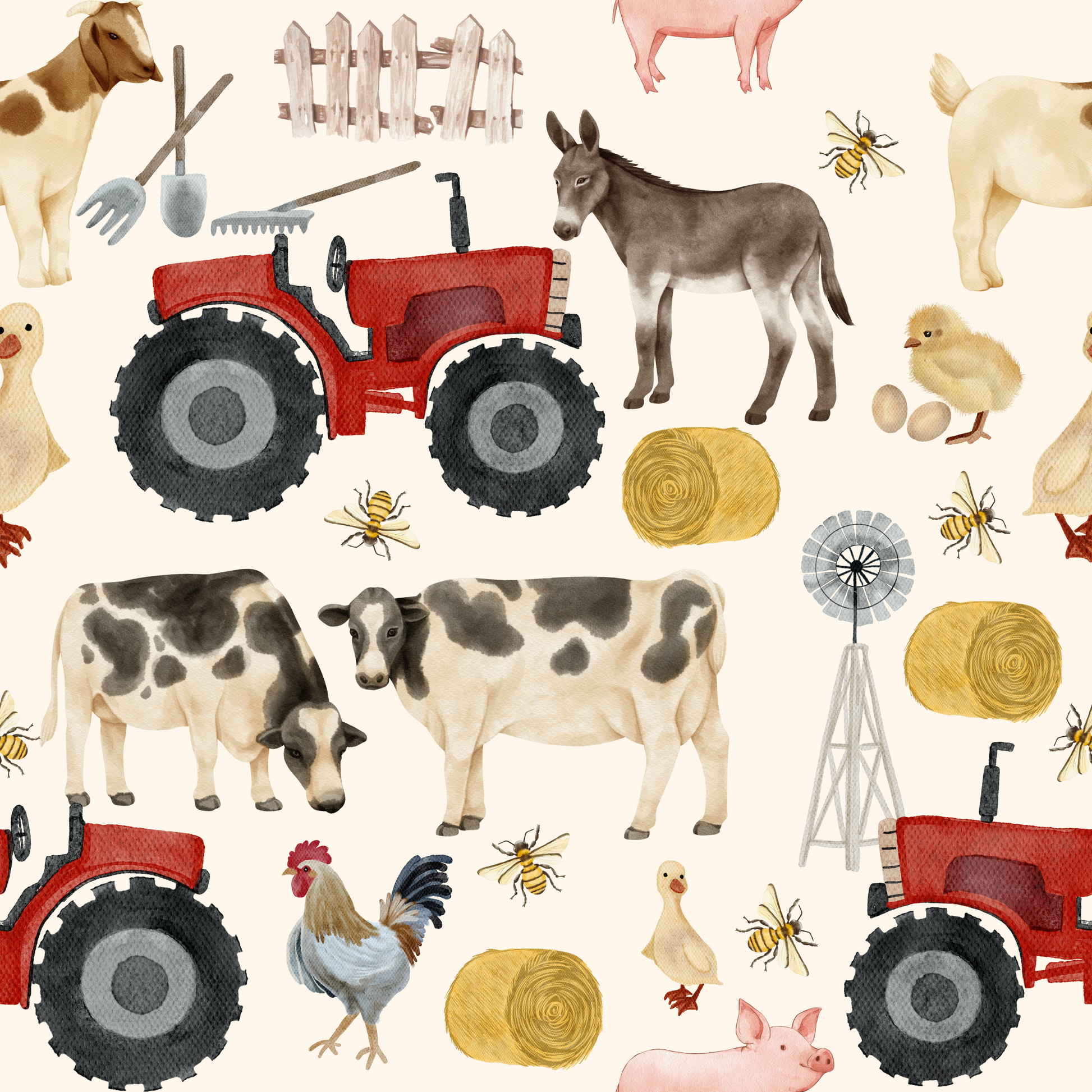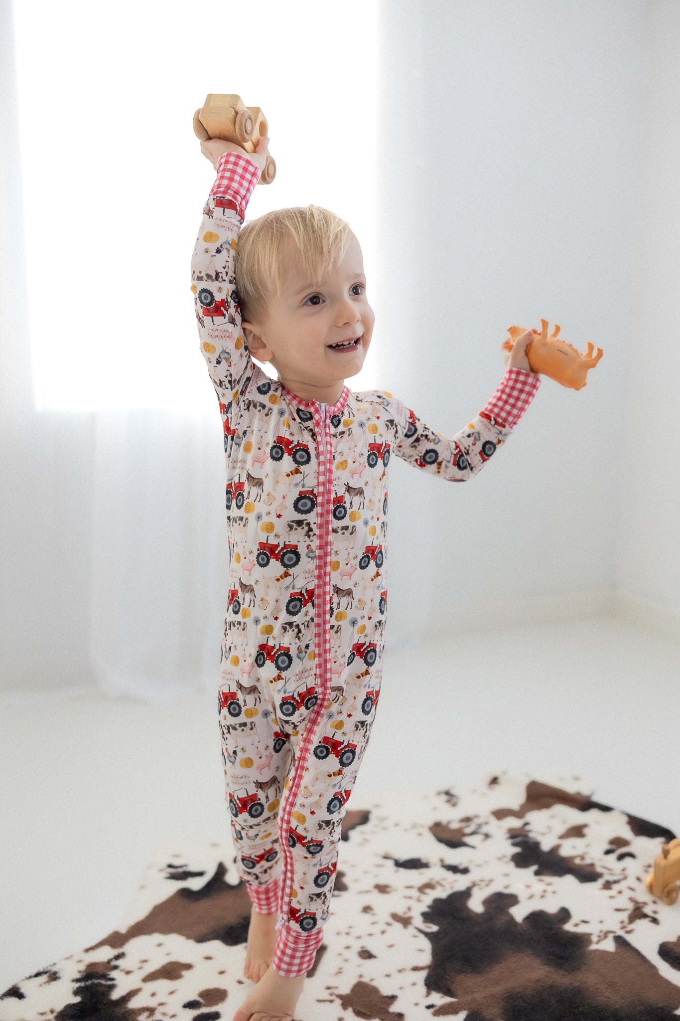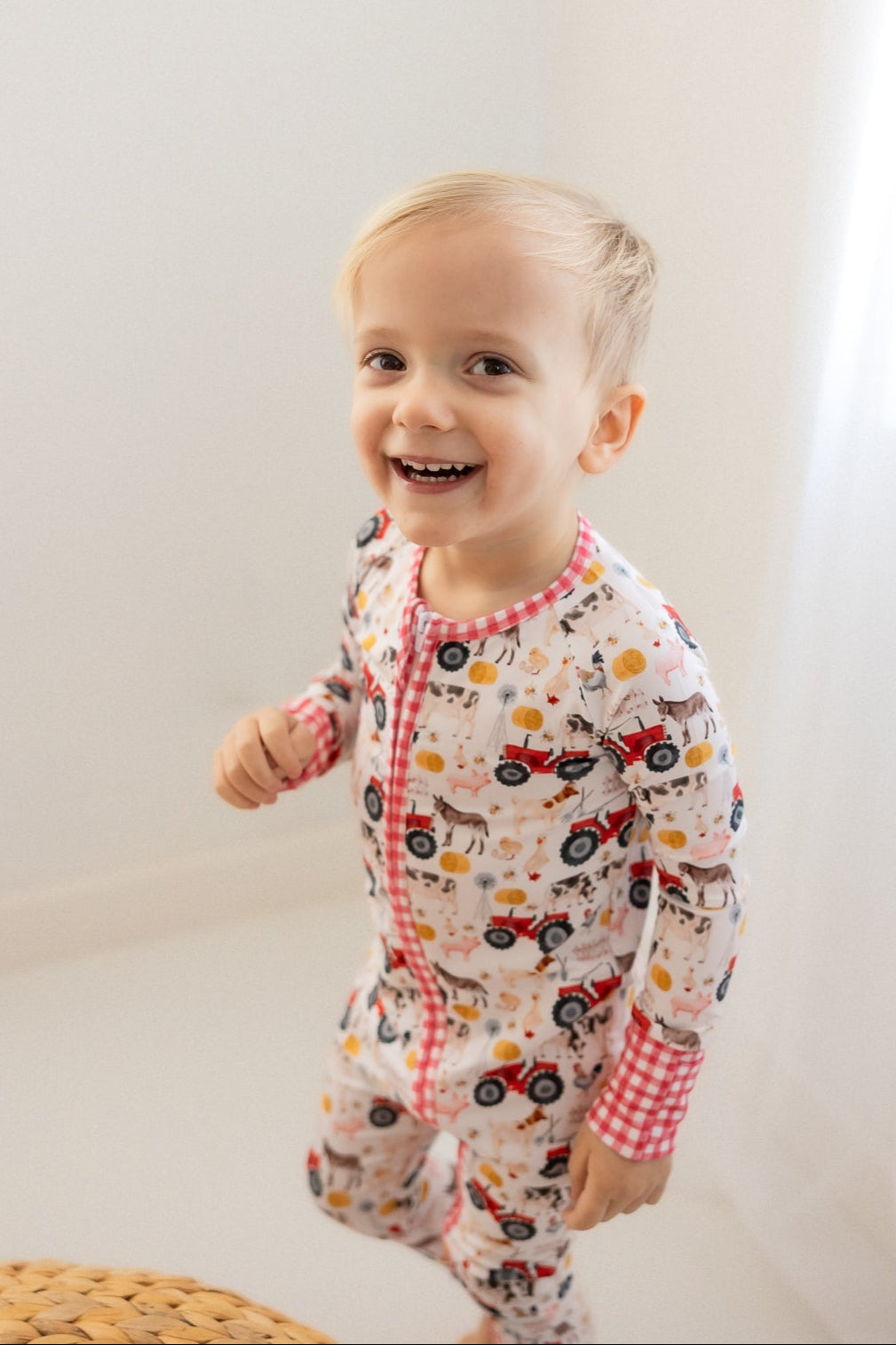 Henry - Down on grandpa's farm we have all the fun things! Tractors, cows, pigs and silly goose too. The Henry design is perfect for your farm loving babe. Trimmed in red gingham, Henry is the perfect timeless farmhouse find.