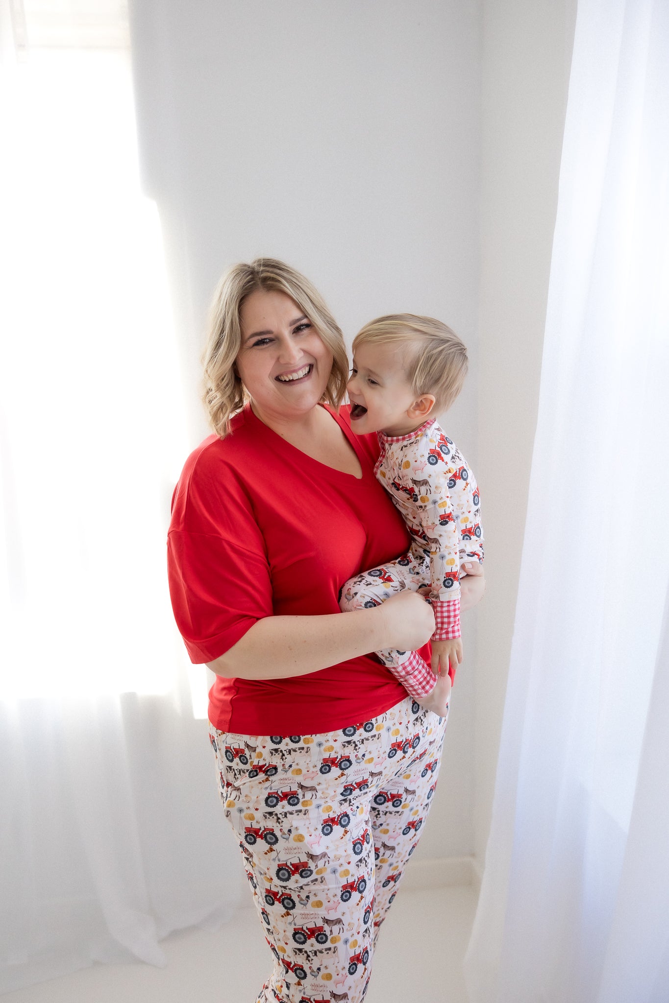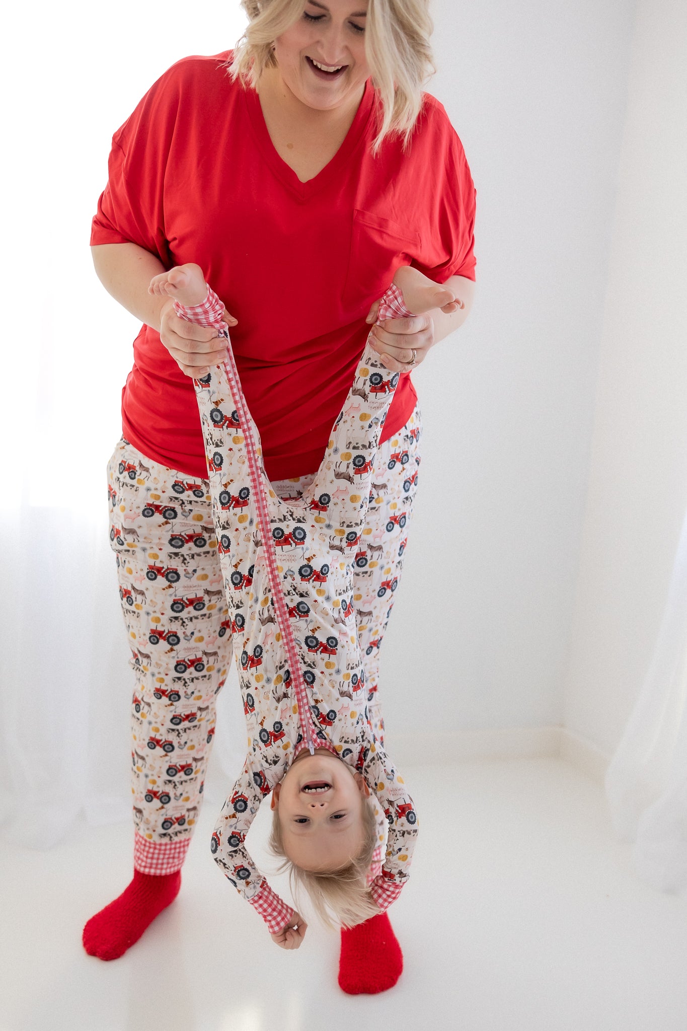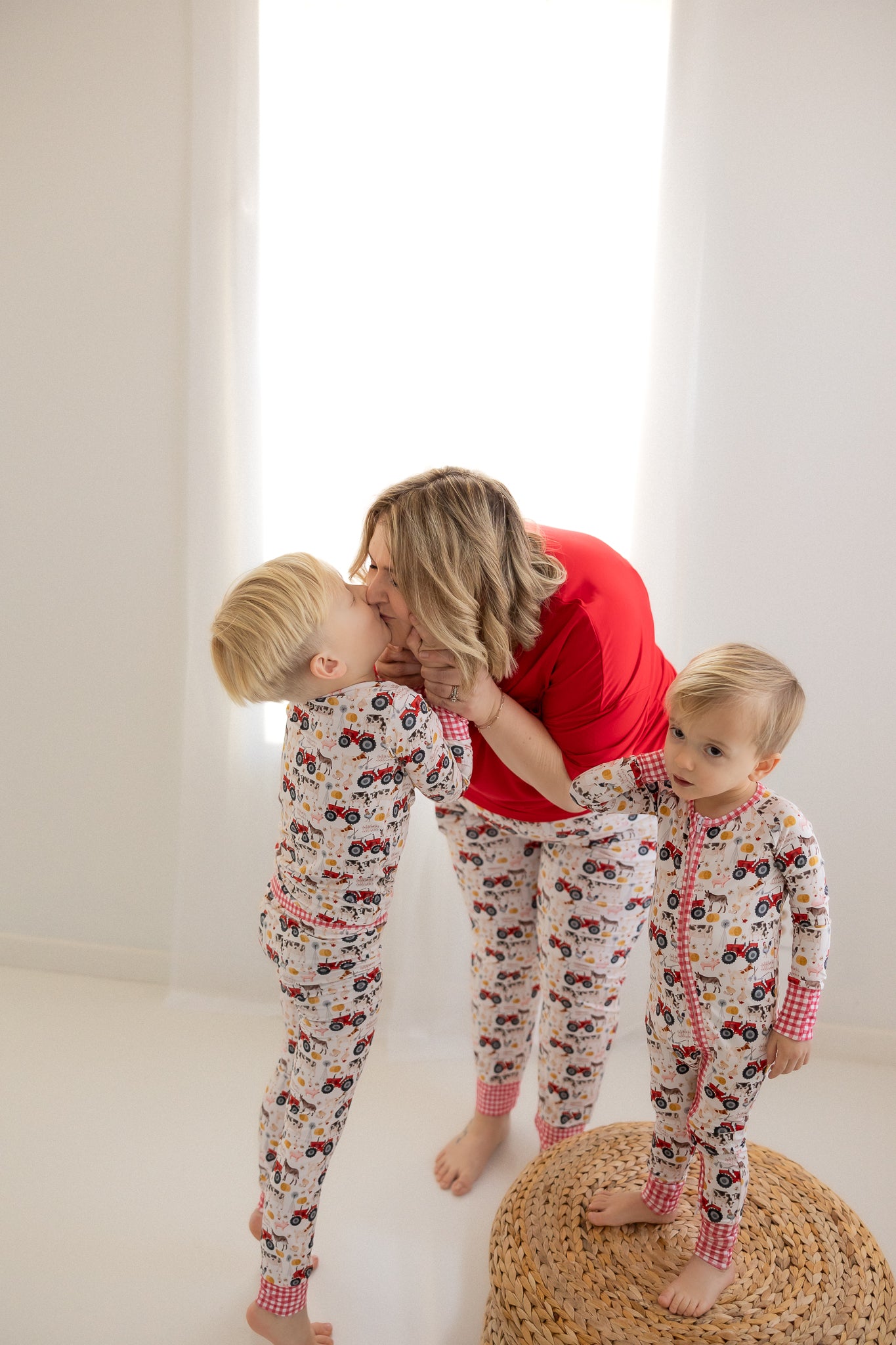 Henry - Down on grandpa's farm we have all the fun things! Tractors, cows, pigs and silly goose too. The Henry design is perfect for your farm loving babe. Trimmed in red gingham, Henry is the perfect timeless farmhouse find.