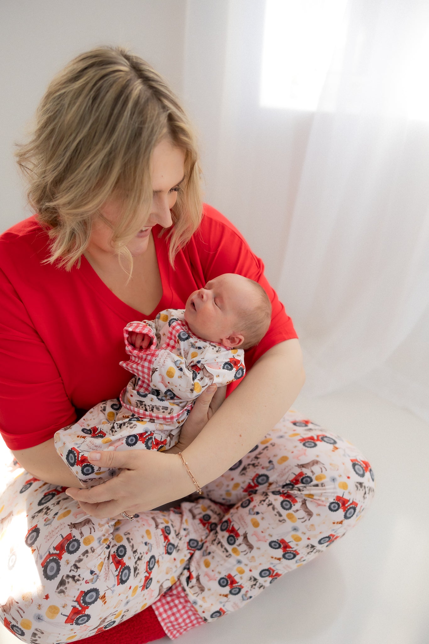 Henry - Down on grandpa's farm we have all the fun things! The Henry design is perfect for any farm loving babe. Trimmed in red gingham, tractors, cows, pigs and silly goose too. Henry is the best design for farmhouse fans.
