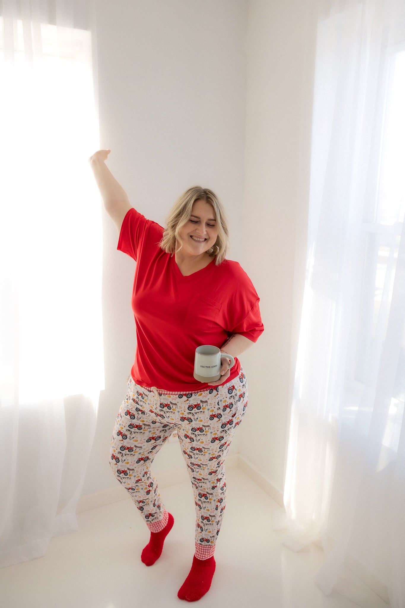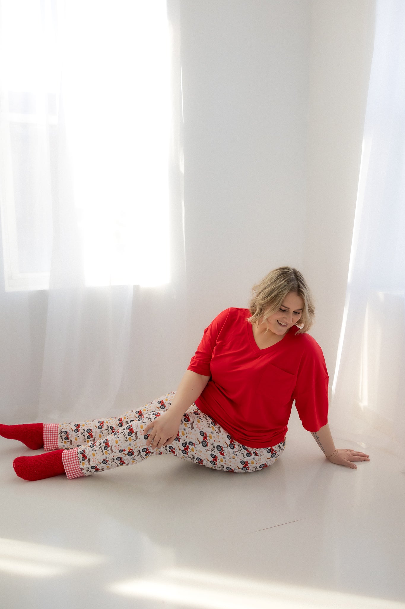 Crafted from luxurious bamboo viscose, the two piece butter jams have top-notch stretchiness for mom's maximum comfort. They fit perfectly snug with enough stretch to stay comfy even for maternity. The jogger is cozy with a functional drawstring and deep pockets. Bottom cuff in matching red gingham trim. We promise you will not want want to take these off!