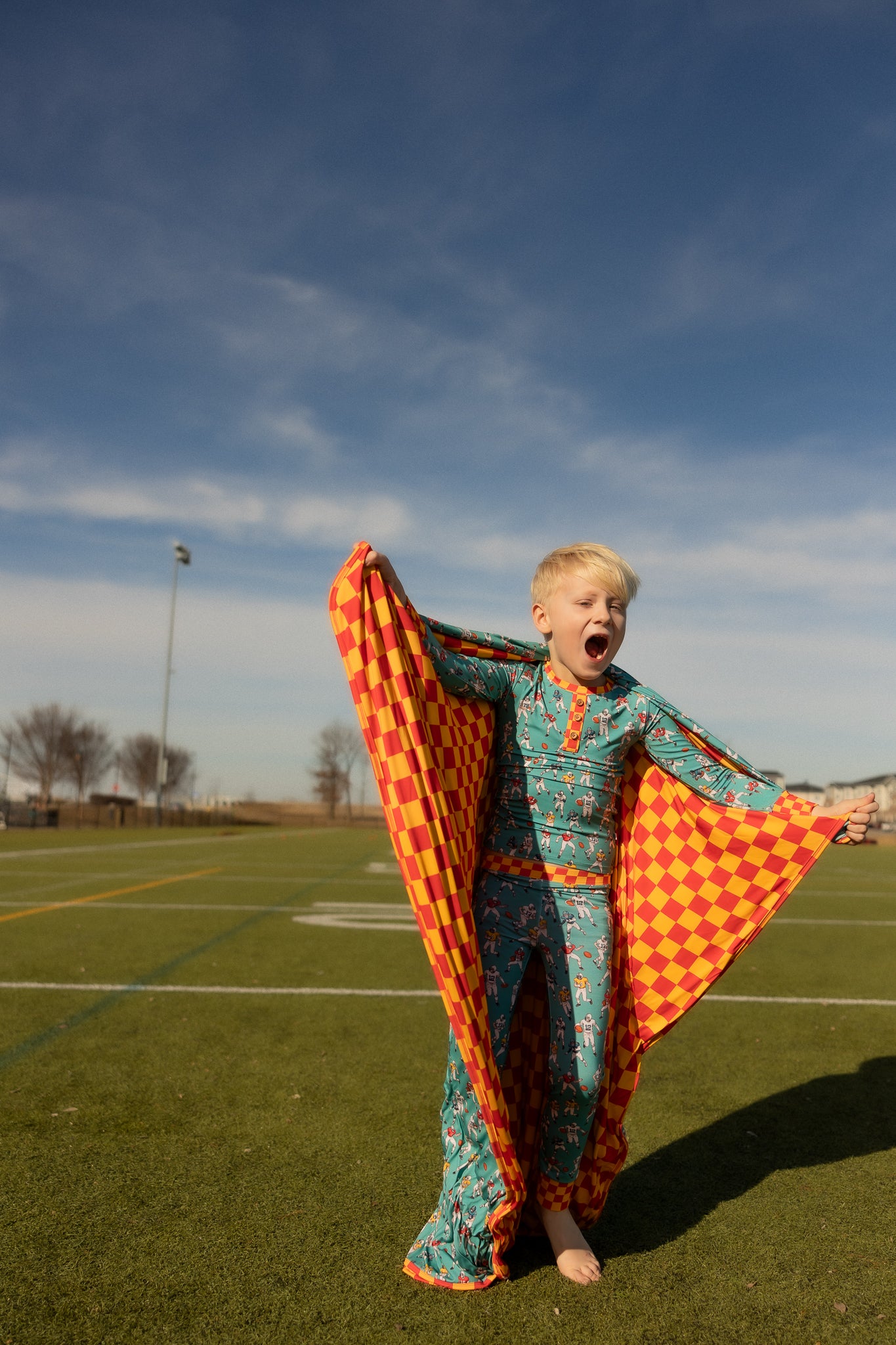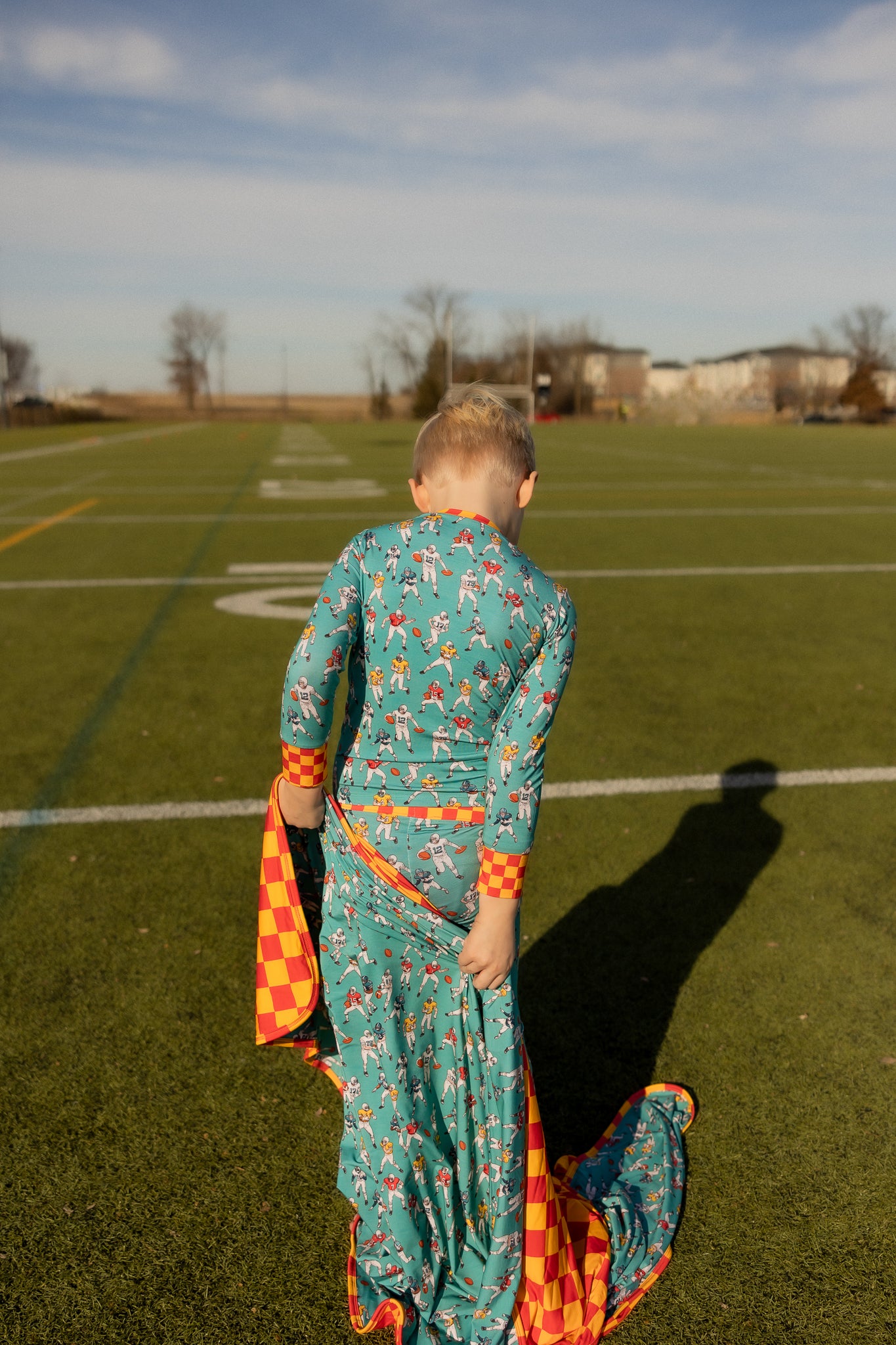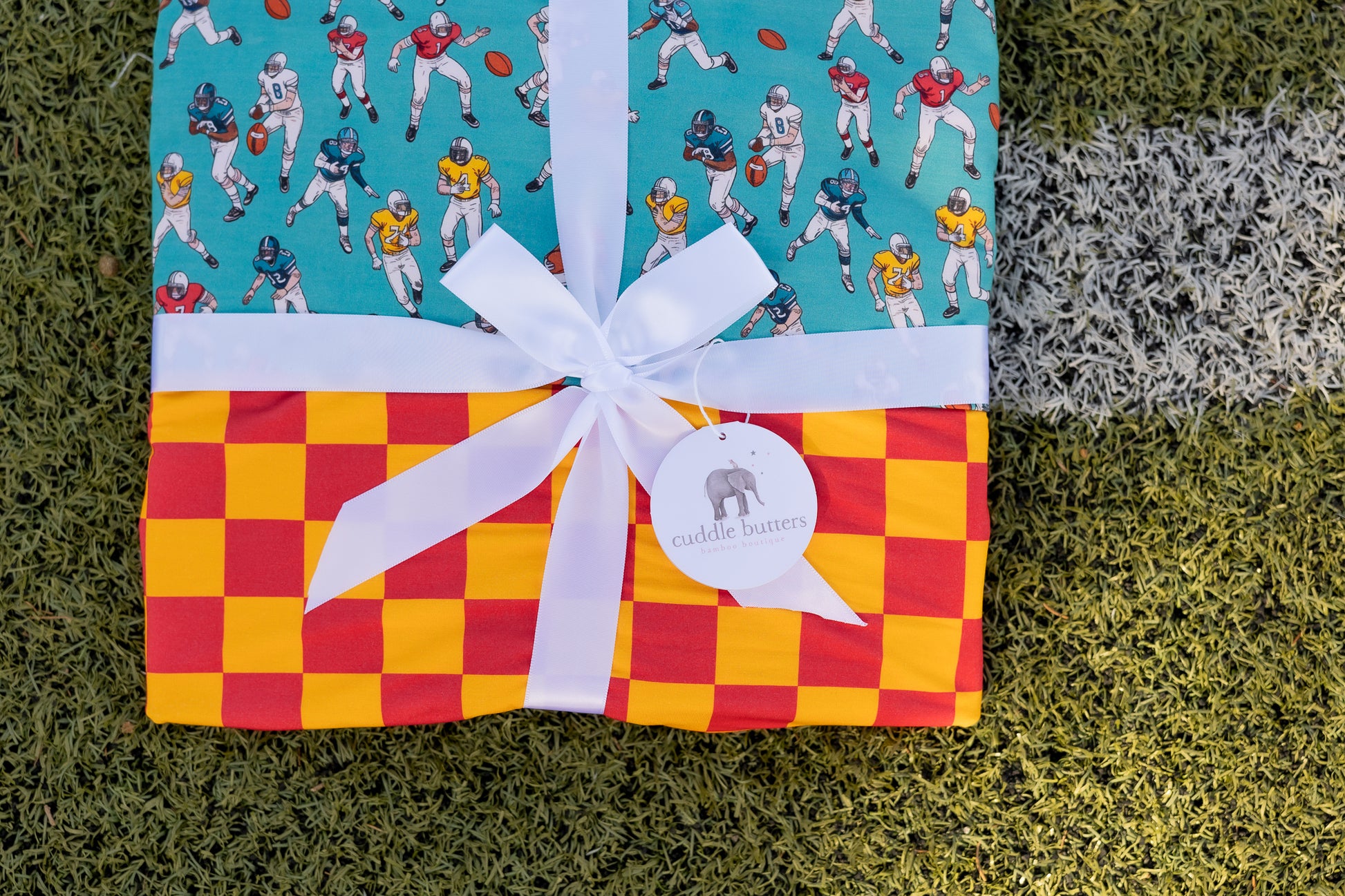 Kelce - Get your little champ ready to "score" some serious style with this adorable bamboo butter blanket! Featuring a playful teal football pattern, it’s a touchdown for any future MVP. The blanket is accented with a red and yellow checkered trim backing, adding a winning combination of color and charm. Soft, breathable fabric ensures your baby stays cozy while they “nap like a pro.”