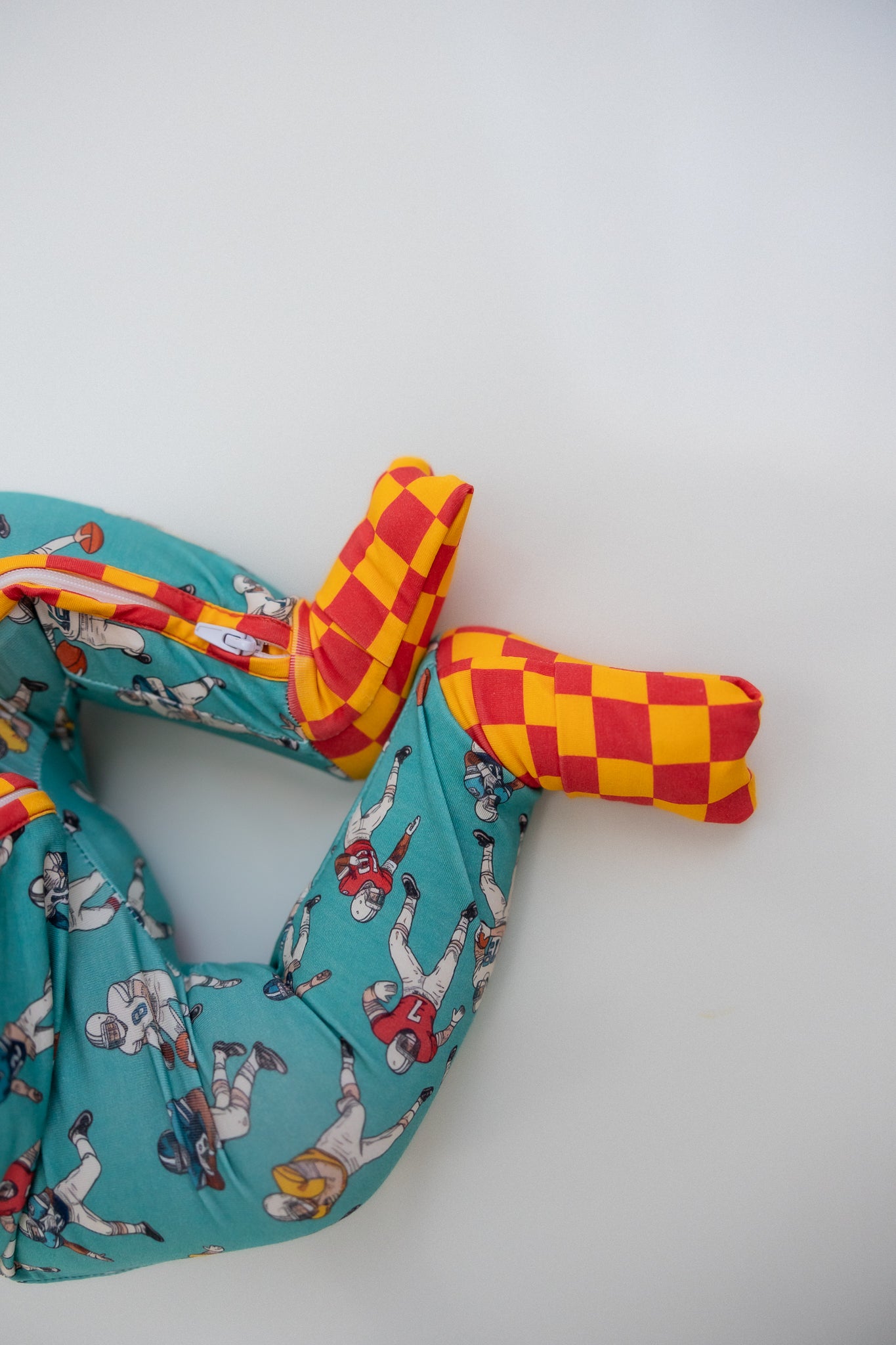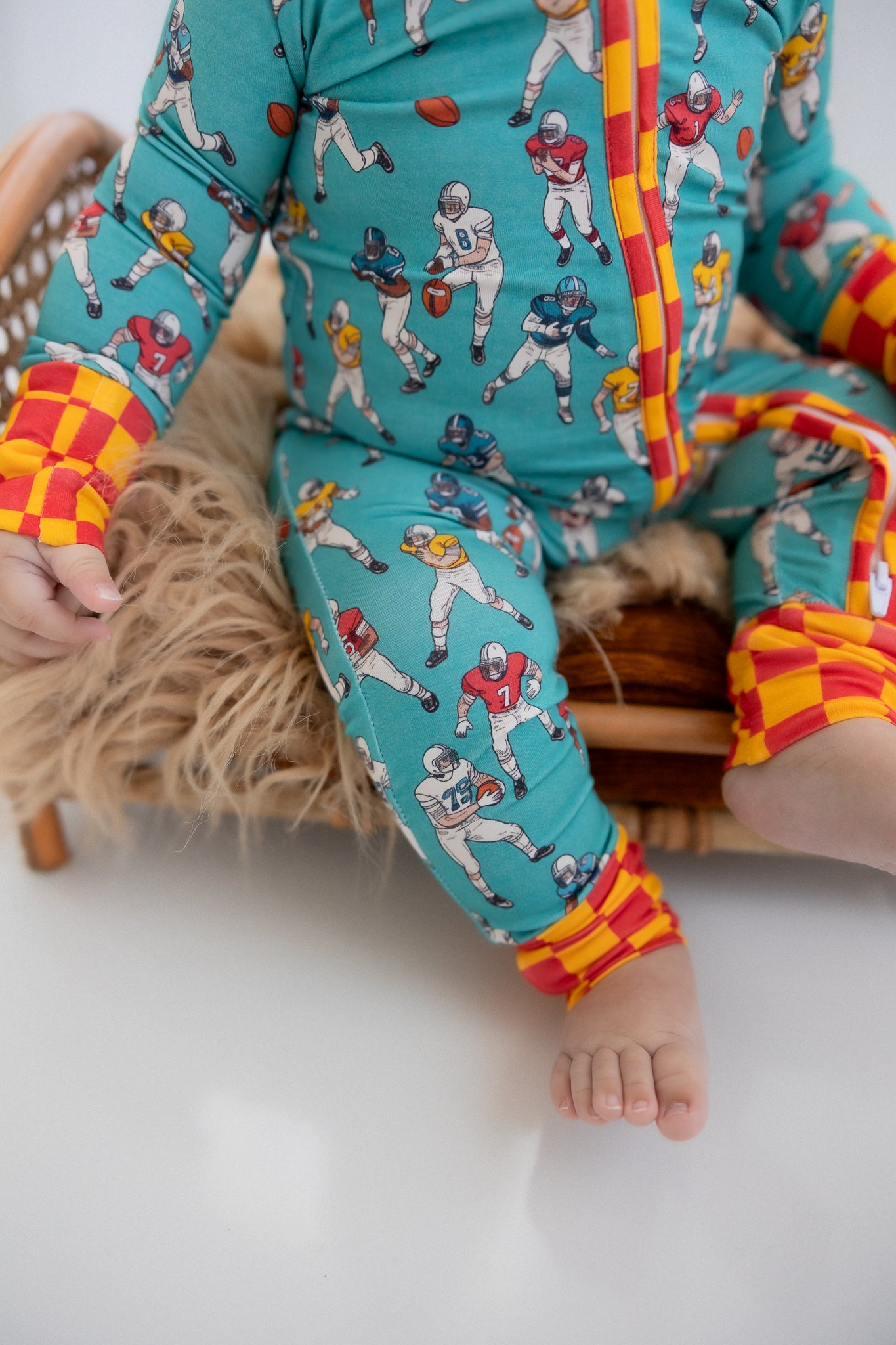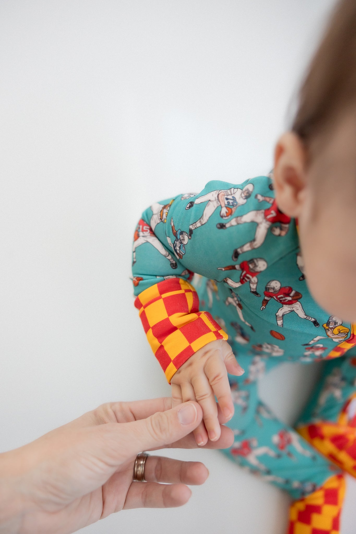 Kelce - Get your little one ready to "score" some serious style with this adorable convertible baby sleeper pajama! Featuring a playful teal football pattern, it’s a touchdown for any future MVP. The sleeper is accented with a red and yellow checkered trim, adding a winning combination of color and charm. Soft, breathable fabric ensures your baby stays cozy while they “nap like a pro.”