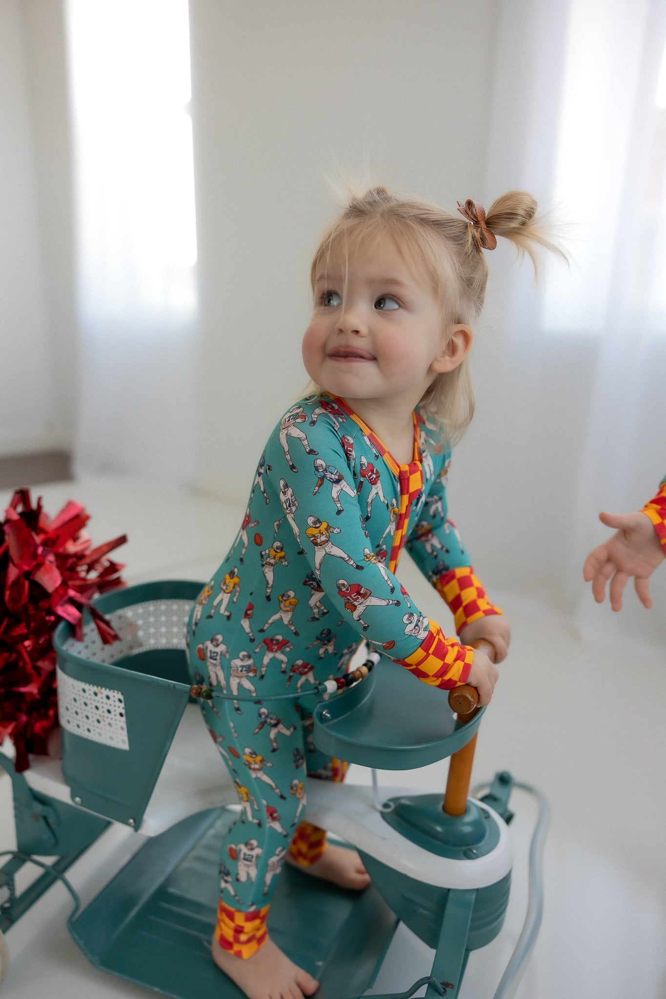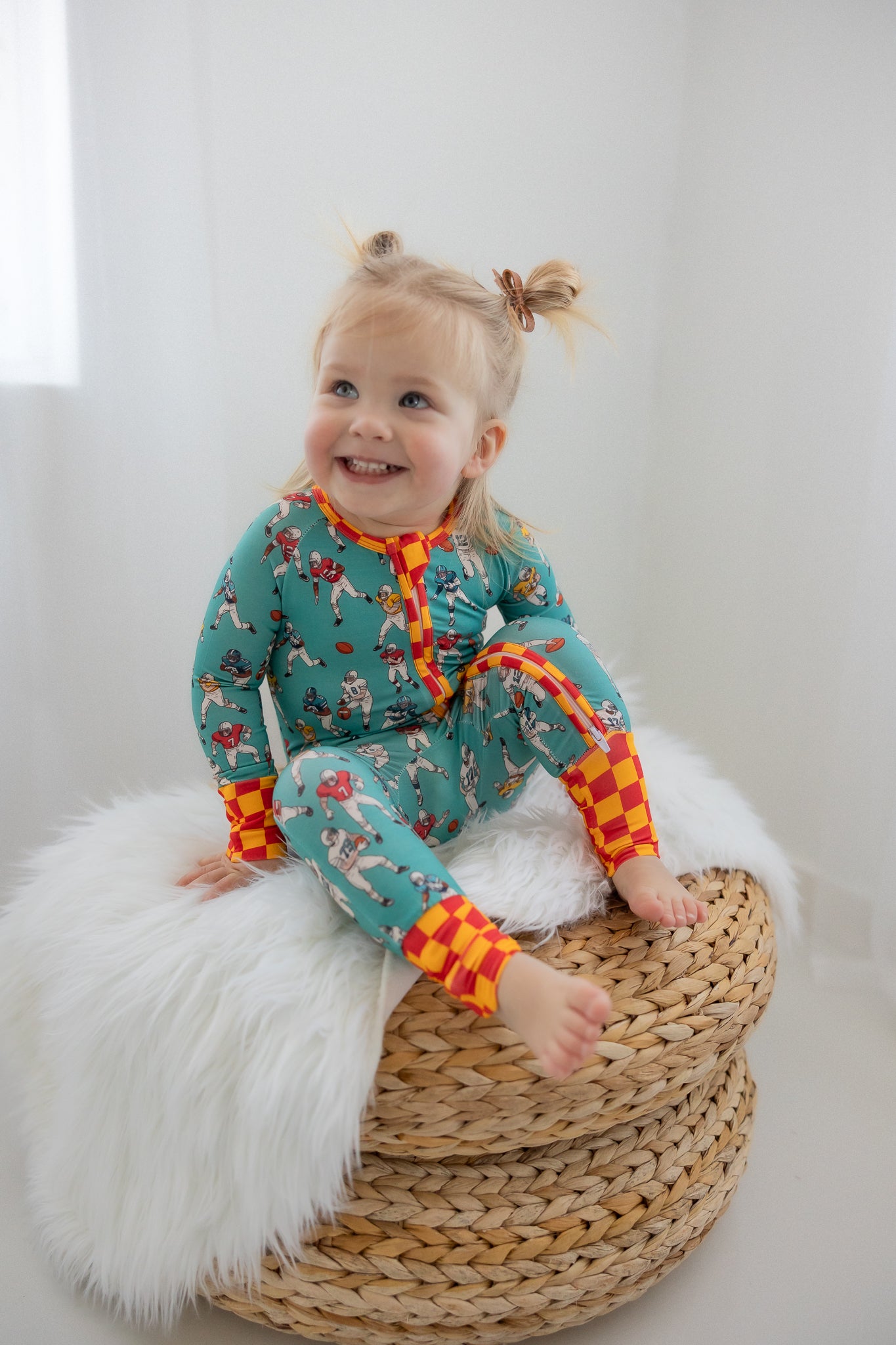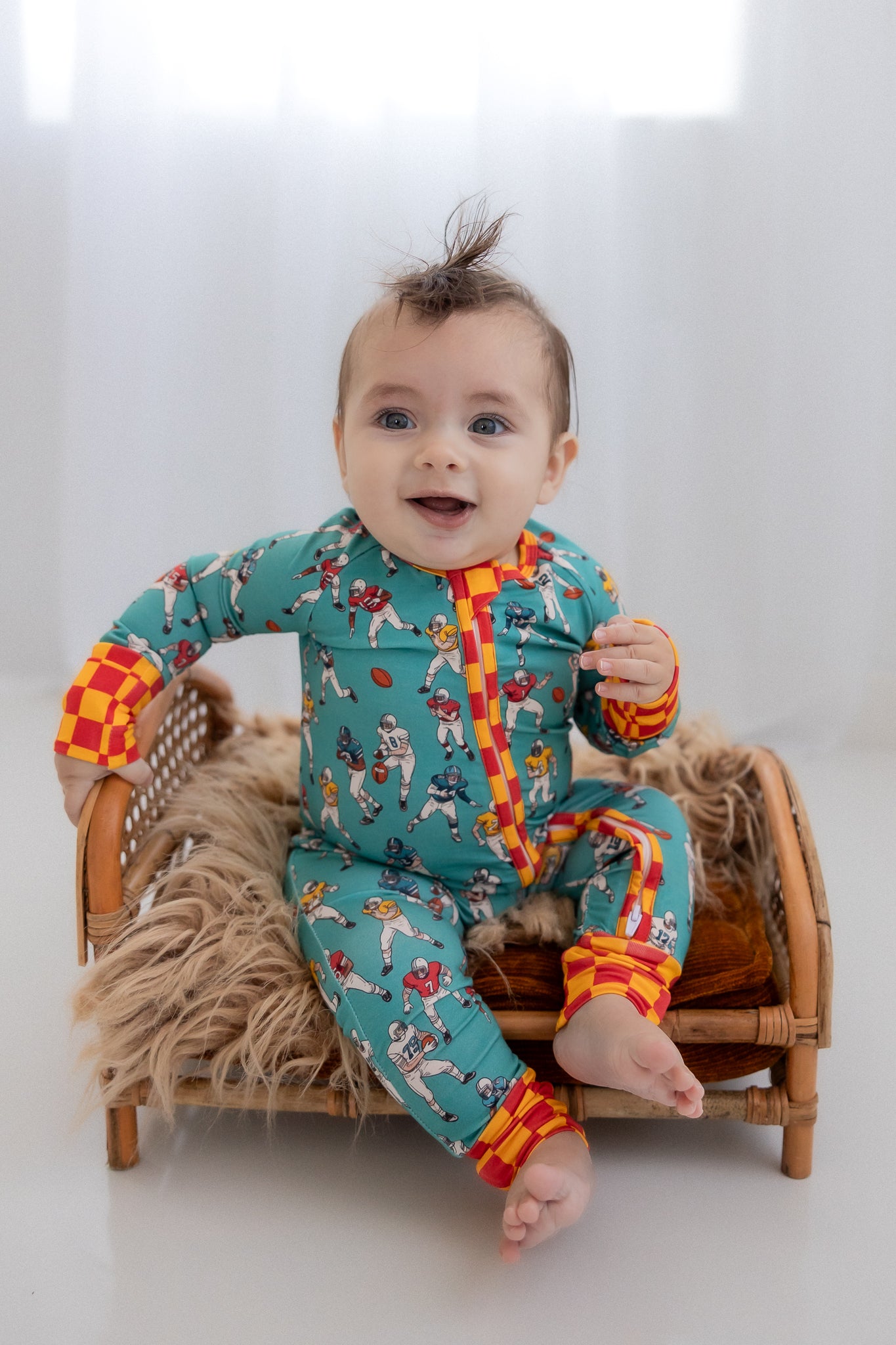 Kelce - Get your little one ready to "score" some serious style with this adorable convertible baby sleeper pajama! Featuring a playful teal football pattern, it’s a touchdown for any future MVP. The sleeper is accented with a red and yellow checkered trim, adding a winning combination of color and charm. Soft, breathable fabric ensures your baby stays cozy while they “nap like a pro.”