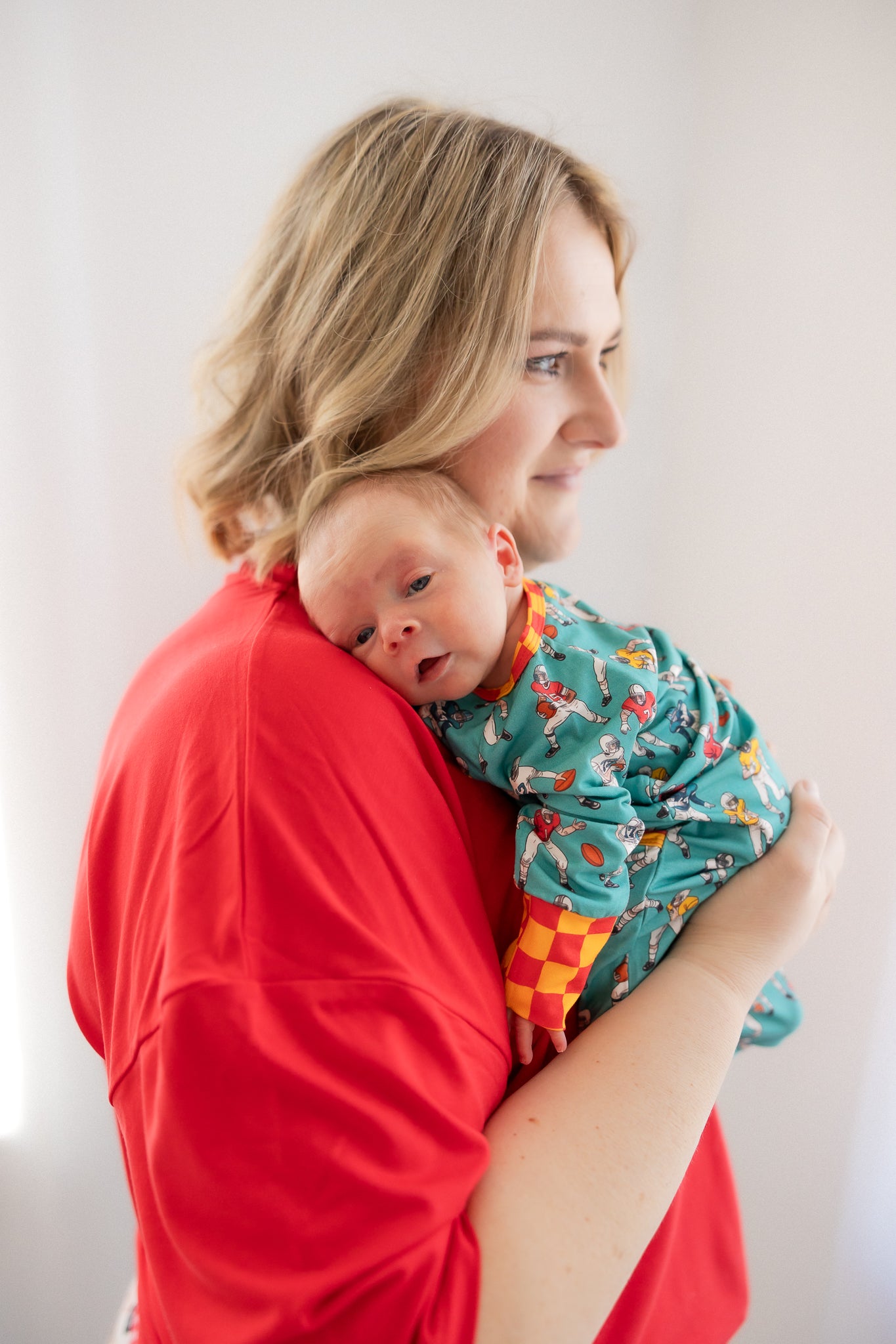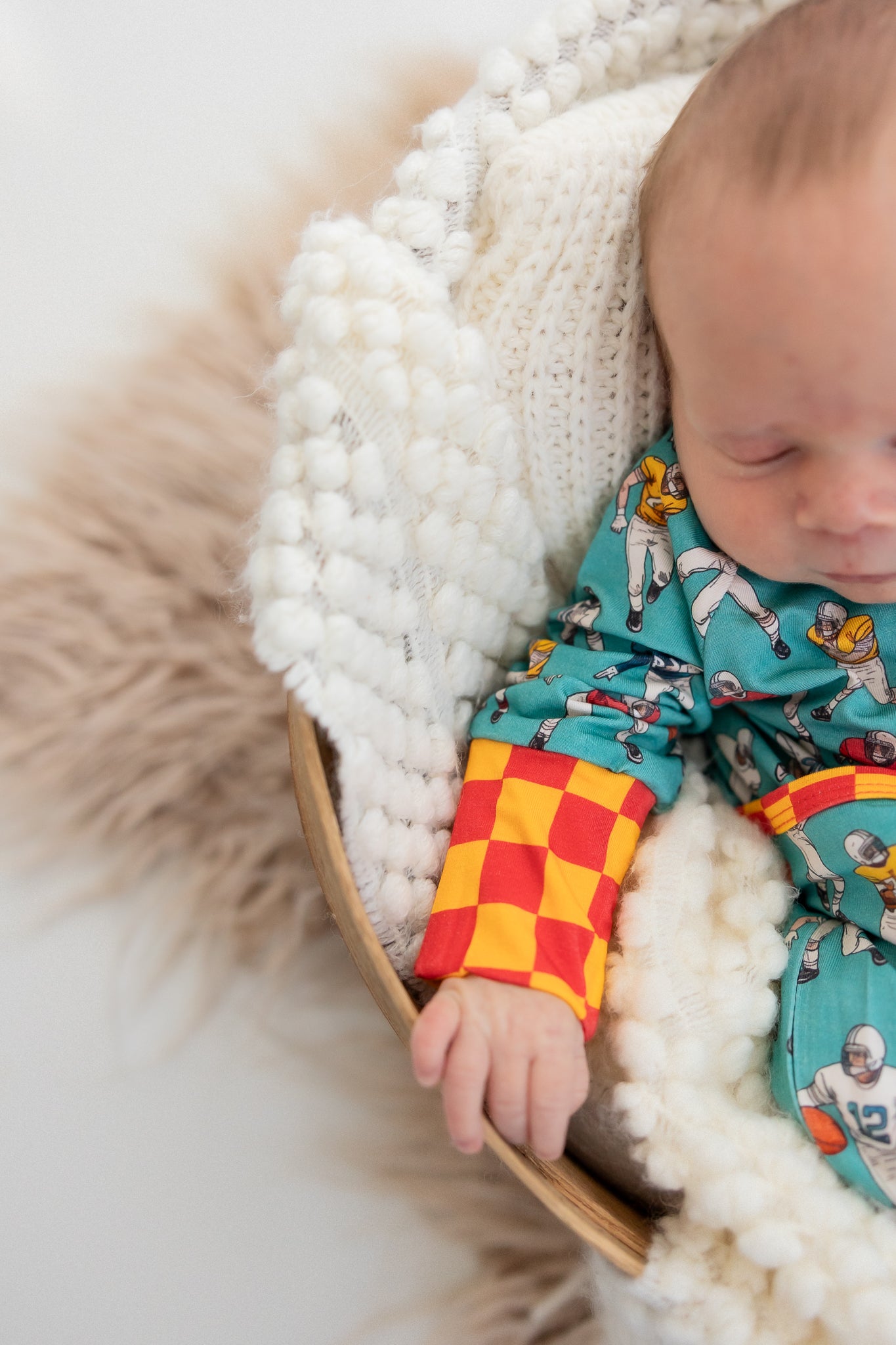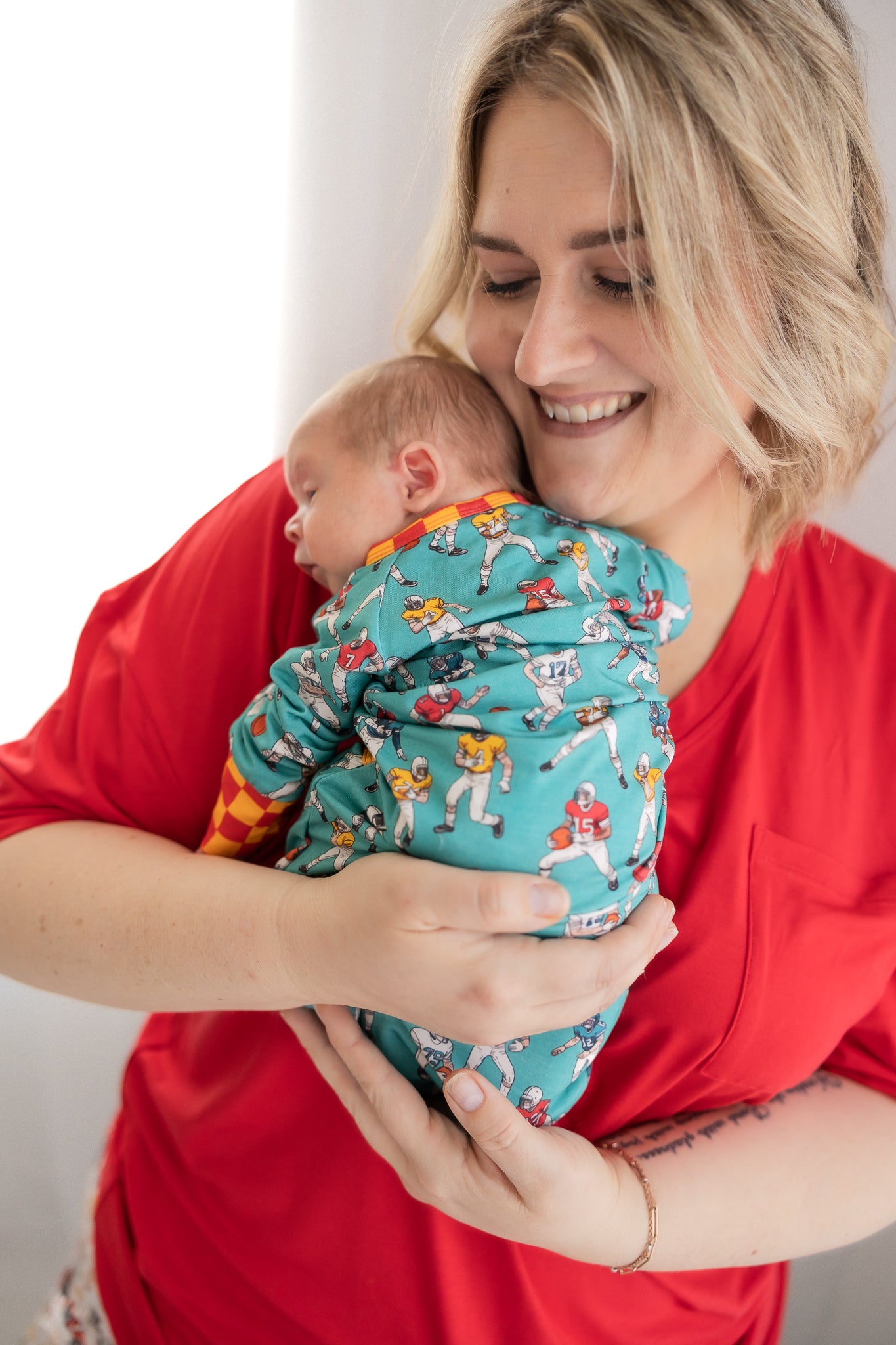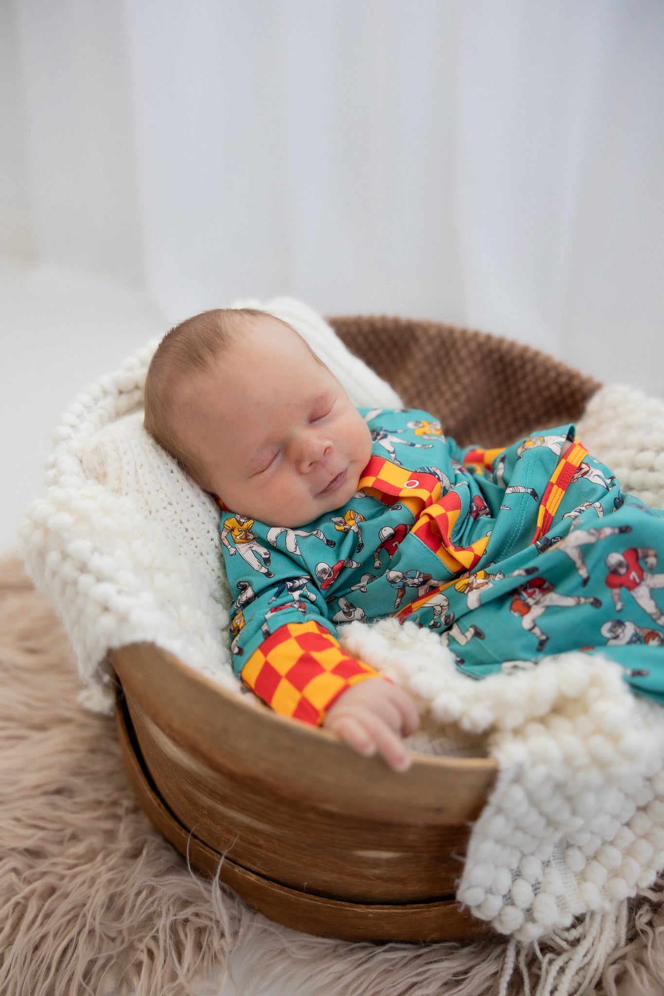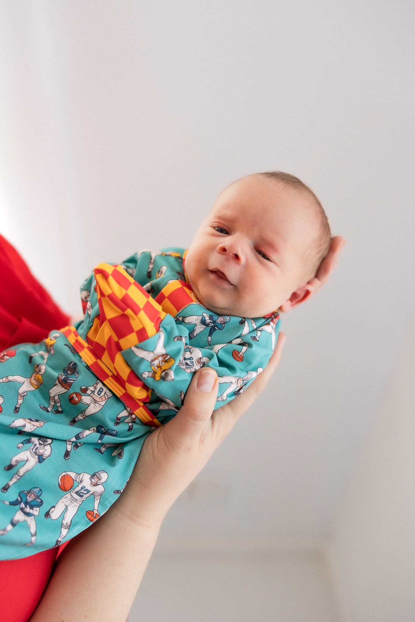 Kelce - Get your little champ ready to "score" some serious style with this adorable sleep sack! Featuring a playful teal football pattern, it’s a touchdown for any future MVP. The sleeper is accented with a red and yellow checkered trim, adding a winning combination of color and charm. Soft, breathable fabric ensures your baby stays cozy while they “nap like a pro.”