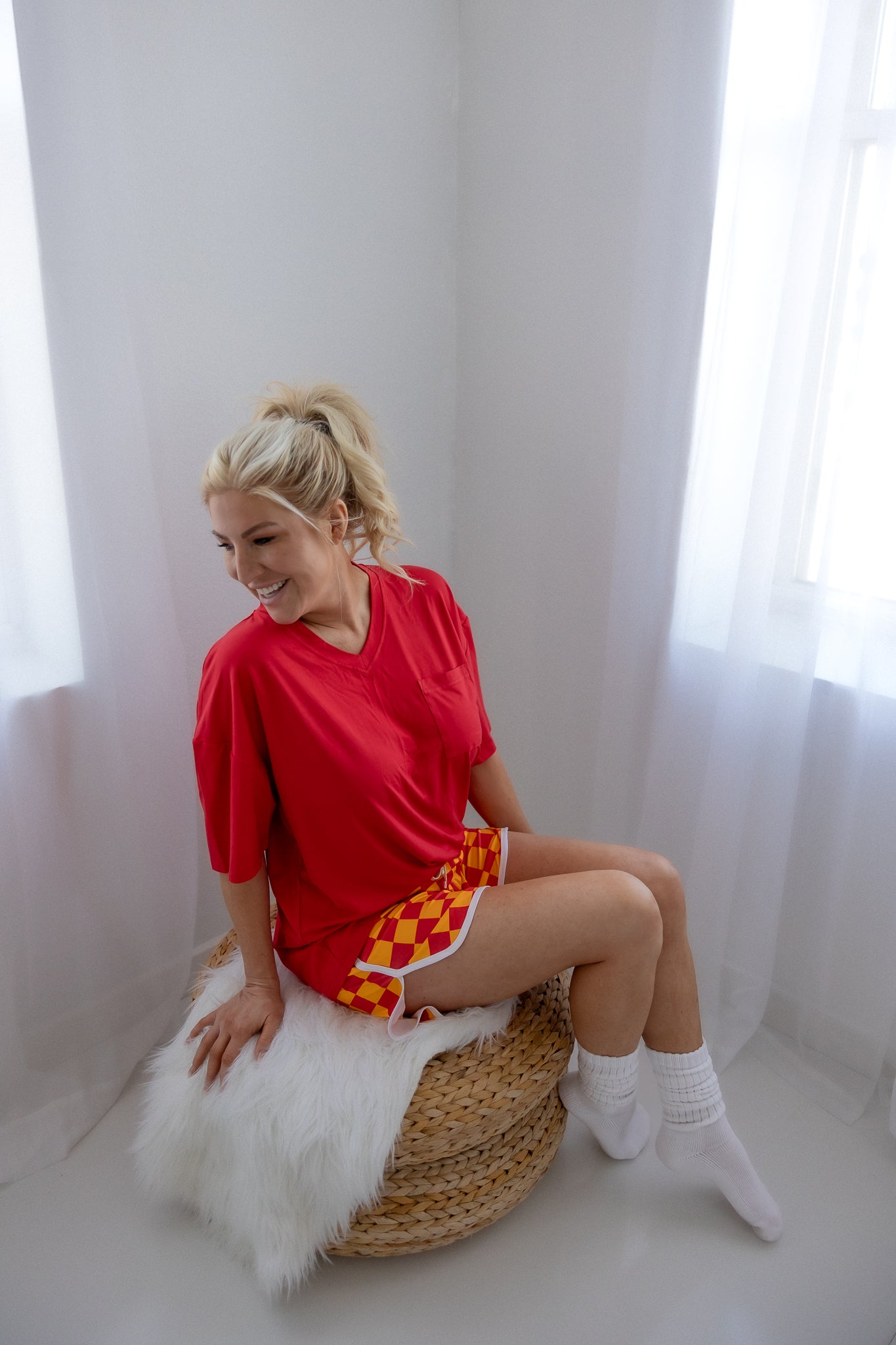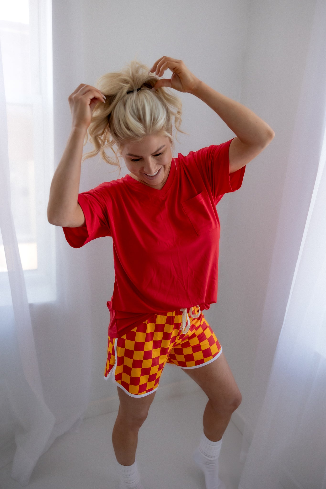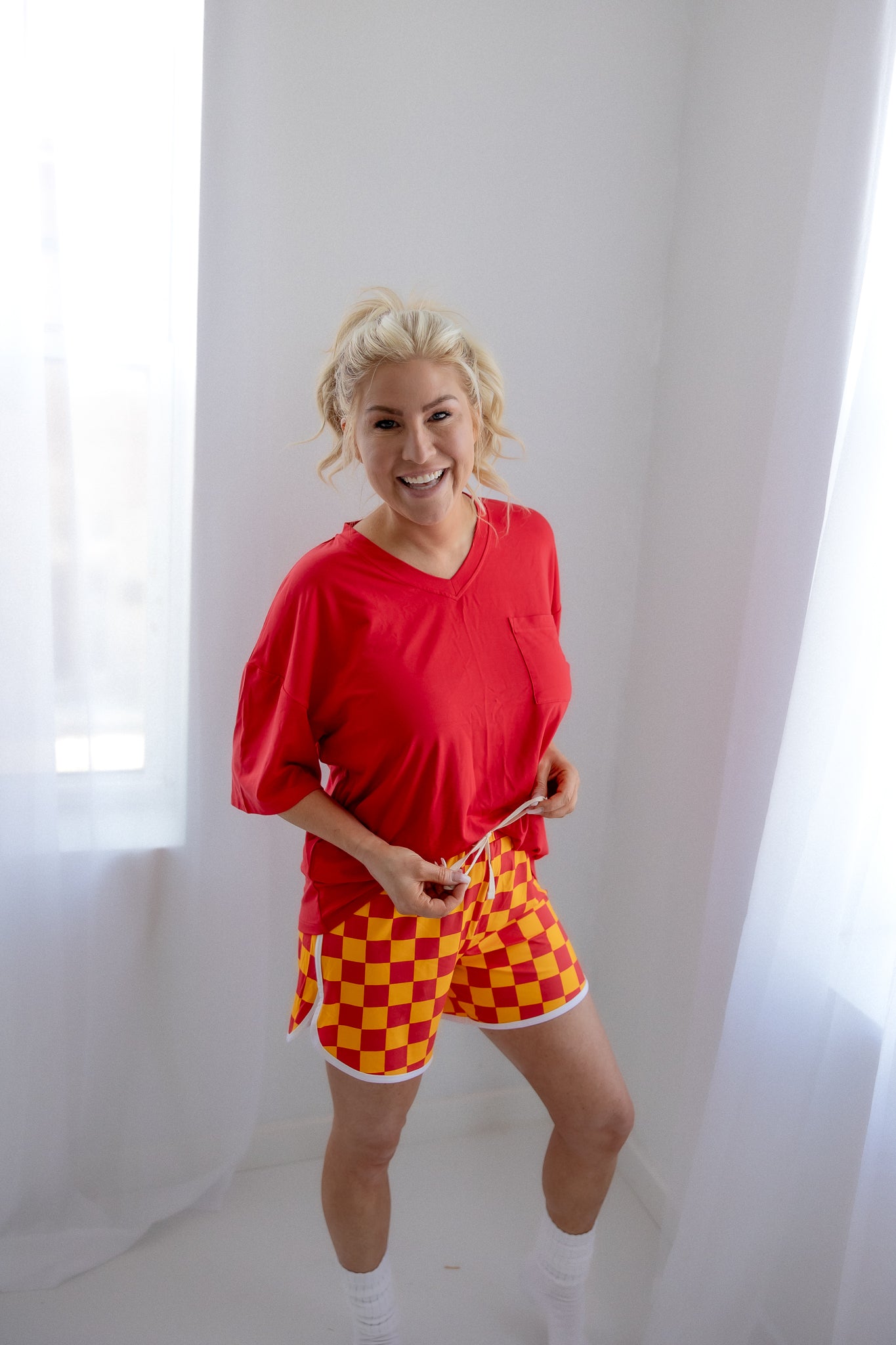 Cheer on your favorite team (or get your team ready for bedtime). Kelsi shorts have a bold red and gold check design with a vintage athletic trim. Functional pockets and drawstring make these shorts perfect for any busy woman. 240gsm