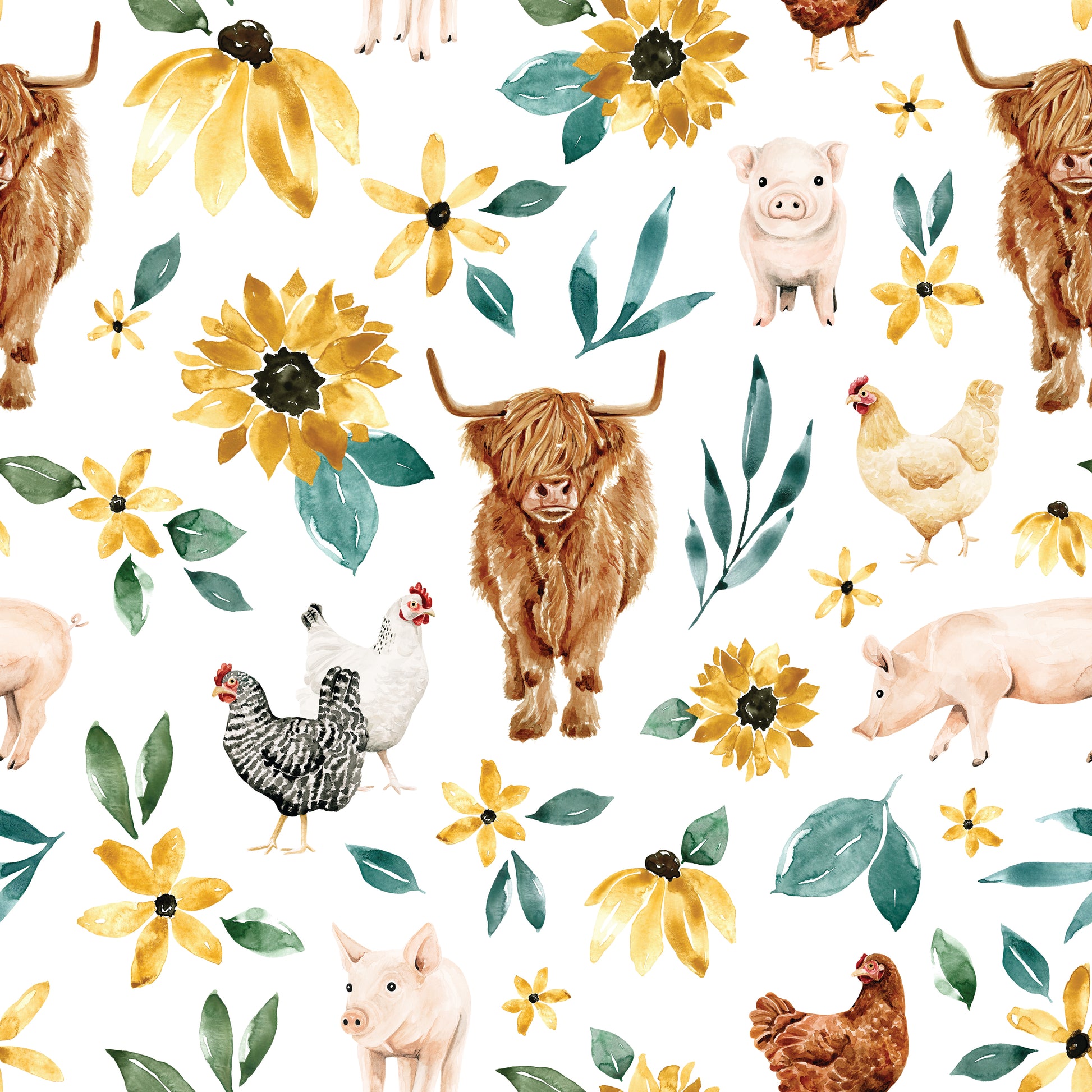 The Maisy Two Piece Butter Jams have the sweetest country design. Highland cows and pink piglets share the stage with the chickens and the daisy's that are sure to make you smile. We trimmed this sleeper in warm marigold cuffs.