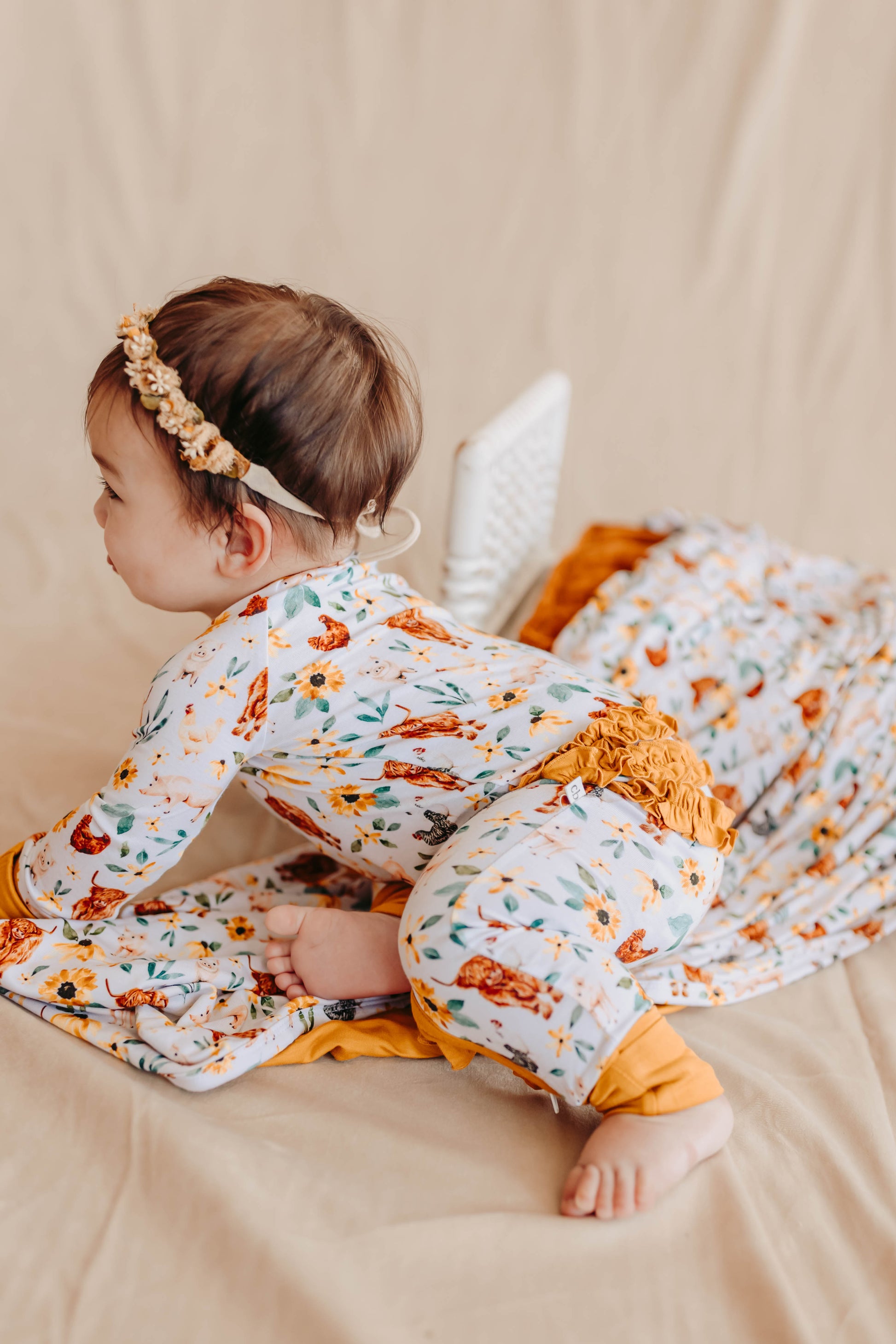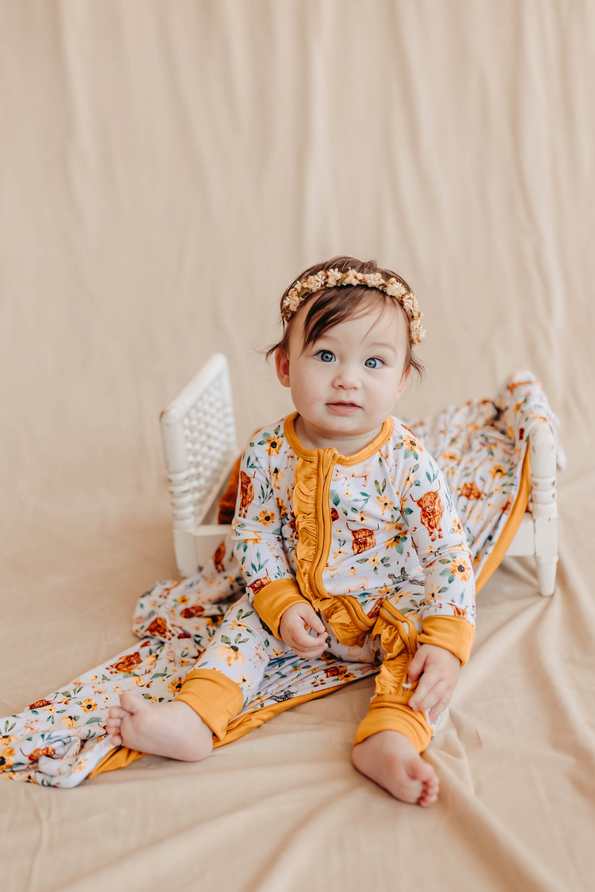 The Maisy Convertible Sleeper is the sweetest country design. Highland cows and pink piglets share the stage with the chickens and the daisy's that are sure to make you smile. We trimmed this sleeper in warm marigold cuffs and ruffles from zipper to tushy.