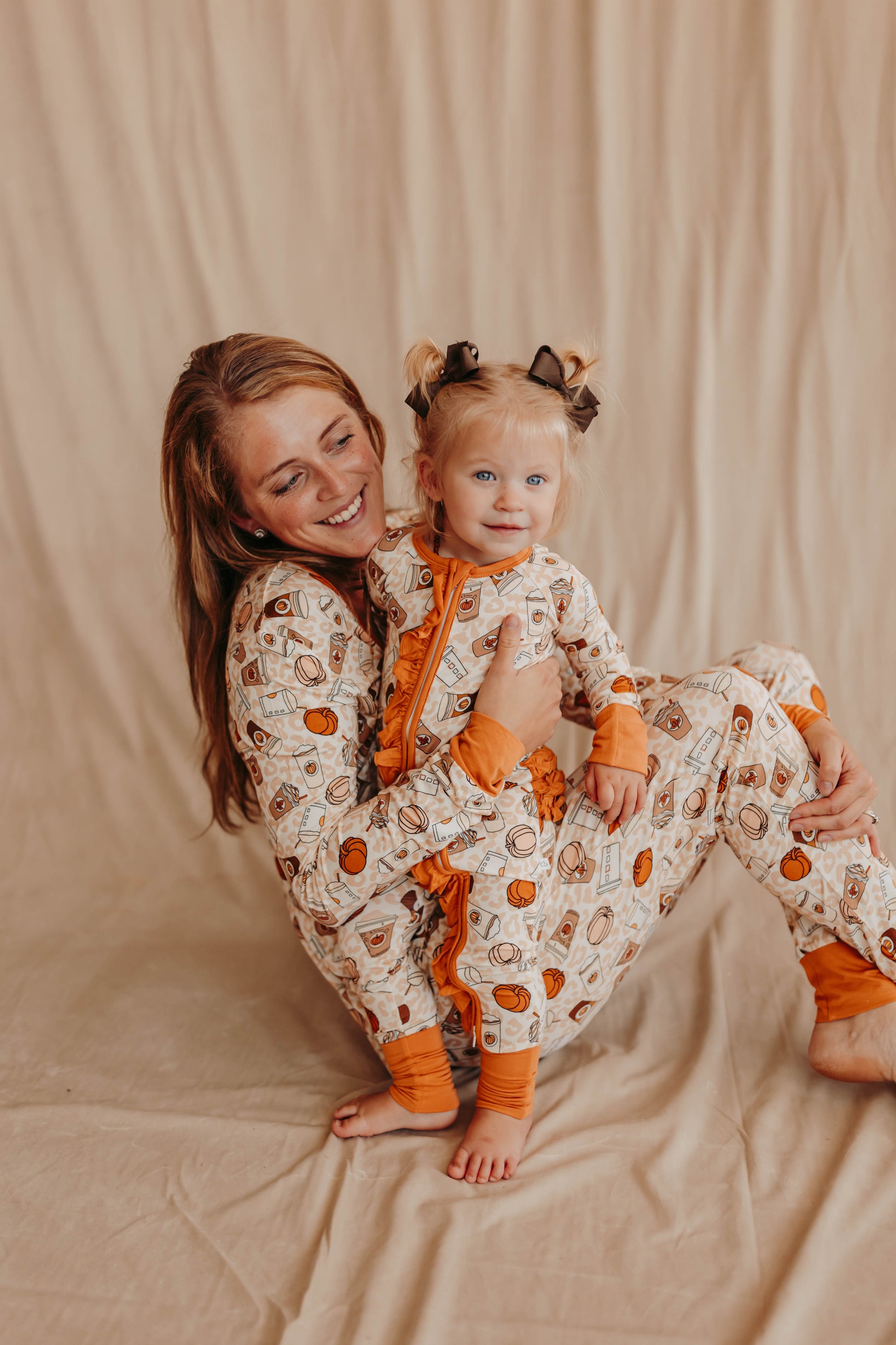 Tumble out of bed and stumble to the kitchen, pour yourself a cup of pumpkin spice ambition in the "Mornin' Pumpkin" design. The neutral tan cheetah print completes the sweet pumpkins and latte's dancing across your babe. We trimmed this pattern with cinnamon flavored cuffs!