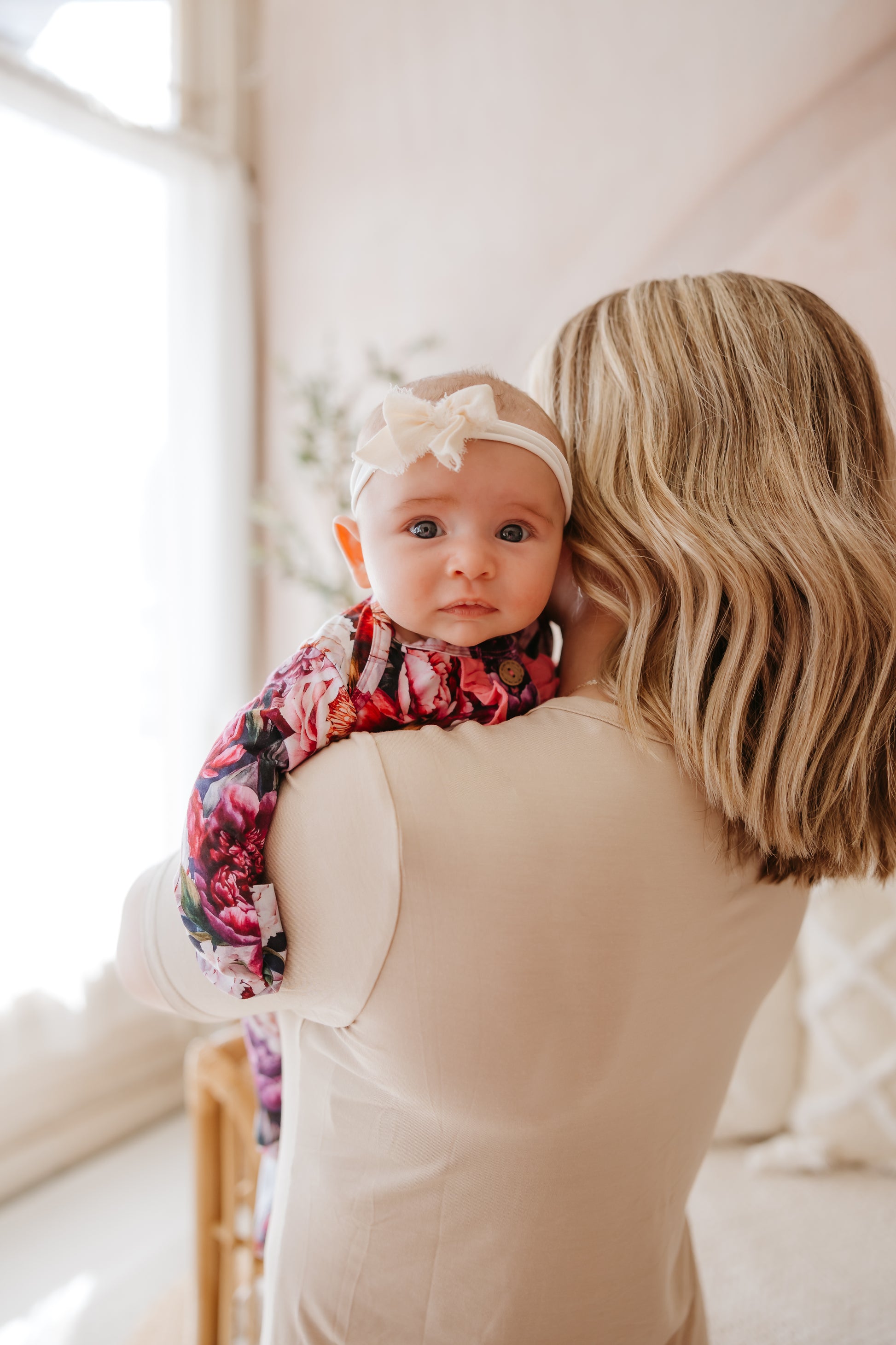 Cuddle Butters Nursery Gowns are perfect for any newborn. Our design is hospital friendly with functional wooden buttons allowing access to baby's chest and shoulders. The open bottom knot design is both adorable and functional for diaper changes or gathering NICU cords. Fold over mitts keep baby safe and warm
