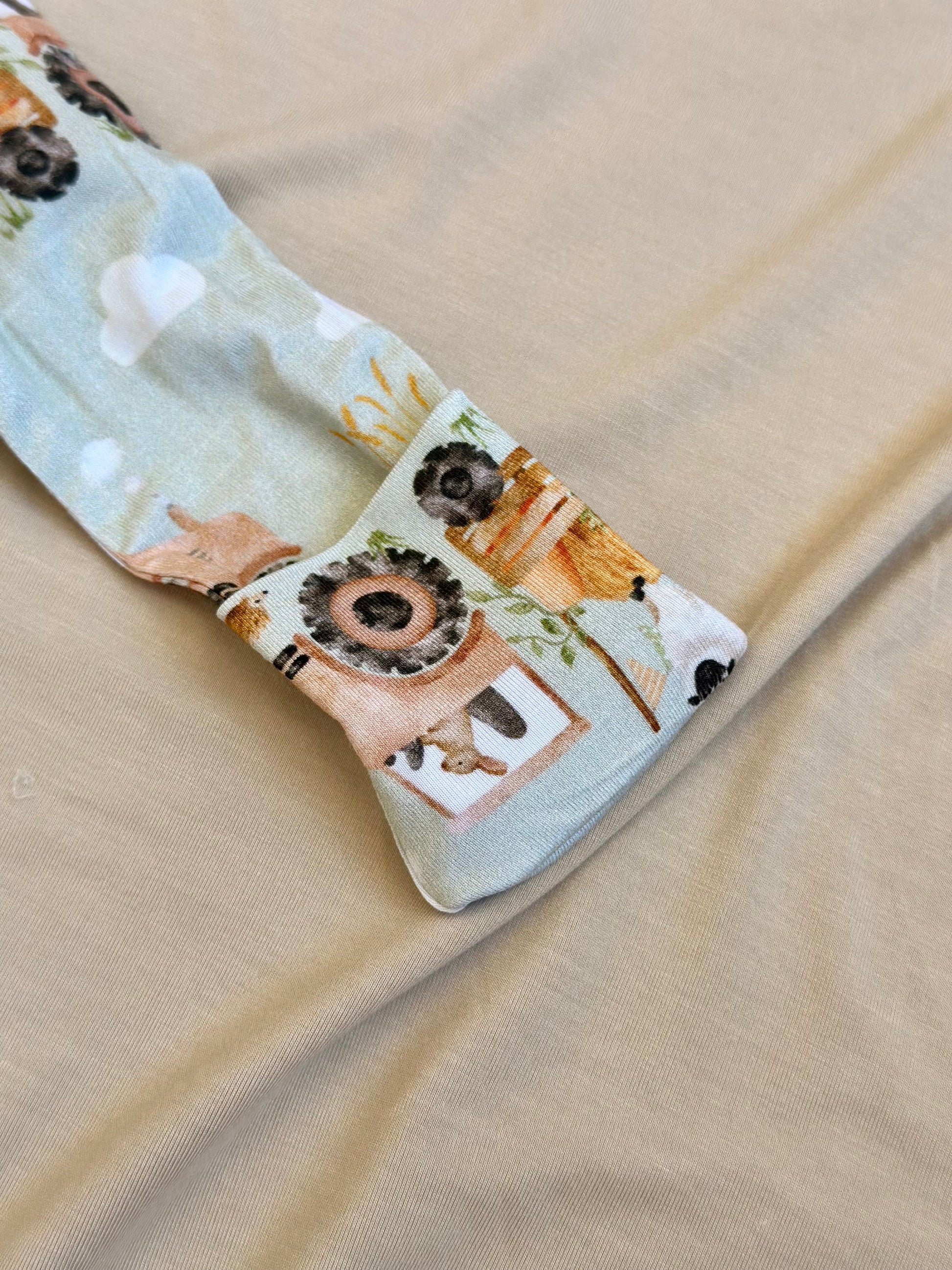 Look out for this driver! "Peter" is in the tractor and his field is filled with friends. Farm animals, crops, and tractors in a beautiful neutral watercolor design fill the "Peter" Nursery Gown.