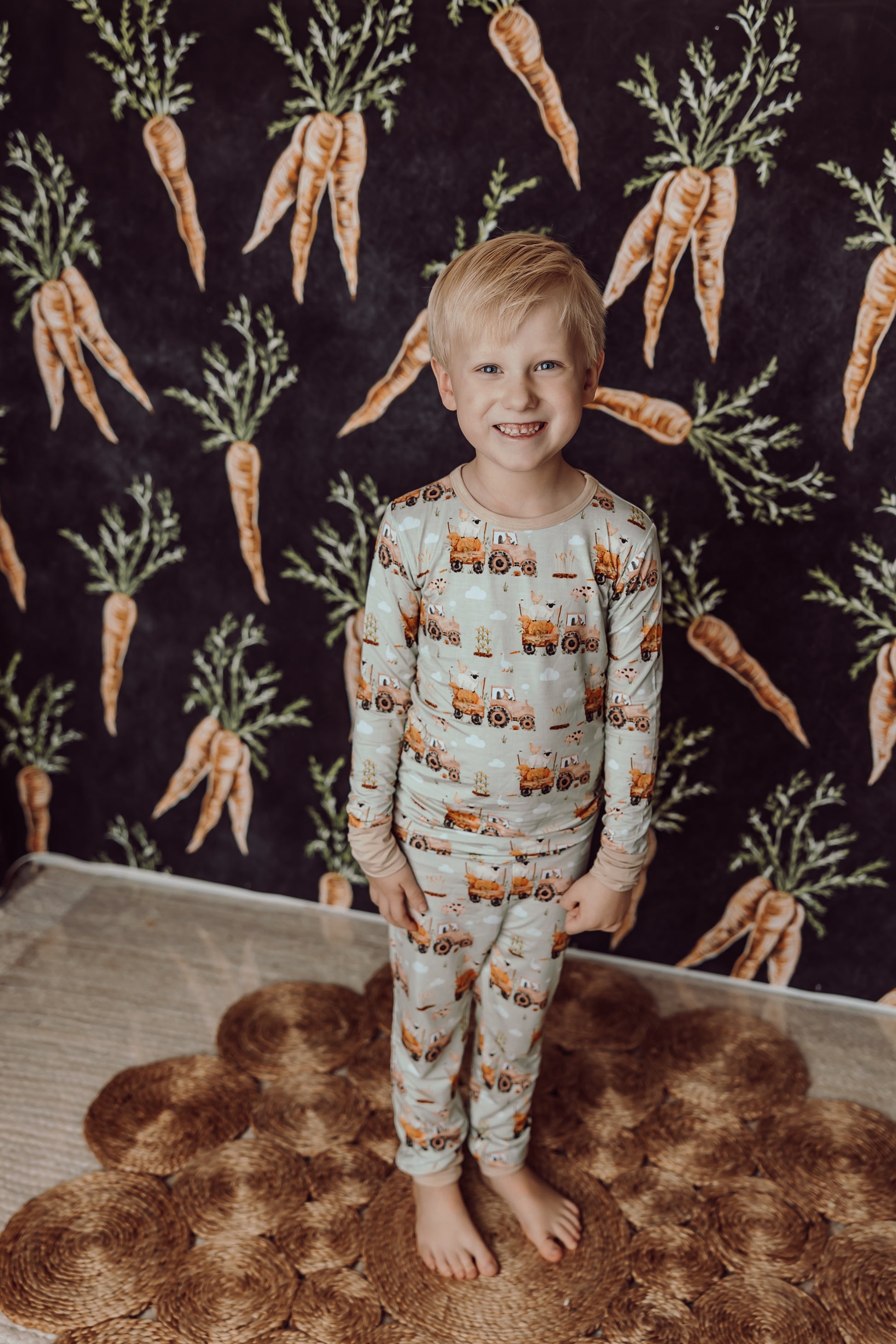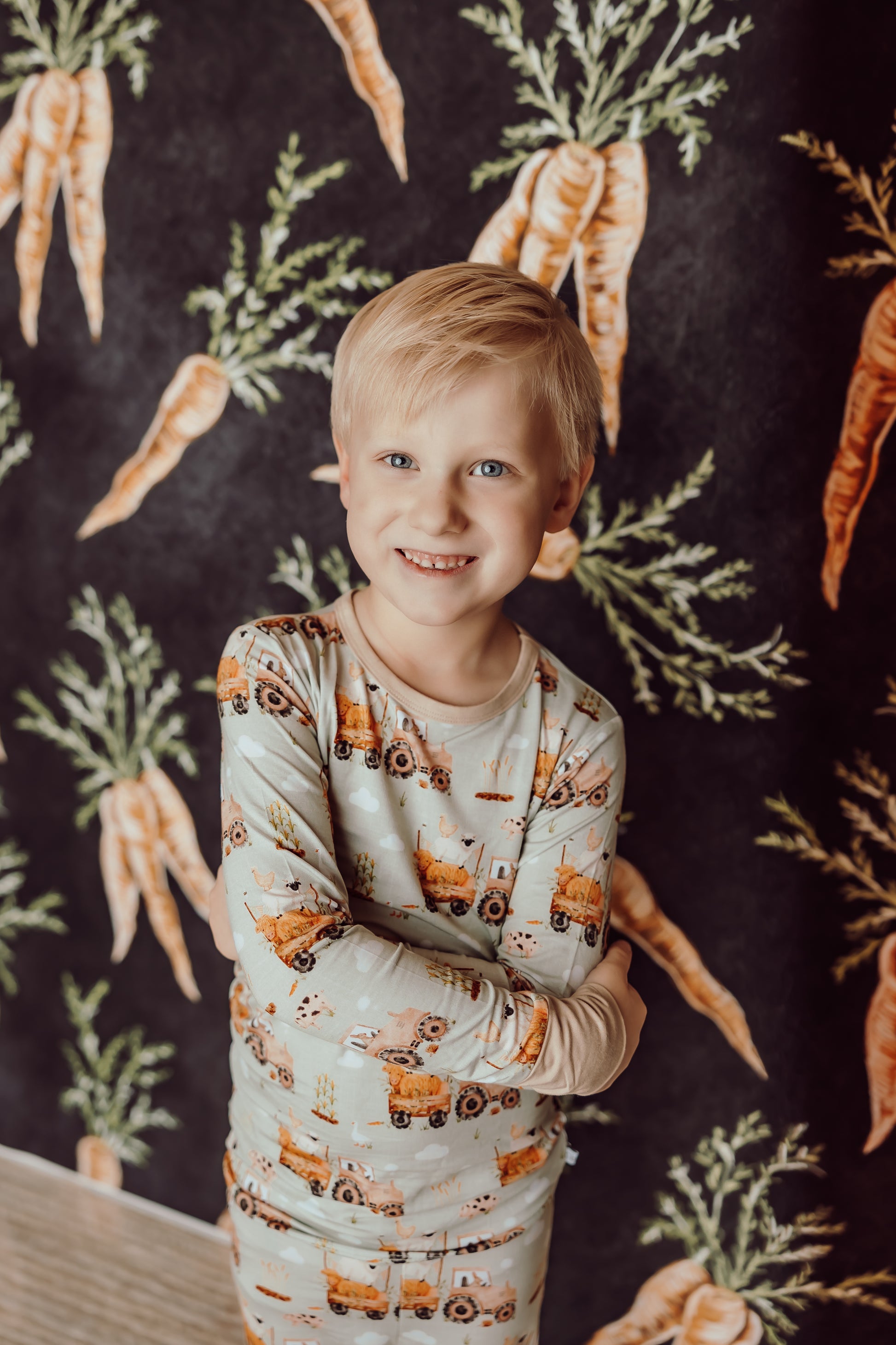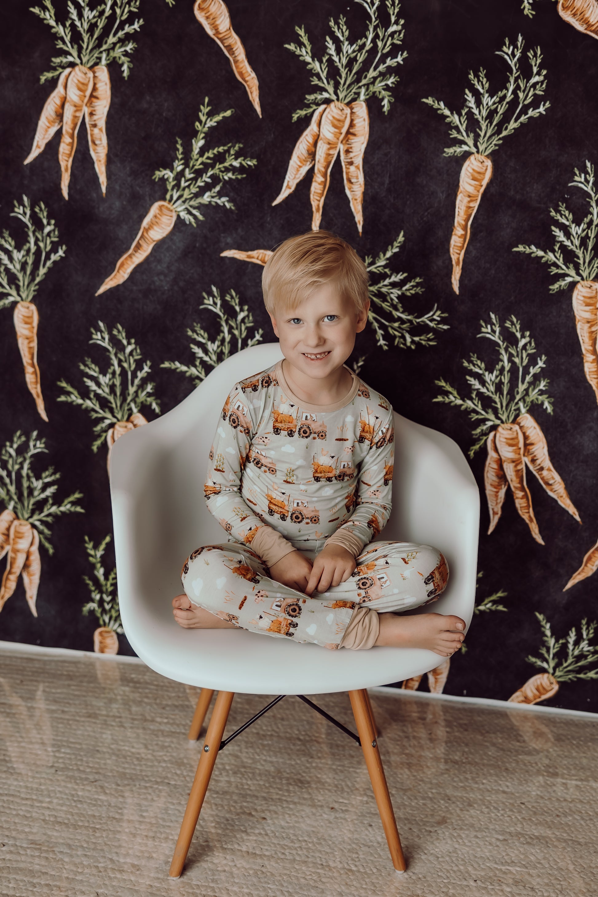 Look out for this driver! "Peter" is in the tractor and his field is filled with friends. Farm animals, crops, and tractors in a beautiful neutral watercolor design fill the "Peter" jams.