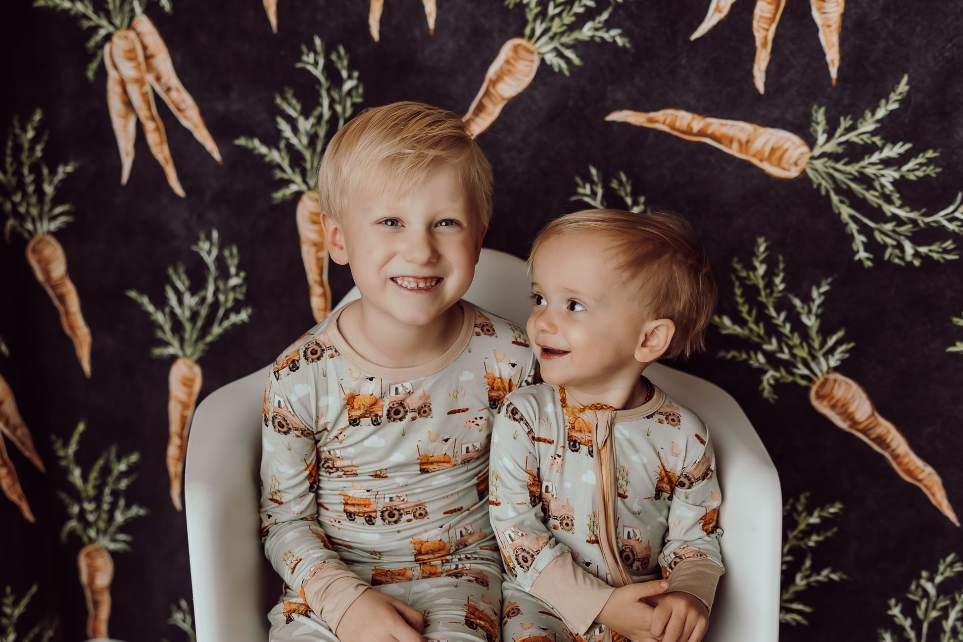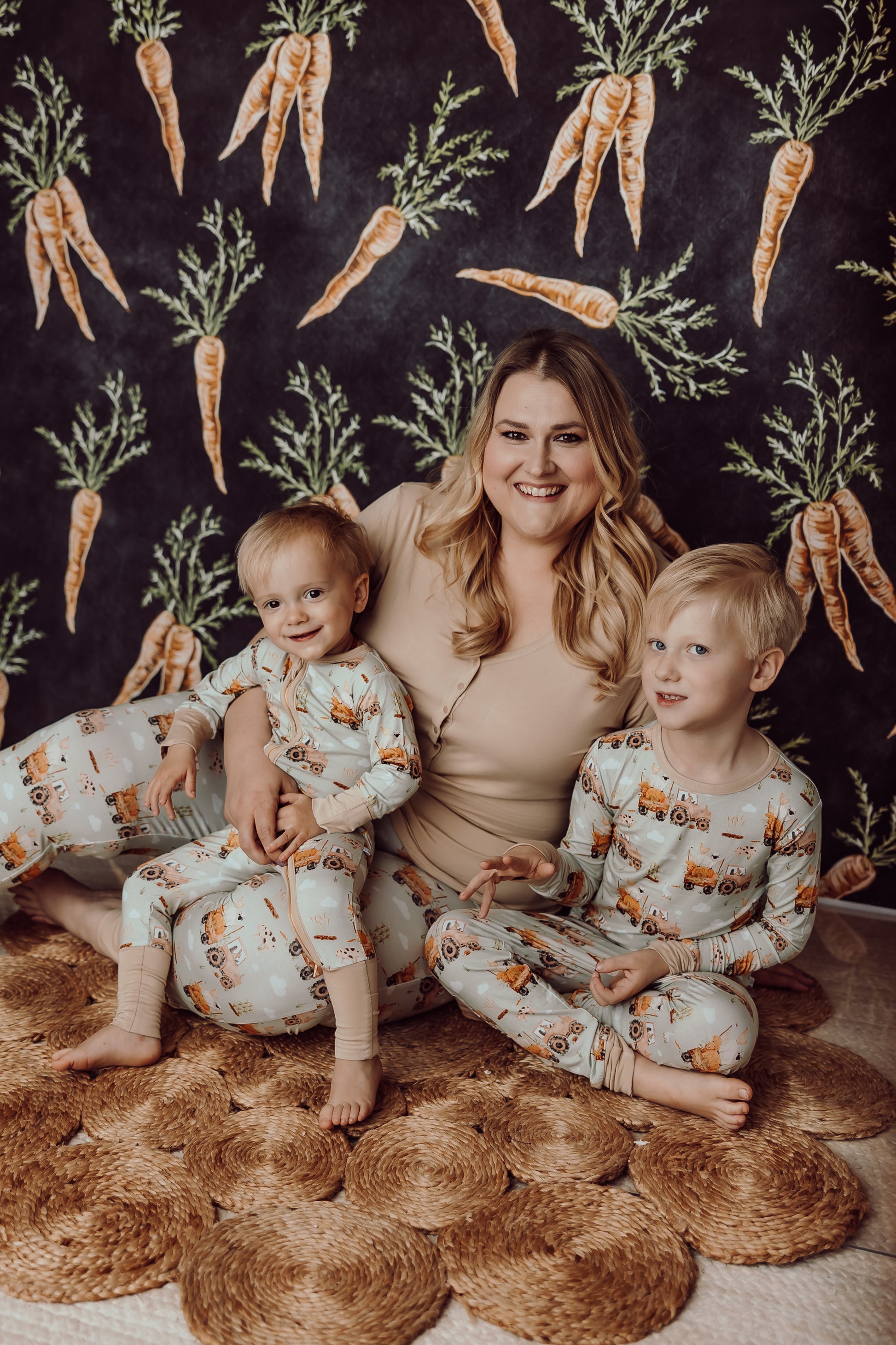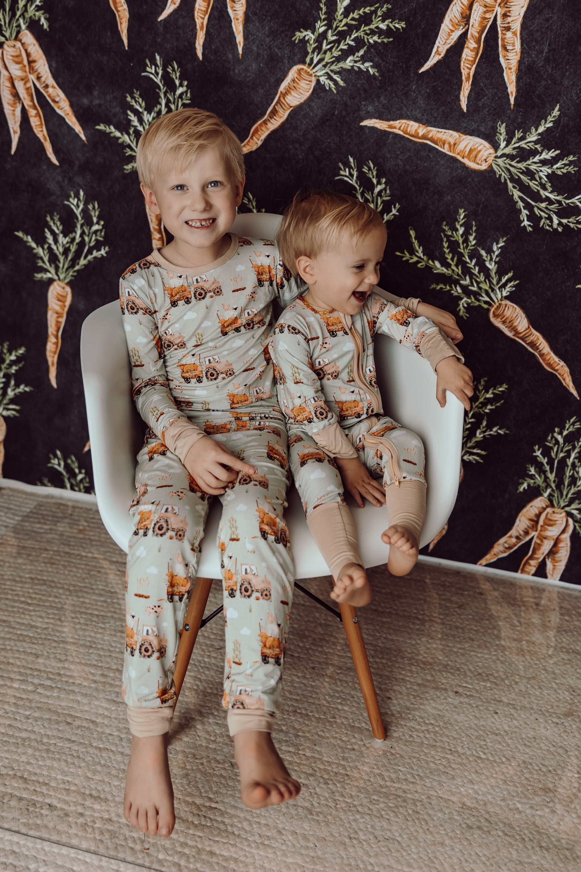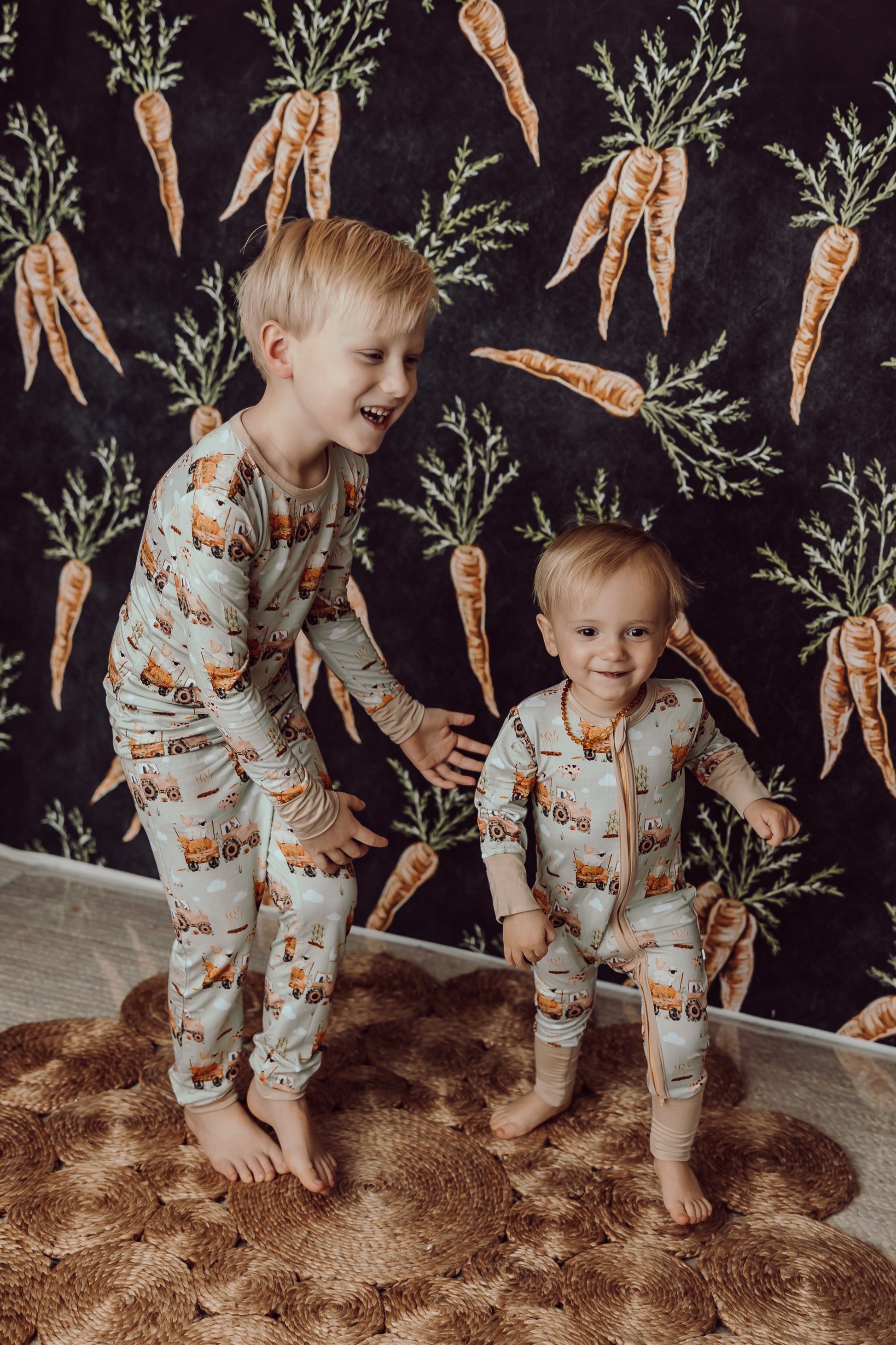 Look out for this driver! "Peter" is in the tractor and his field is filled with friends. Farm animals, crops, and tractors in a beautiful neutral watercolor design fill the "Peter" jams.