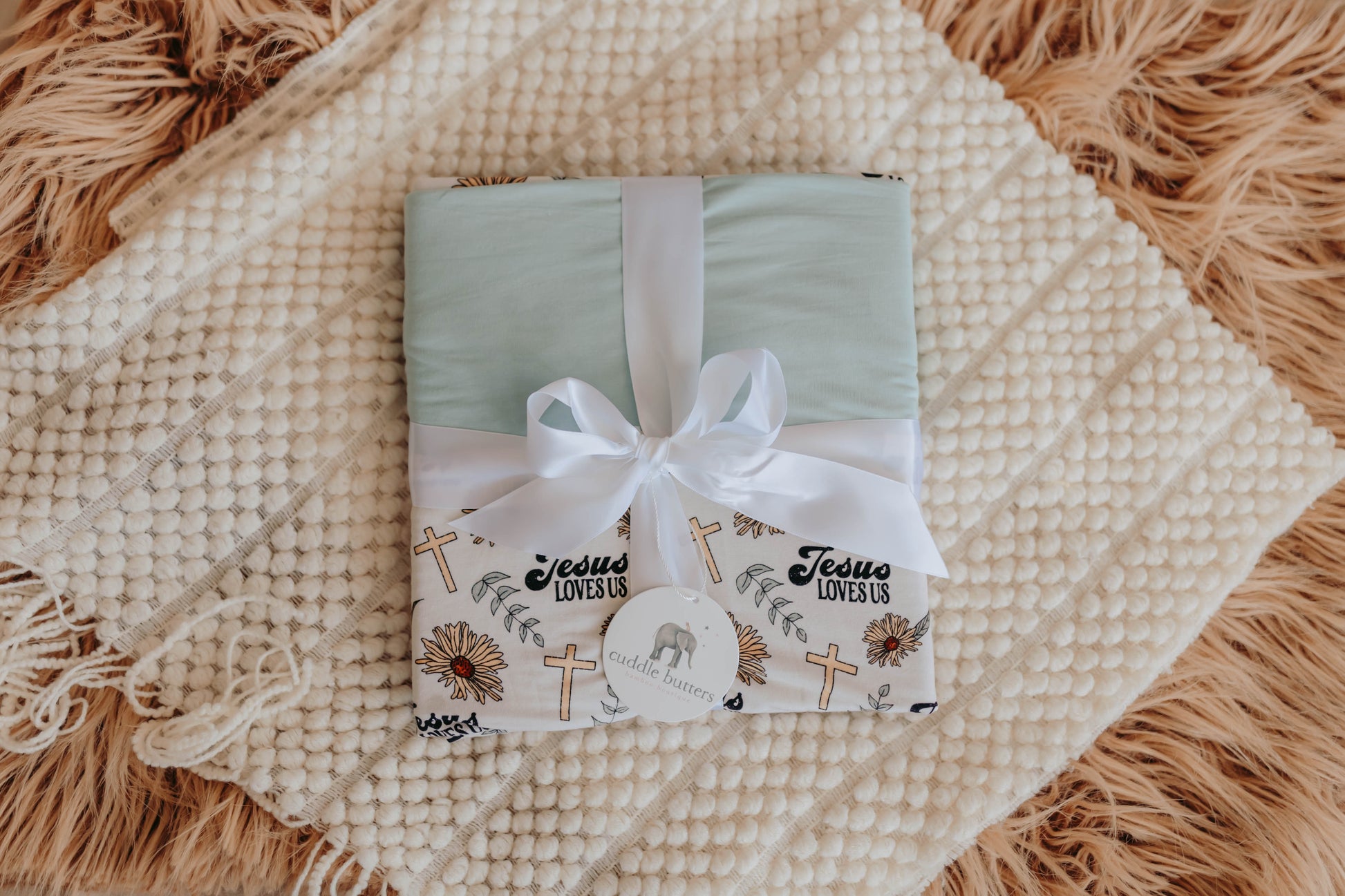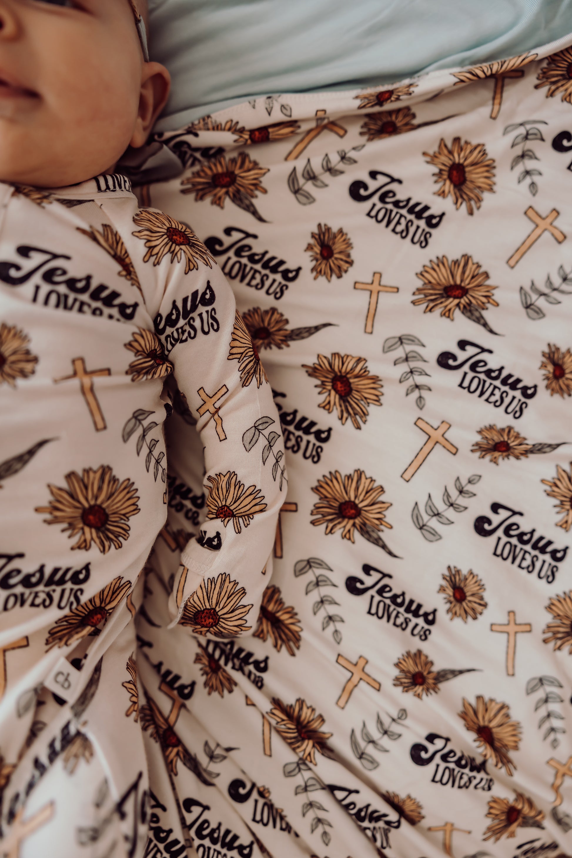 Oh! How he loves us all! The "Rachel" pattern is a beautiful design with daisies, greenery and golden crosses. This pattern is perfect for any little lamb of the King. Trimmed in blue the "Rachel" is soft and sweet.