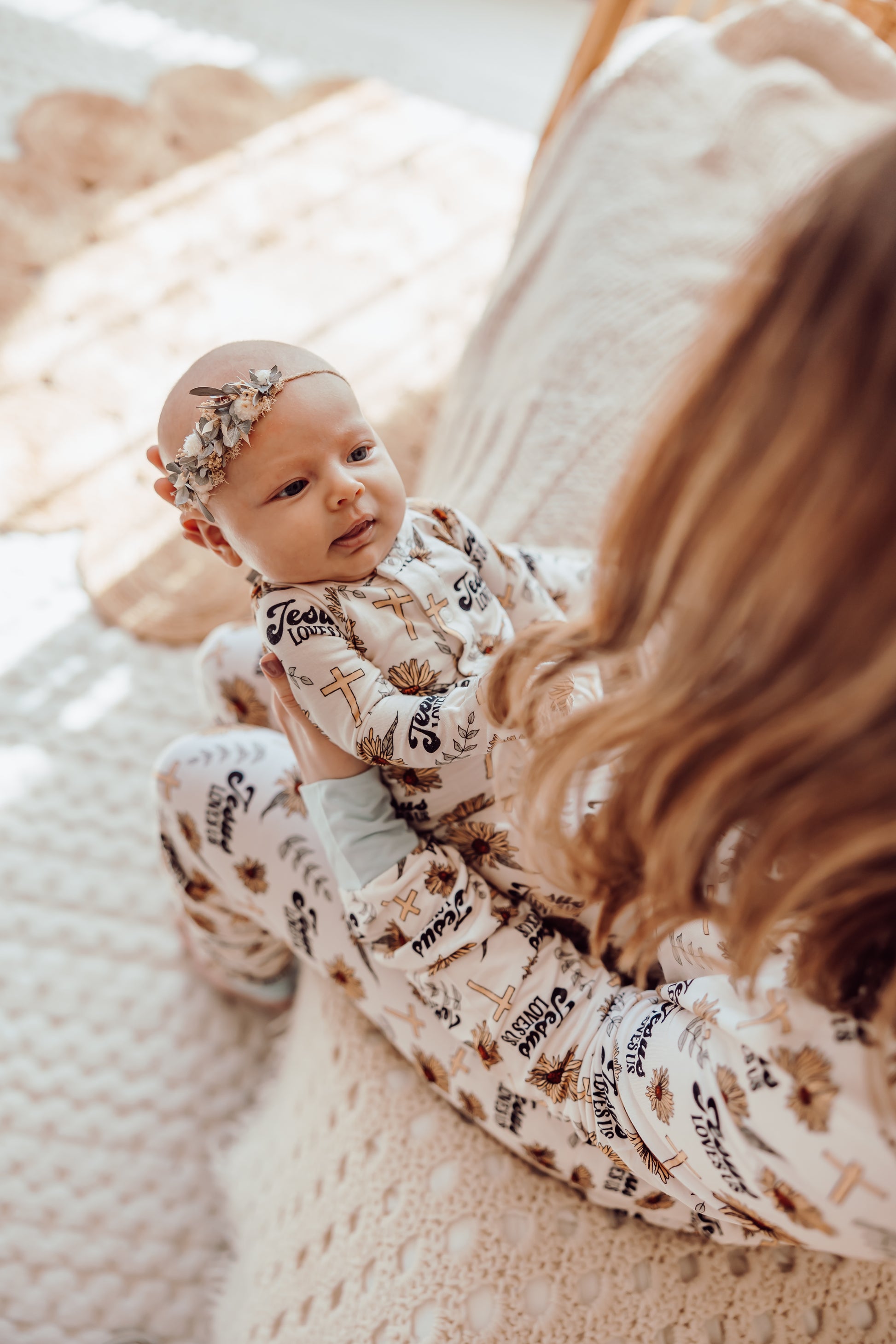Oh! How he loves us all! The "Rachel" pattern is a beautiful design with daisies, greenery and golden crosses. This pattern is perfect for any little lamb of the King. Trimmed in blue the "Rachel" is soft and sweet.