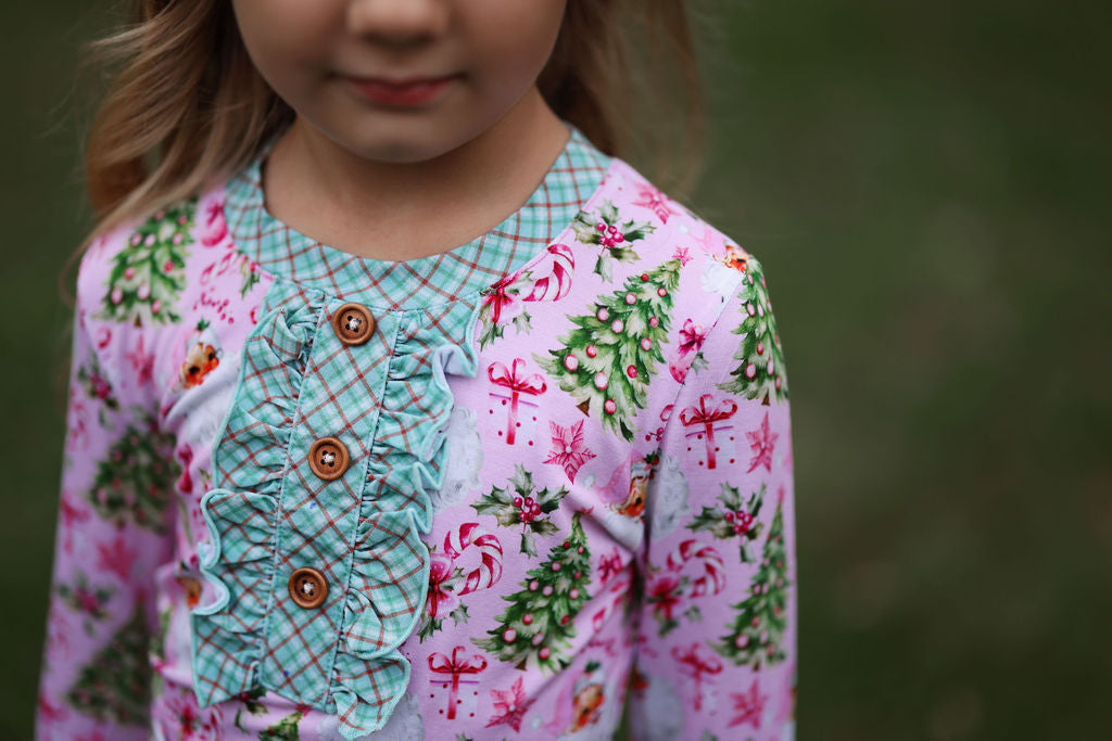 “Rosy Cheeks” is the most beautiful vintage Santa in the perfect pink with bright green trees, gifts and candy canes. Trimmed in “McCallister Plaid” with ruffles galore!