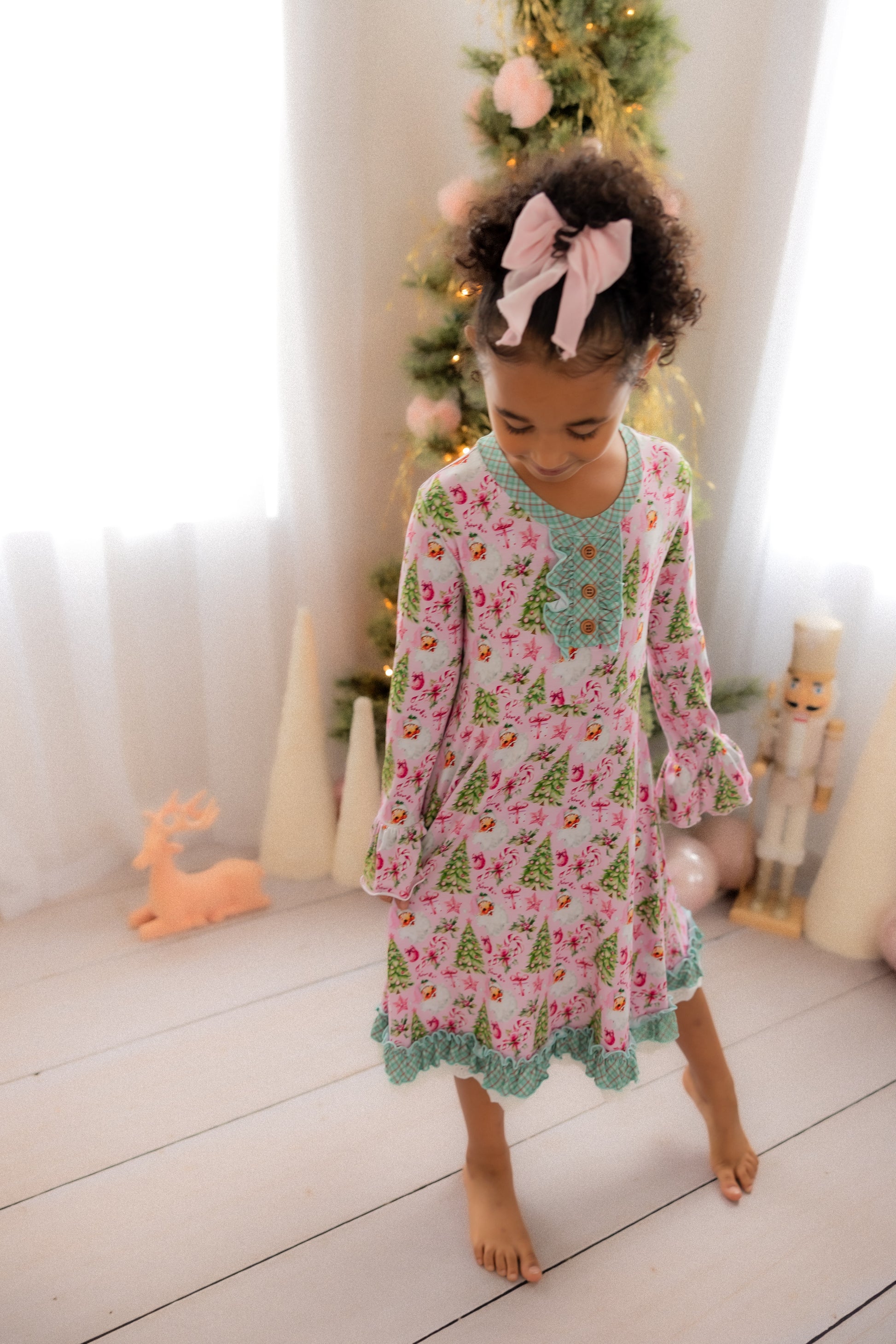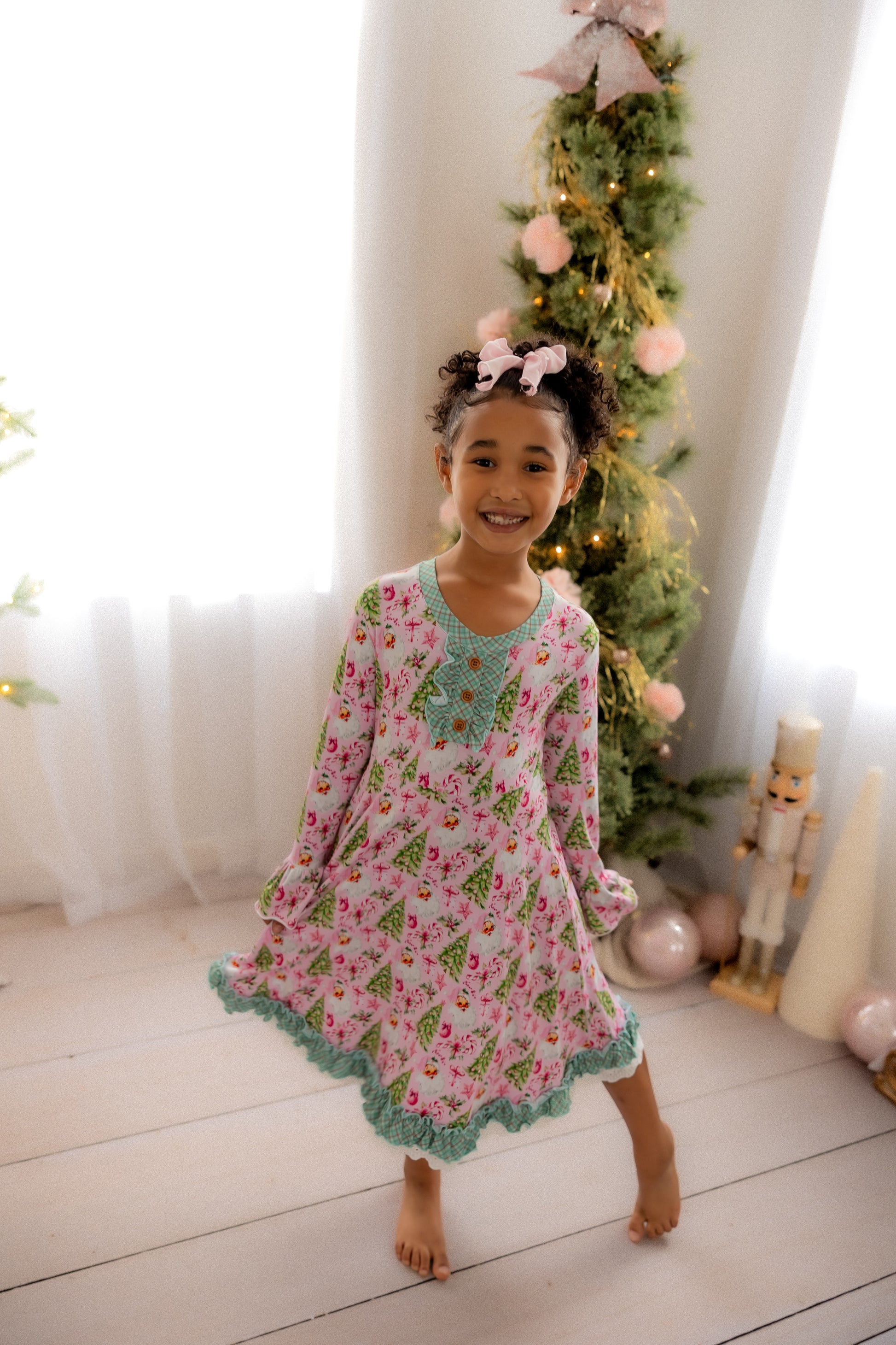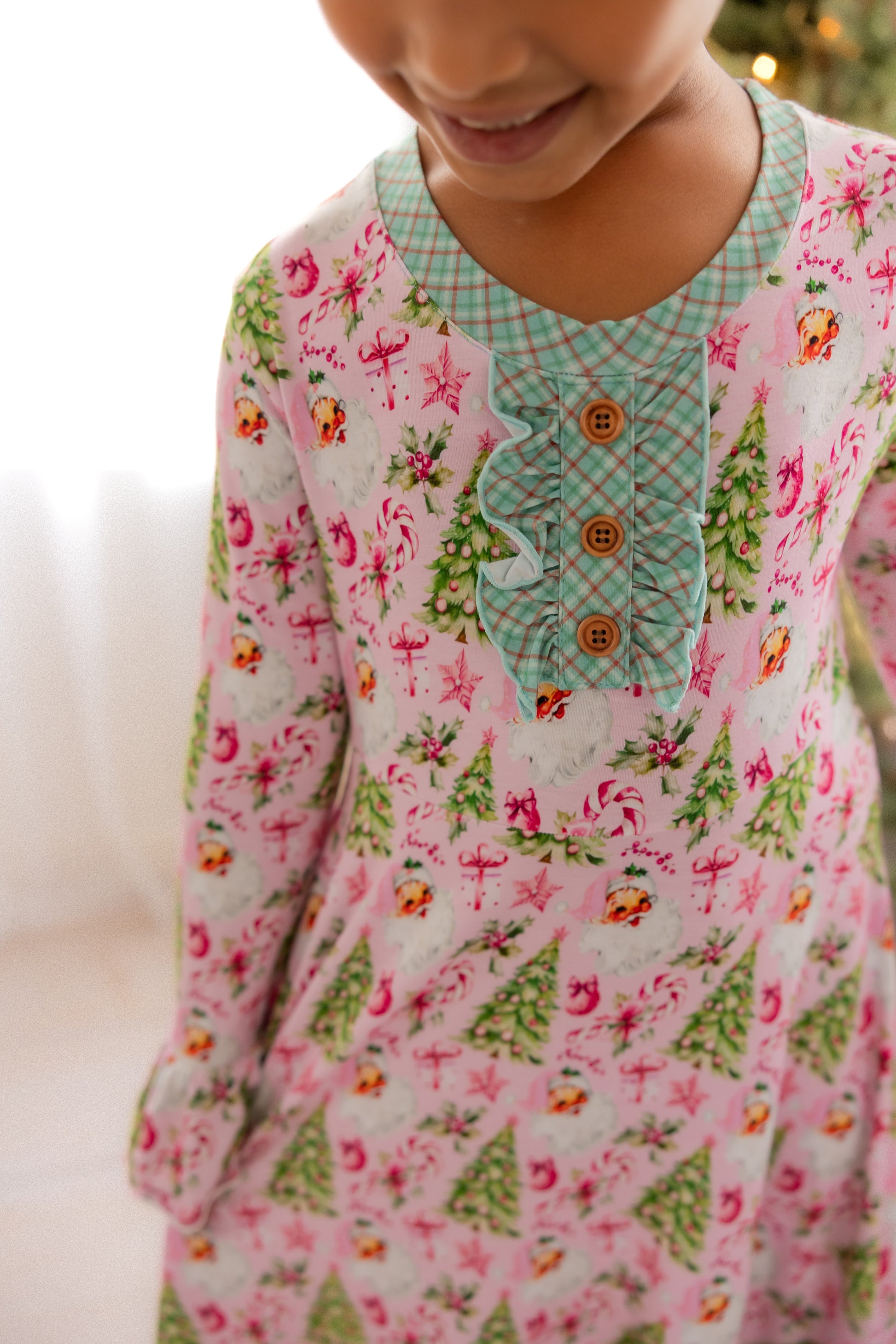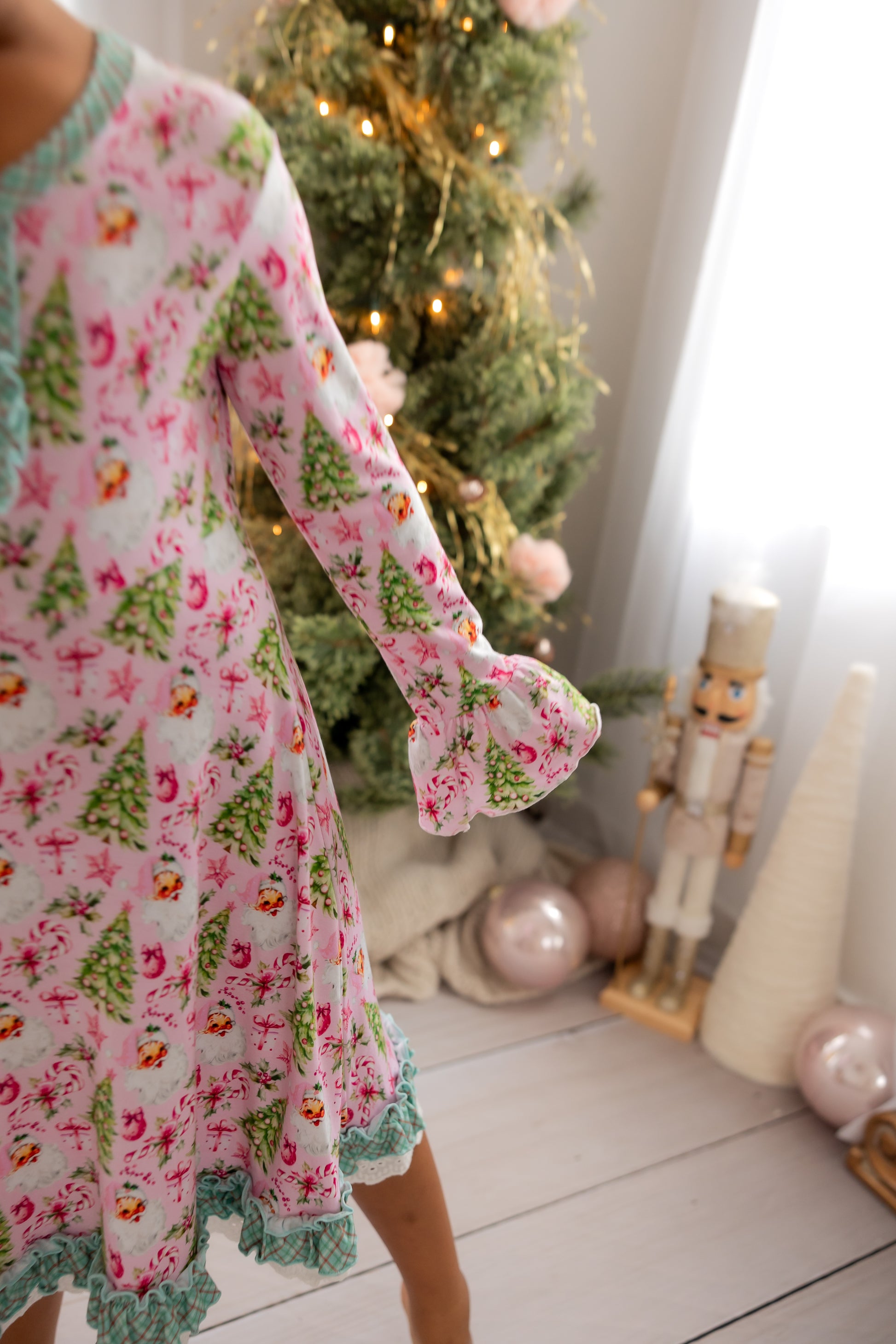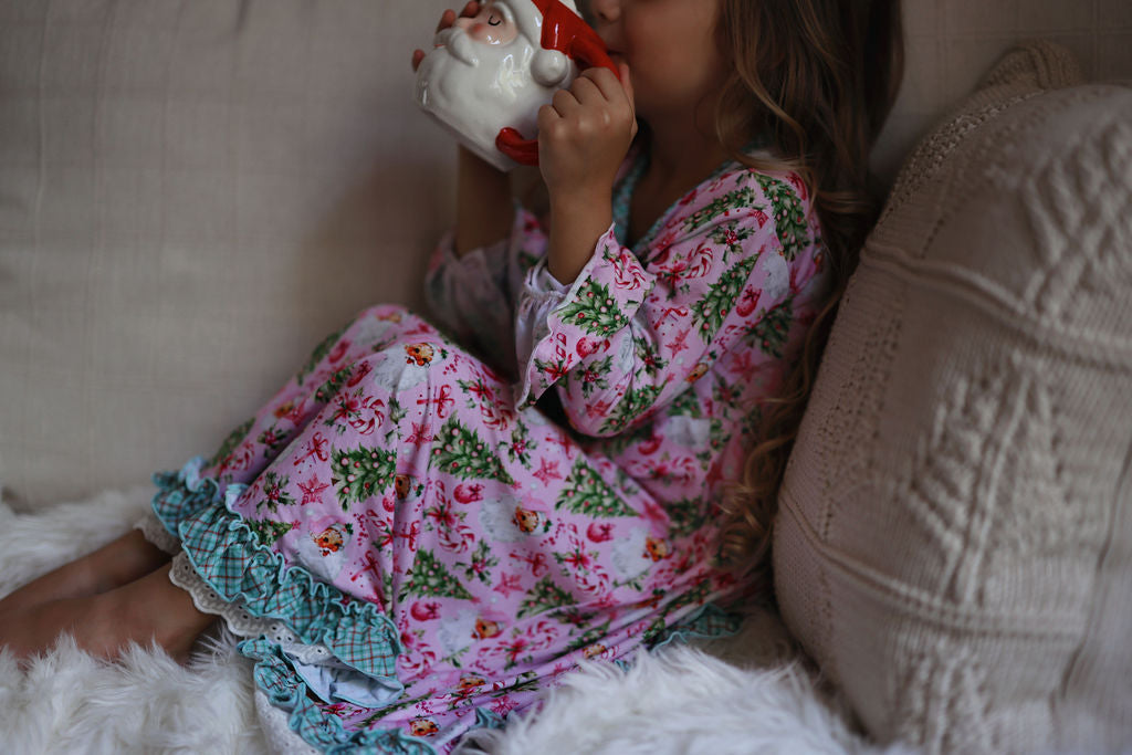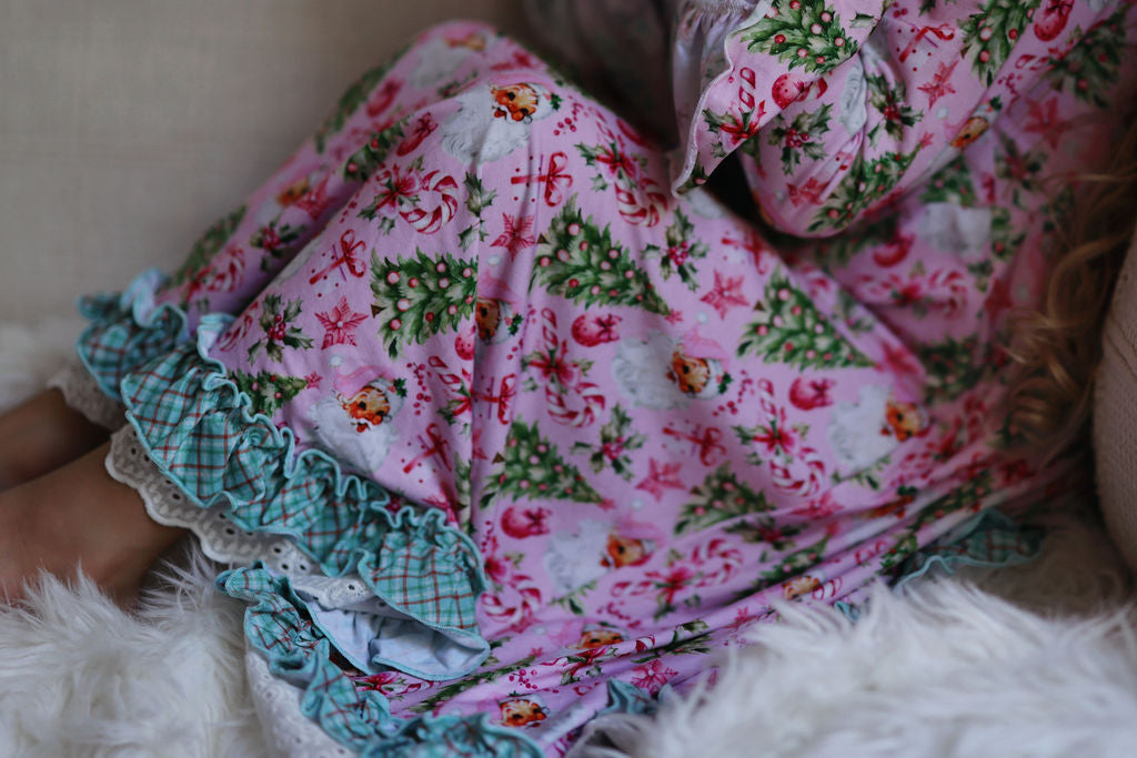 “Rosy Cheeks” is the most beautiful vintage Santa in the perfect pink with bright green trees, gifts and candy canes. Trimmed in “McCallister Plaid” with ruffles galore!