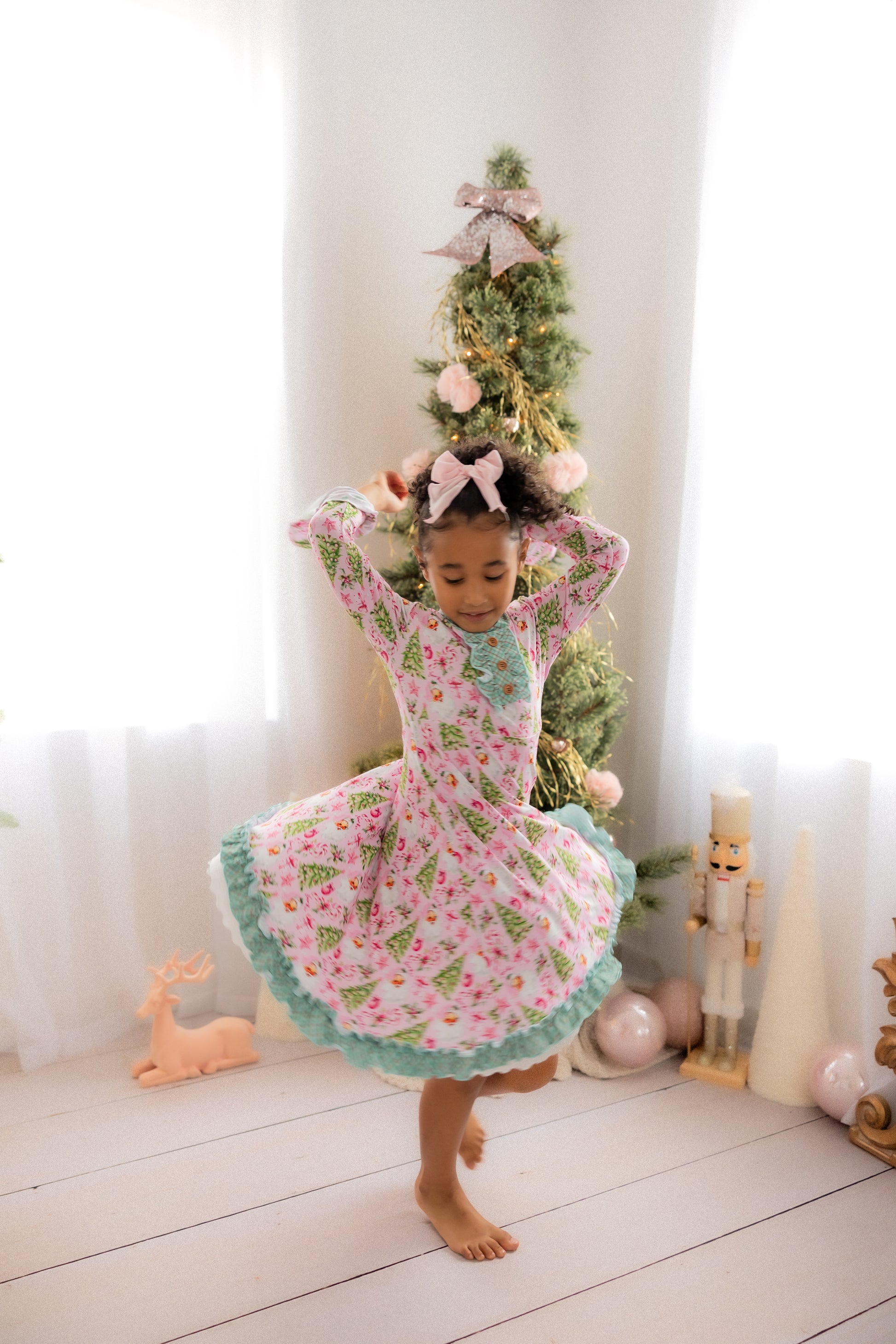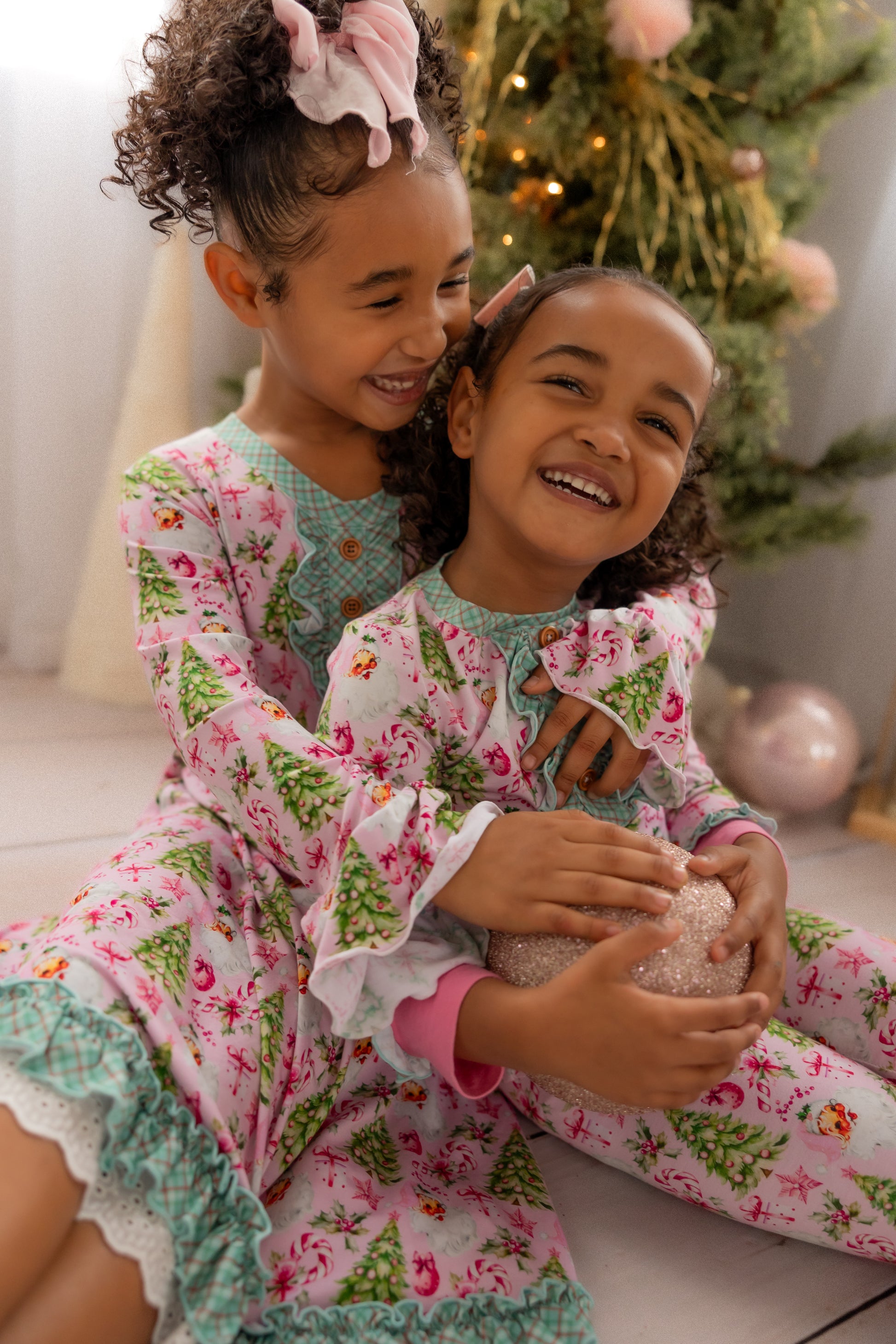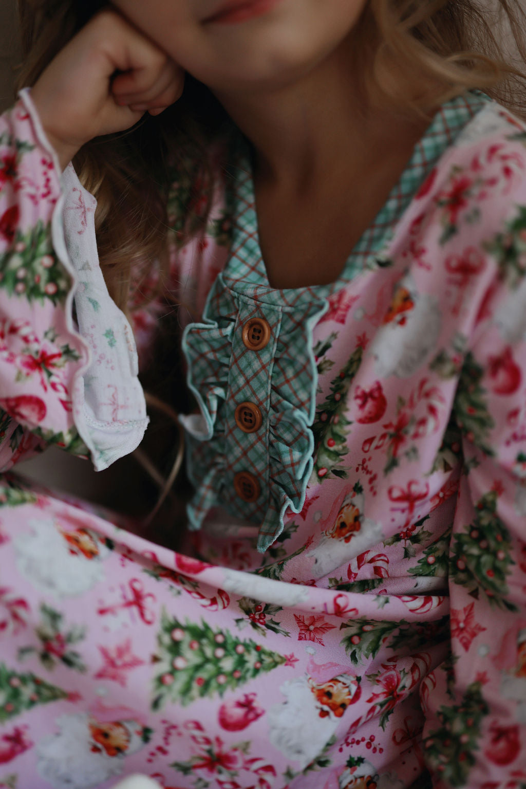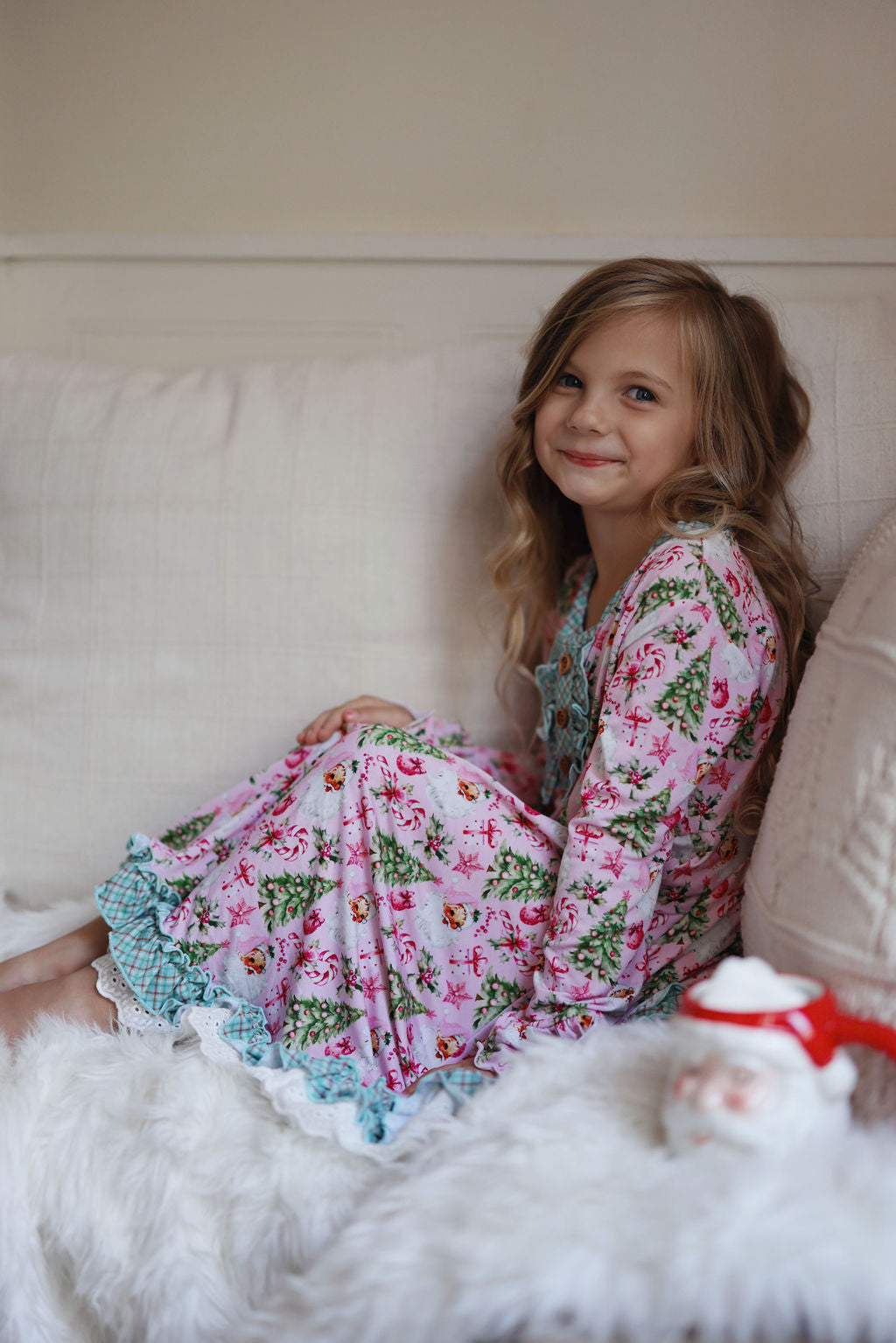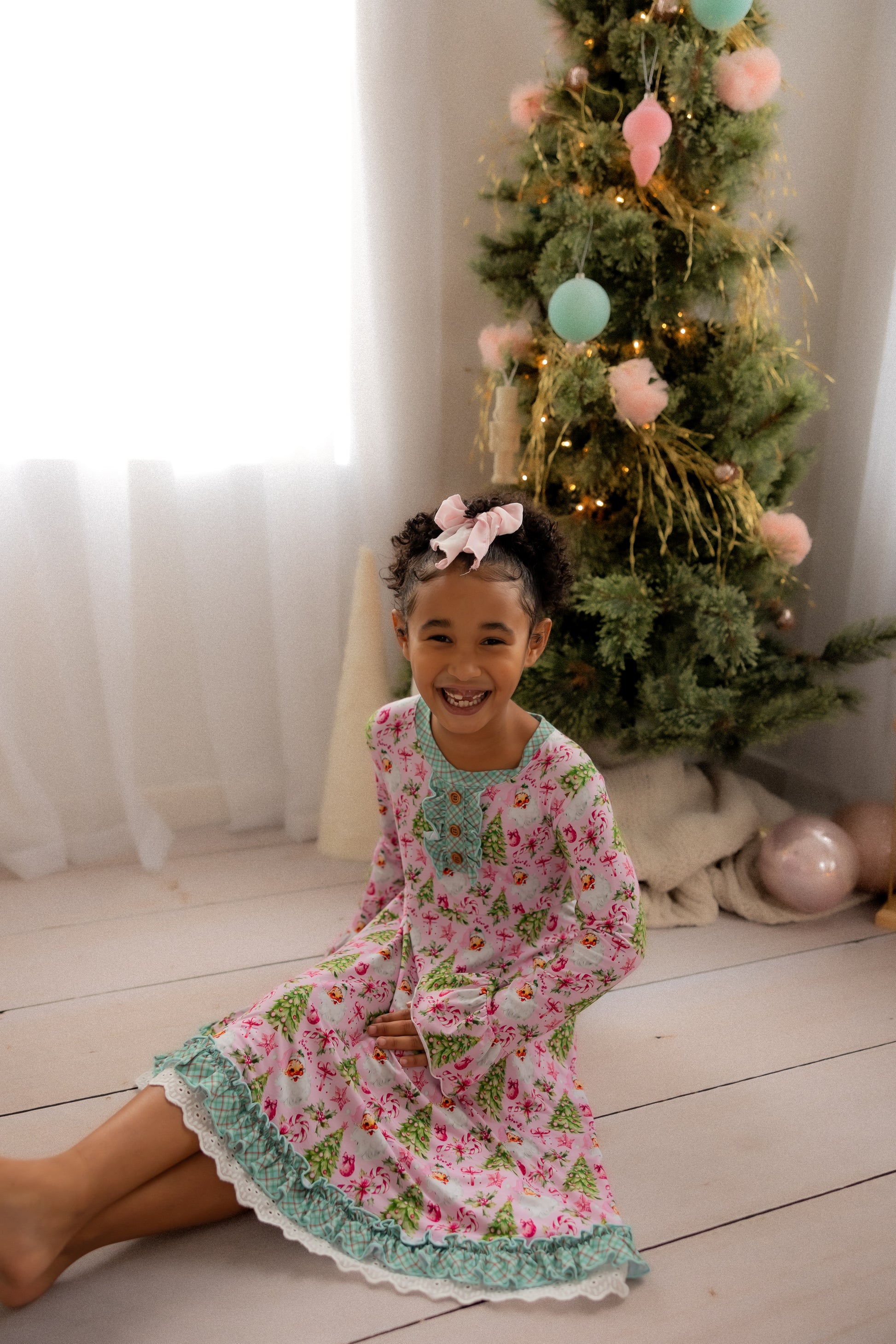 “Rosy Cheeks” is the most beautiful vintage Santa in the perfect pink with bright green trees, gifts and candy canes. Trimmed in “McCallister Plaid” with ruffles galore!