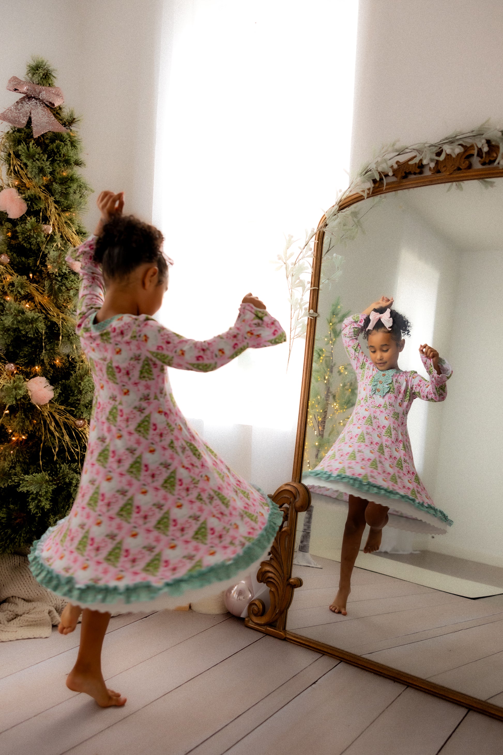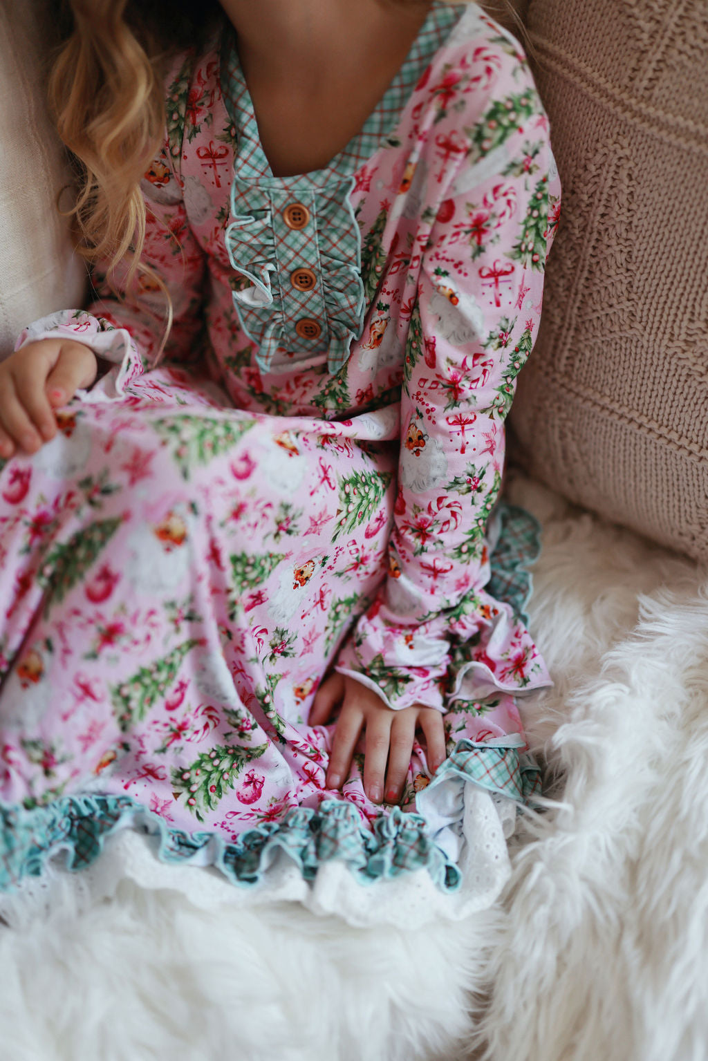 Day-to-Night Gowns- This dress twirls by day and snuggles so perfectly at night. Long sleeve dress is trimmed in bell ruffles, Chest is adorned with beautiful ruffle trim around 3 wooden buttons. The bottom of the skirt is ruffled to the max with 2 layers of both white eyelet and color trim. Your little girl will feel like the ultimate holiday princess!