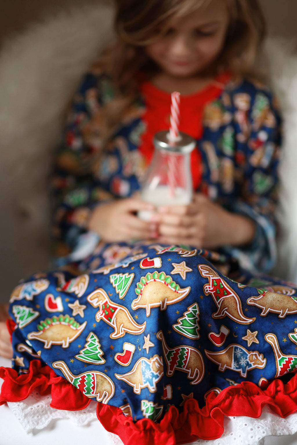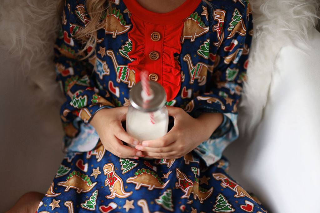 Snackosaurus - "One more snack? One more drink?" sounds a lot sweeter when your little one is decked out in these adorable dino treats. T-Rex and his friends are gingerbread cookies on a beautiful rich navy background with deep red trim.
