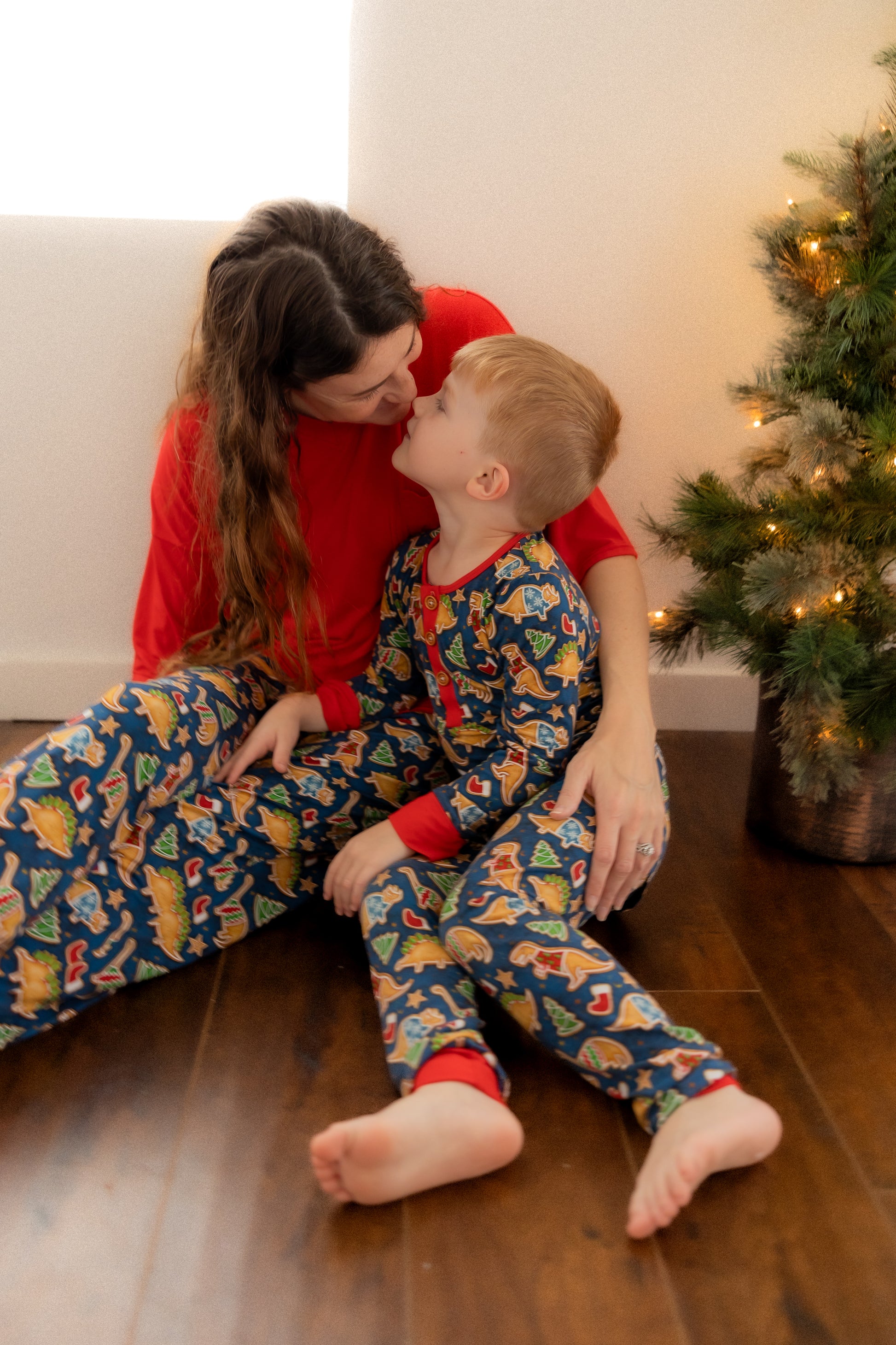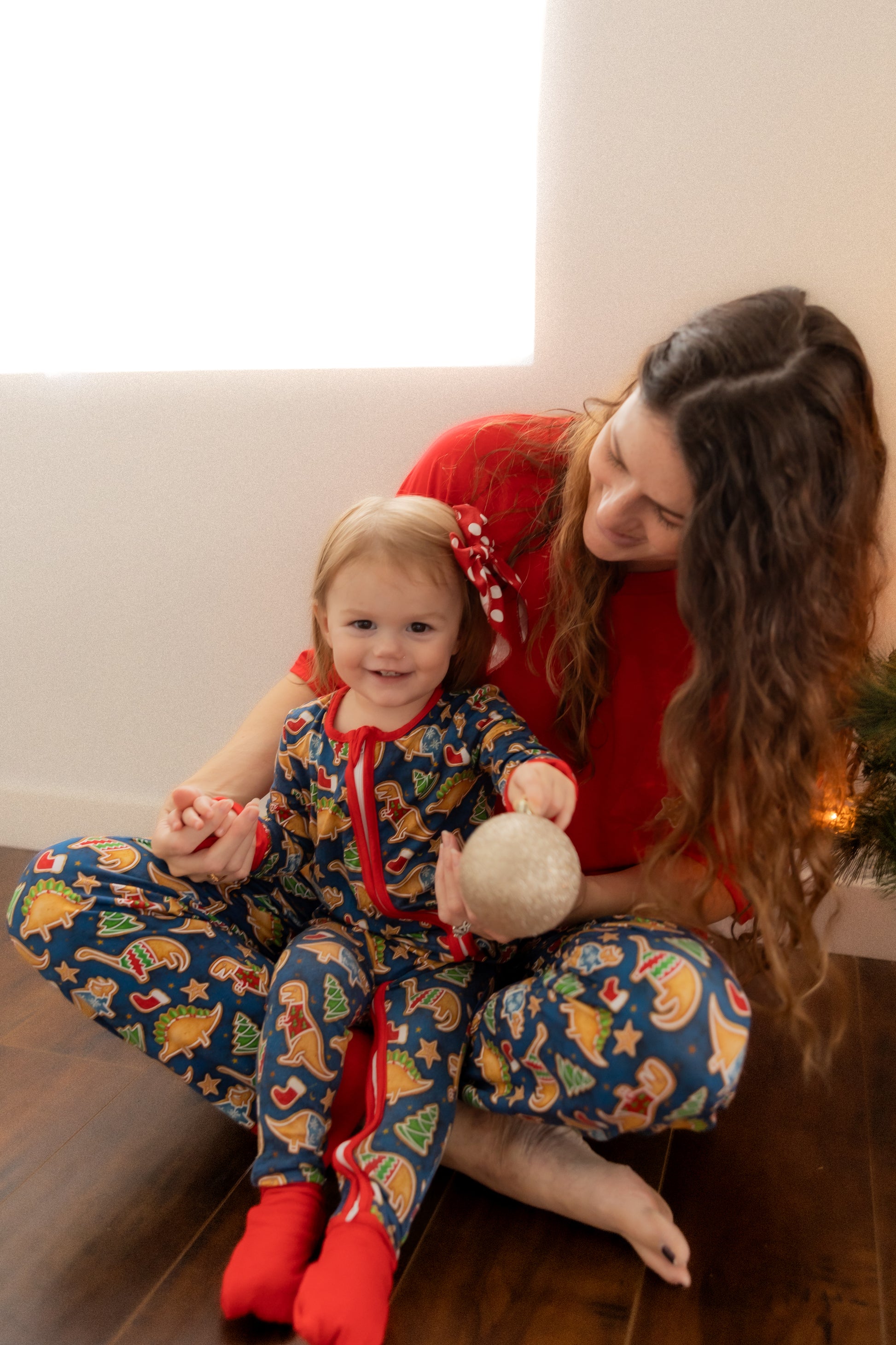 Snackosaurus - "One more snack? One more drink?" sounds a lot sweeter when your little one is decked out in these adorable dino treats. T-Rex and his friends are gingerbread cookies on a beautiful rich navy background with deep red trim.
