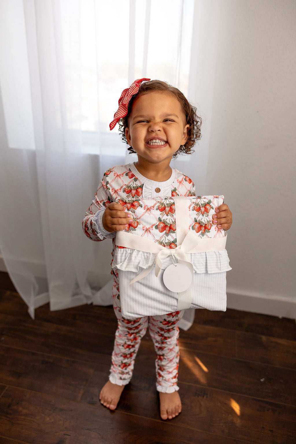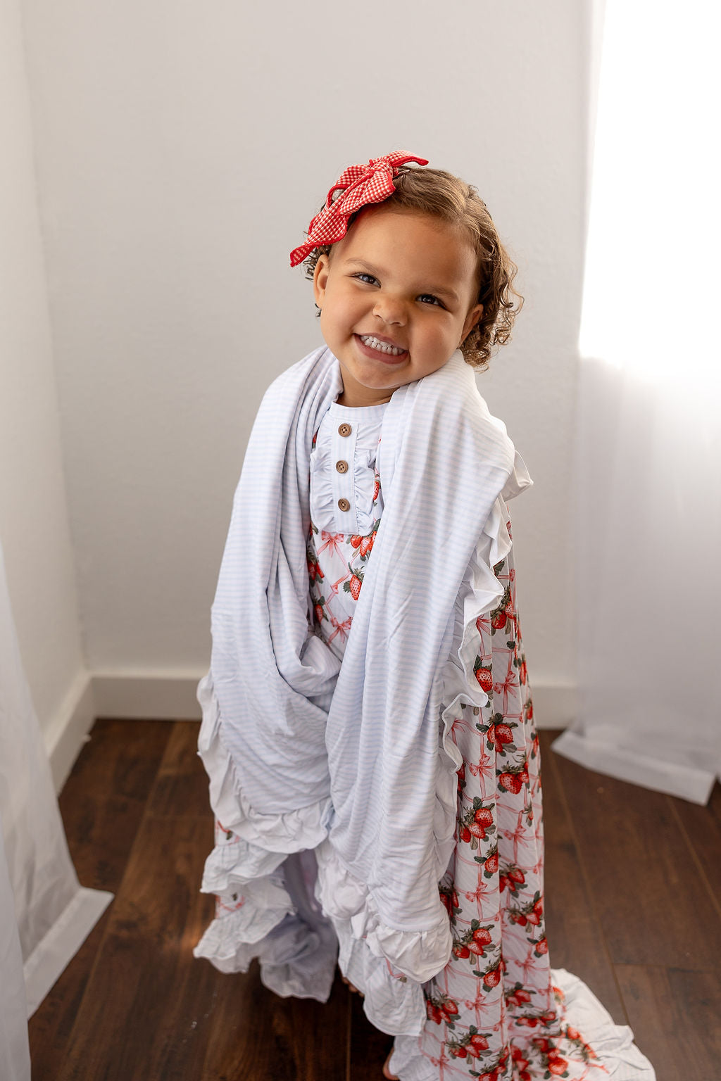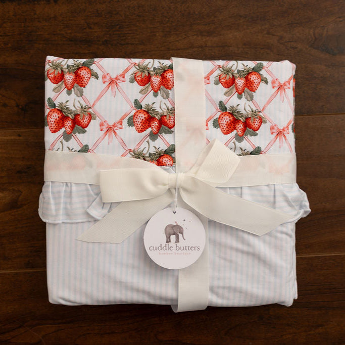 Features the delightful "Bella Berry" print with hand-painted berries with blush ribbon sashes on a soft blue stripe background.