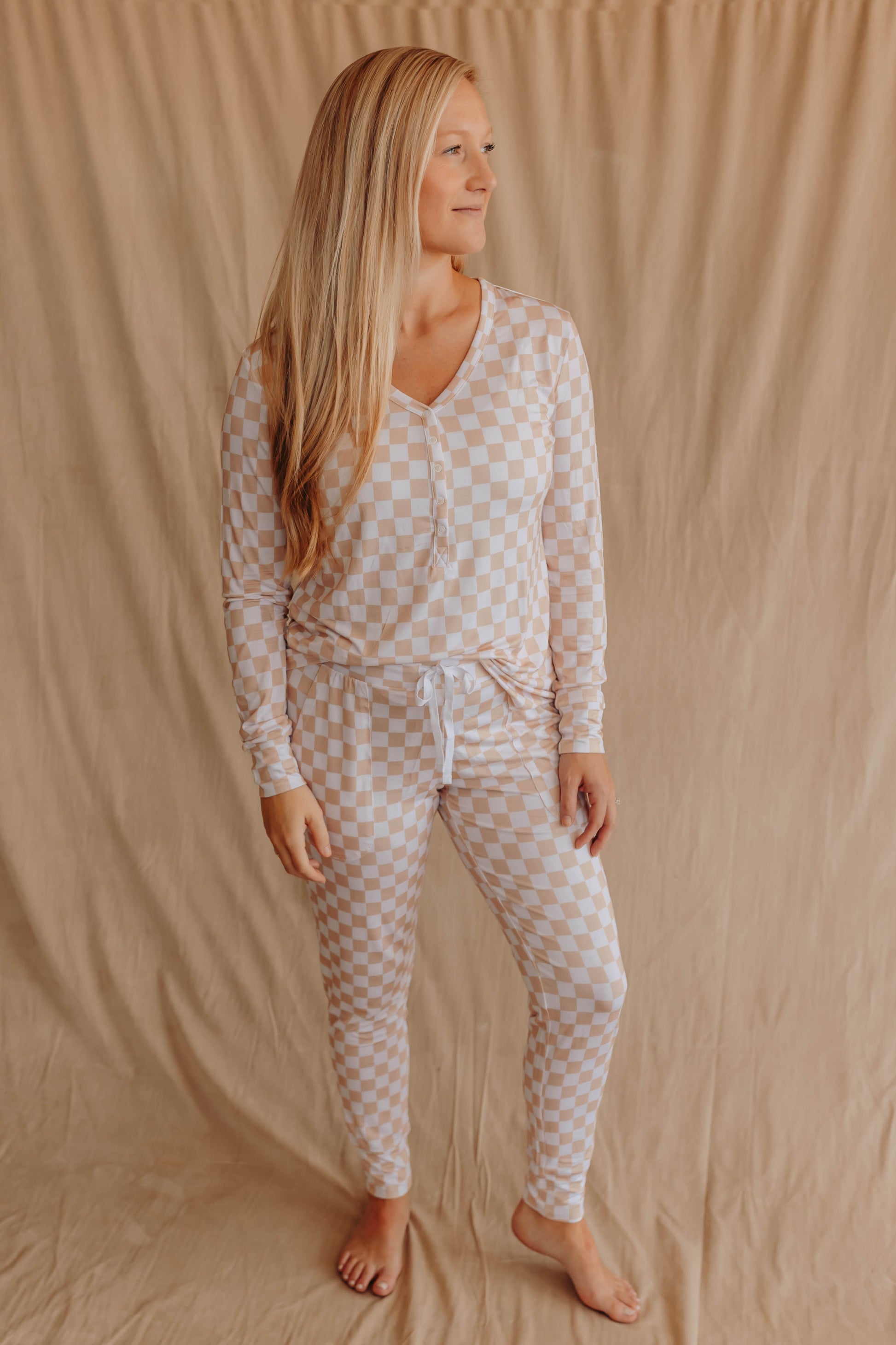 Women's Butter Jams are the softest, most buttery pajamas you have ever slept in. The top features functional snaps on the chest for nursing or pumping in those midnight hours. The jogger bottoms have a functional drawstring and a tapered leg with a comfortable ankle cuff. These are perfect for photos, or general loungewear comfort. We won't judge you if you want to wear them all day.