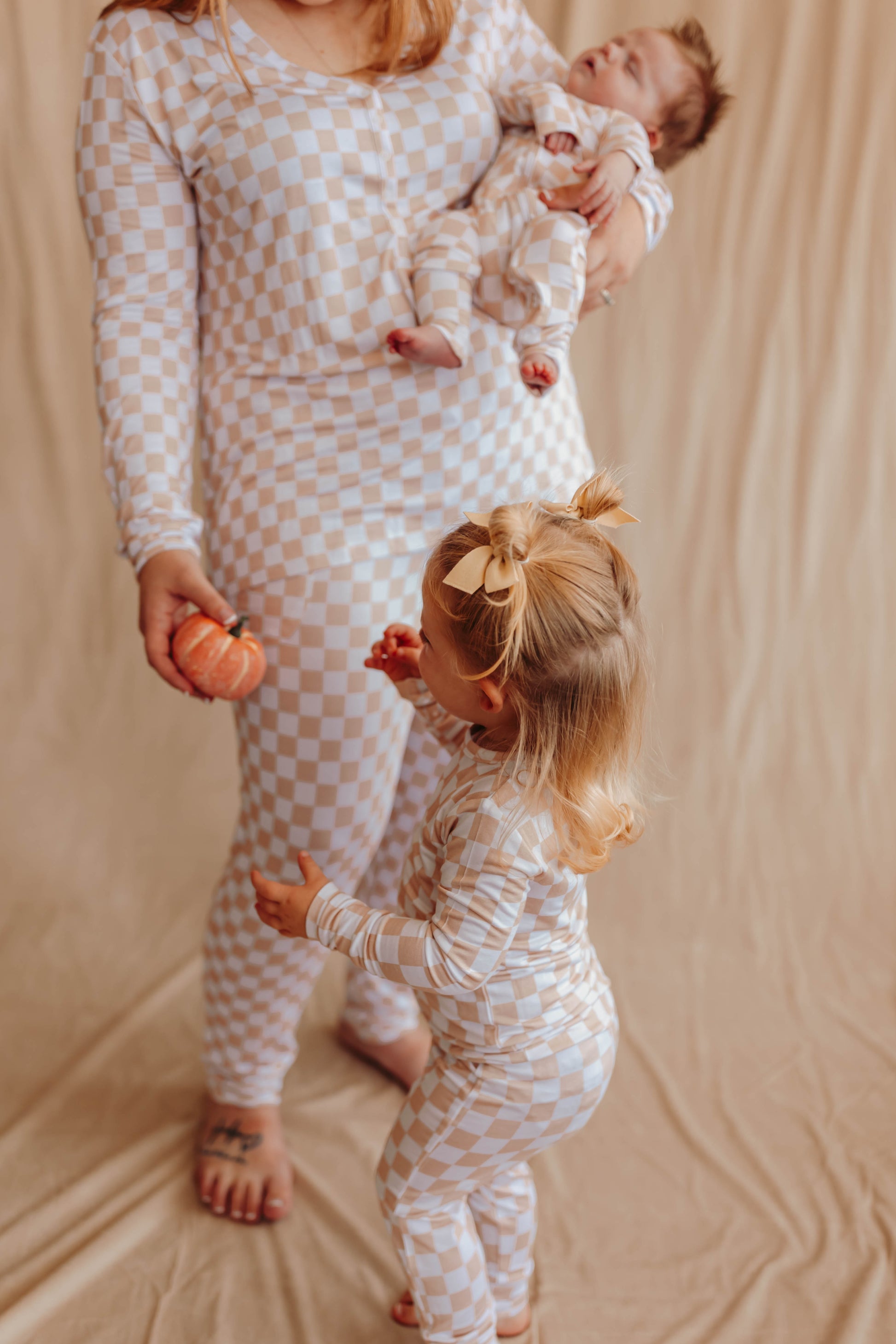 Check out this one baby! Taylor is the perfect checkered almond and white design for anyone! Taylor is neutral for family matching and perfect for coordinating hospital photos.