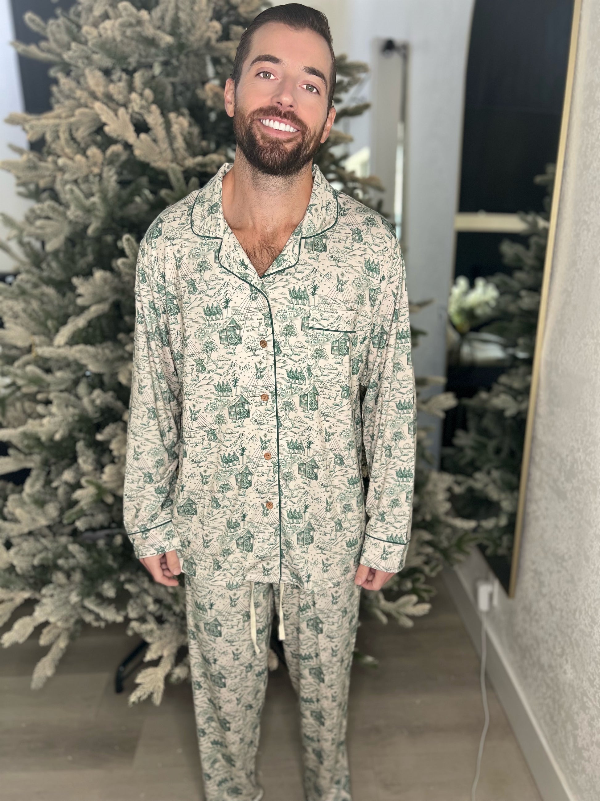 Men's Holiday Set- have a wooden button up detail with a pocket and collar. The functional drawstring pants come with pockets and a straight wide leg with matching bottom cuff.