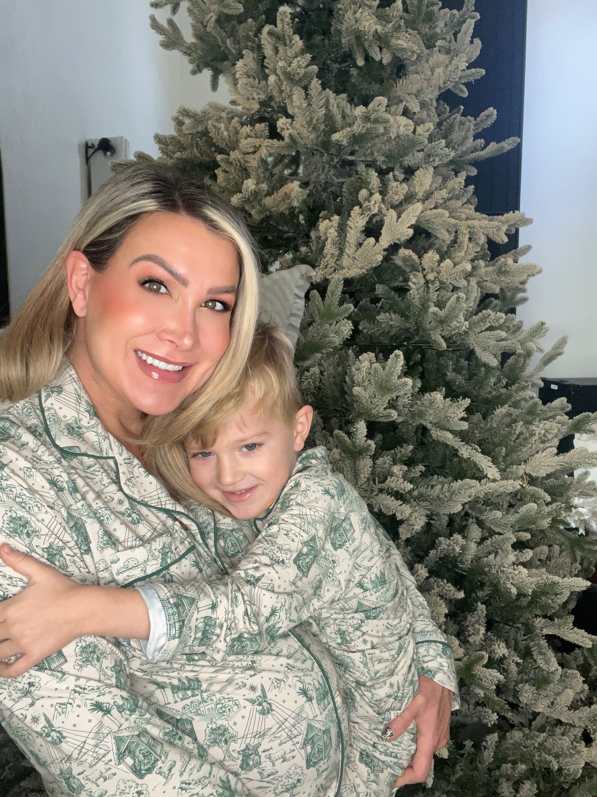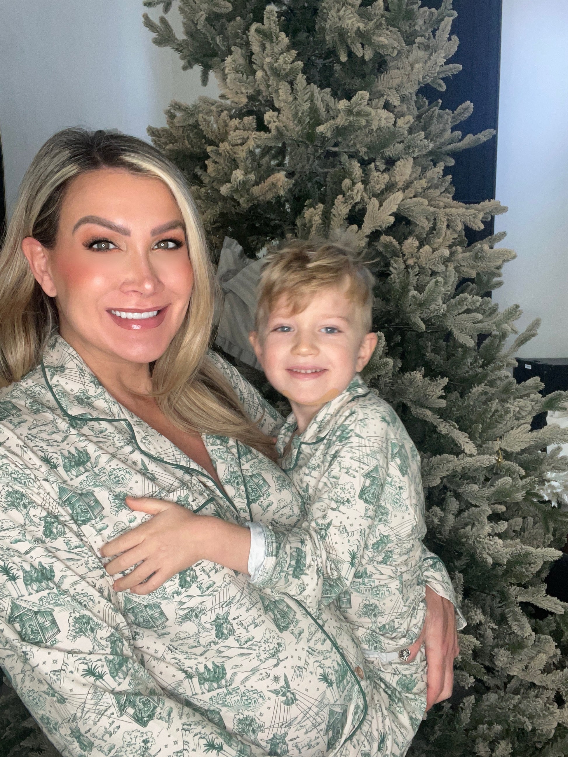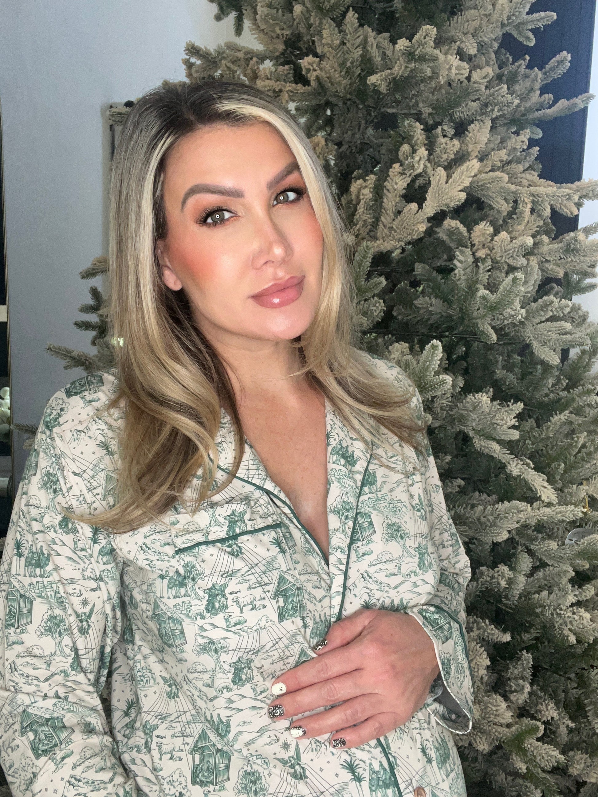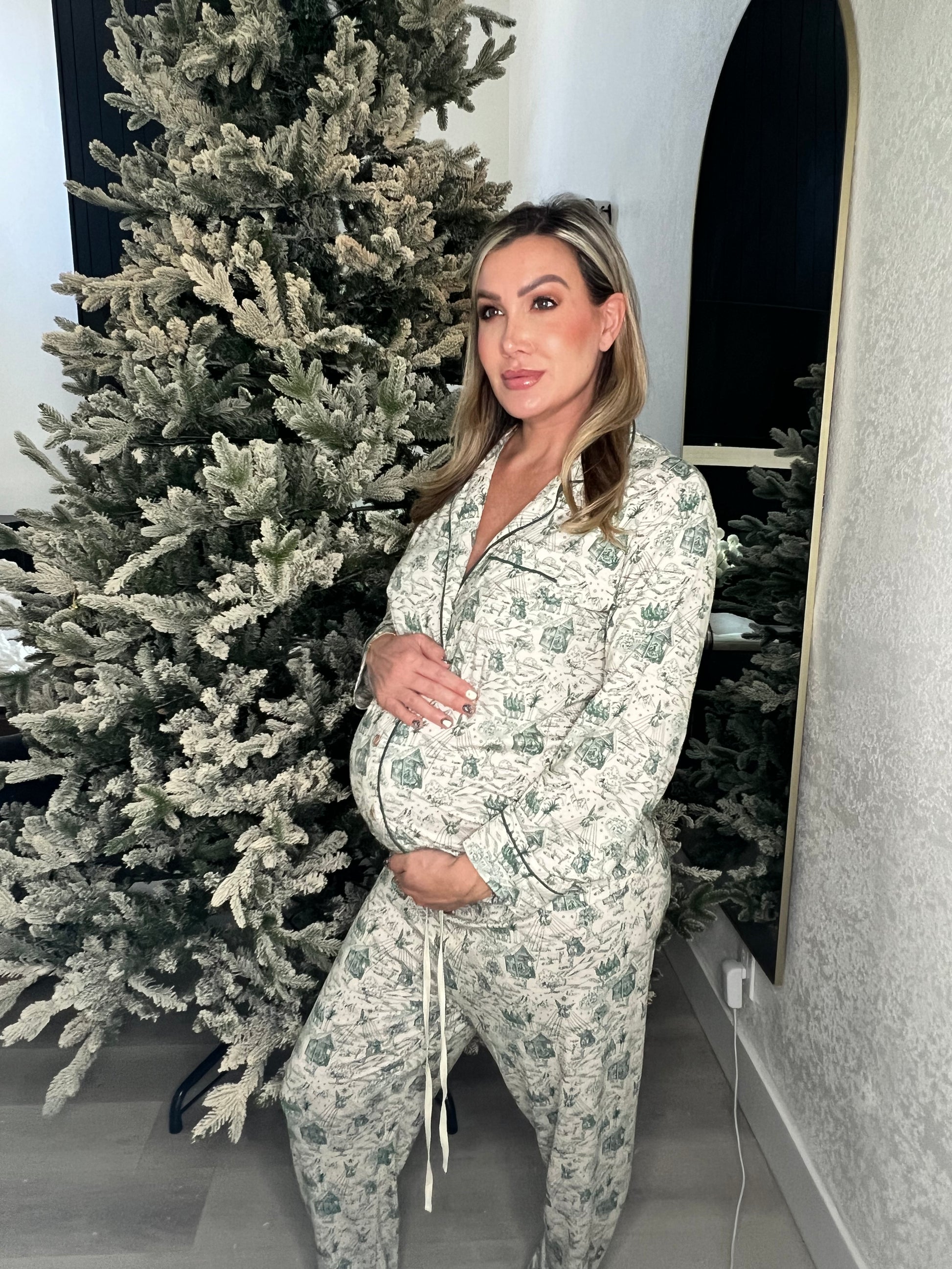 The Women's Holiday Style Butter Jams have a collar, shirt pocket and functional wooden buttons. The trim is edged with beautiful piping for a classic and elevated style. Women's pants are straight leg and loose in style with a wide cuff and piping on the hem. Yes! Of course they have pockets because #momlife