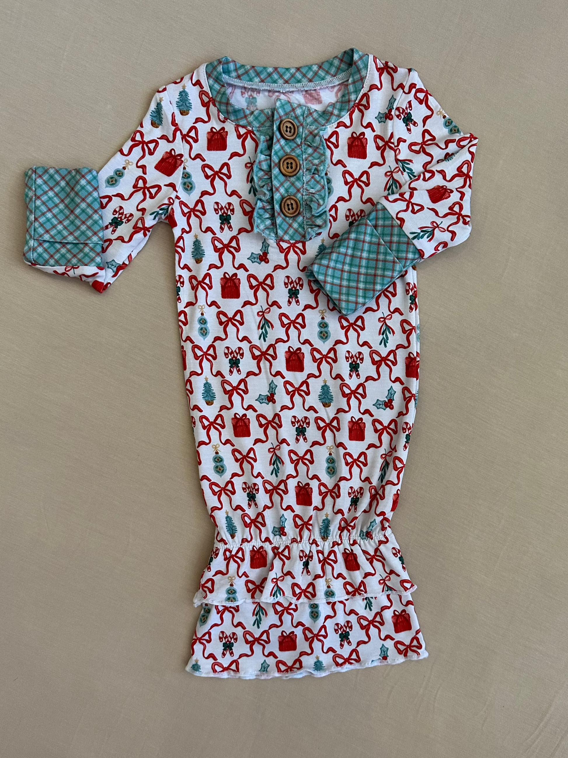 Cuddle Butters Nursery Gowns- Perfect for any newborn. Our design is hospital friendly with functional wooden buttons allowing access to baby's chest and shoulders. The open bottom elastic design is both adorable with ruffle detail and functional for diaper changes or gathering NICU cords. Fold over mitts keep baby safe and warm. Pairs with the Newborn Gnome Bonnet.