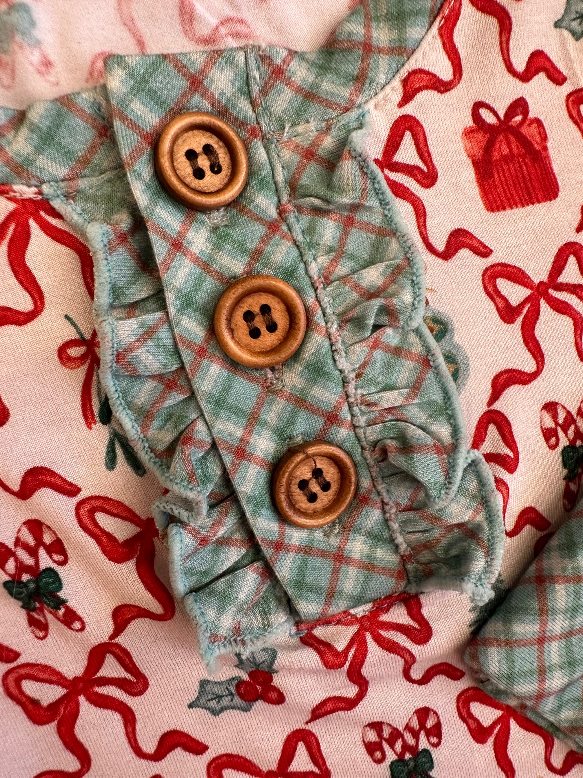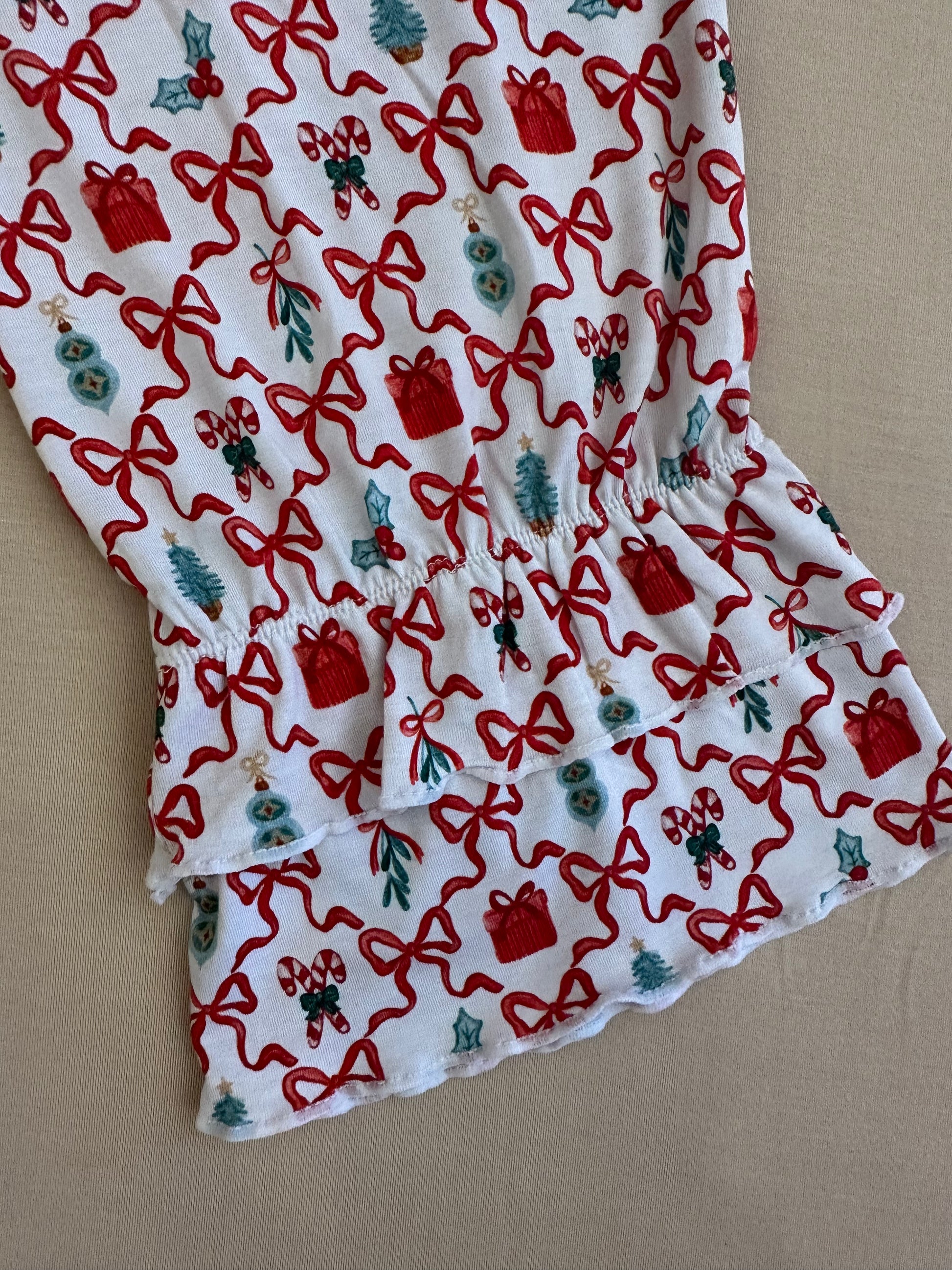 Wrapped in Ruby - Beautiful Coquette Style Ribbons adorn this pattern with gifts, ornaments, mistletoe and candy canes. Trimmed in McCallister Plaid and ruffles galore! This charmer is the perfect blend of Grandmillennial and holiday.