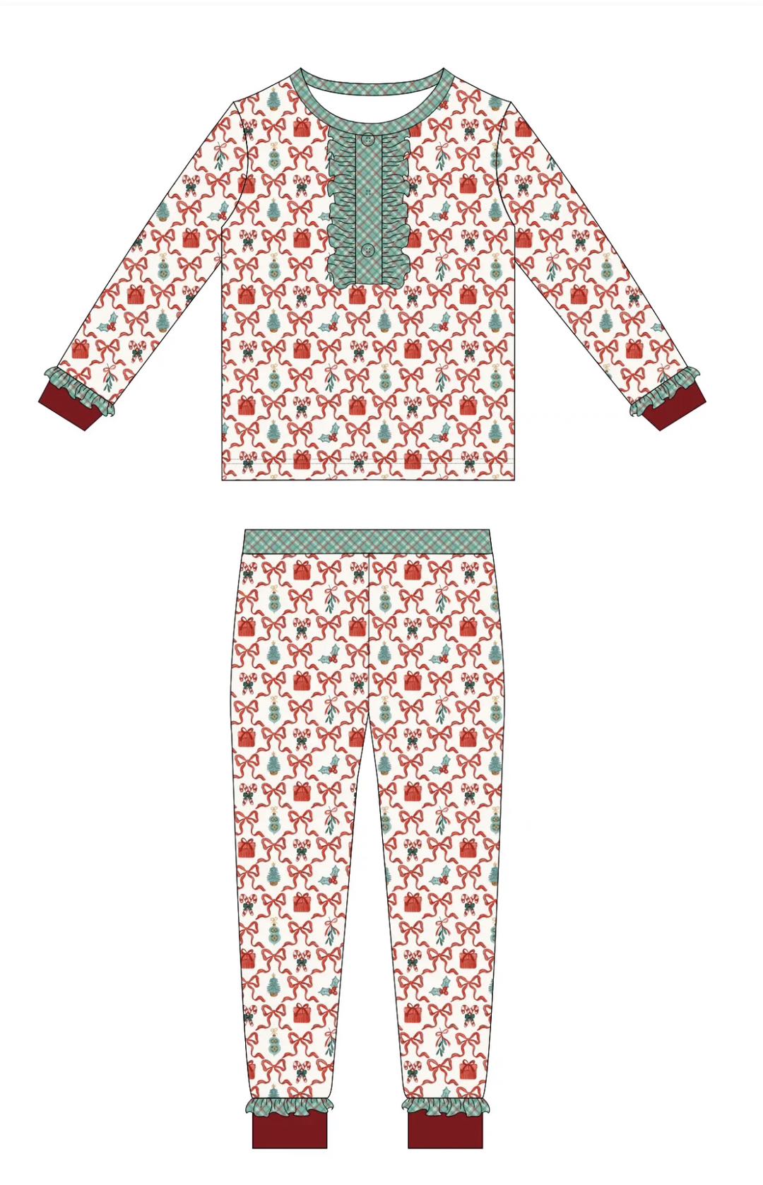Wrapped in Ruby - Beautiful Coquette Style Ribbons adorn this pattern with gifts, ornaments, mistletoe and candy canes. Trimmed in McCallister Plaid and ruffles galore! This charmer is the perfect blend of Grandmillennial and holiday.