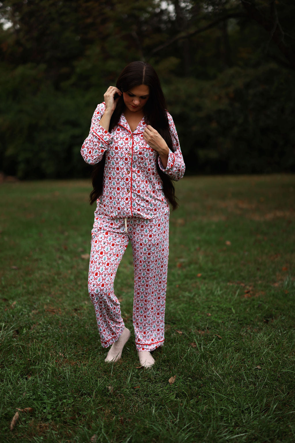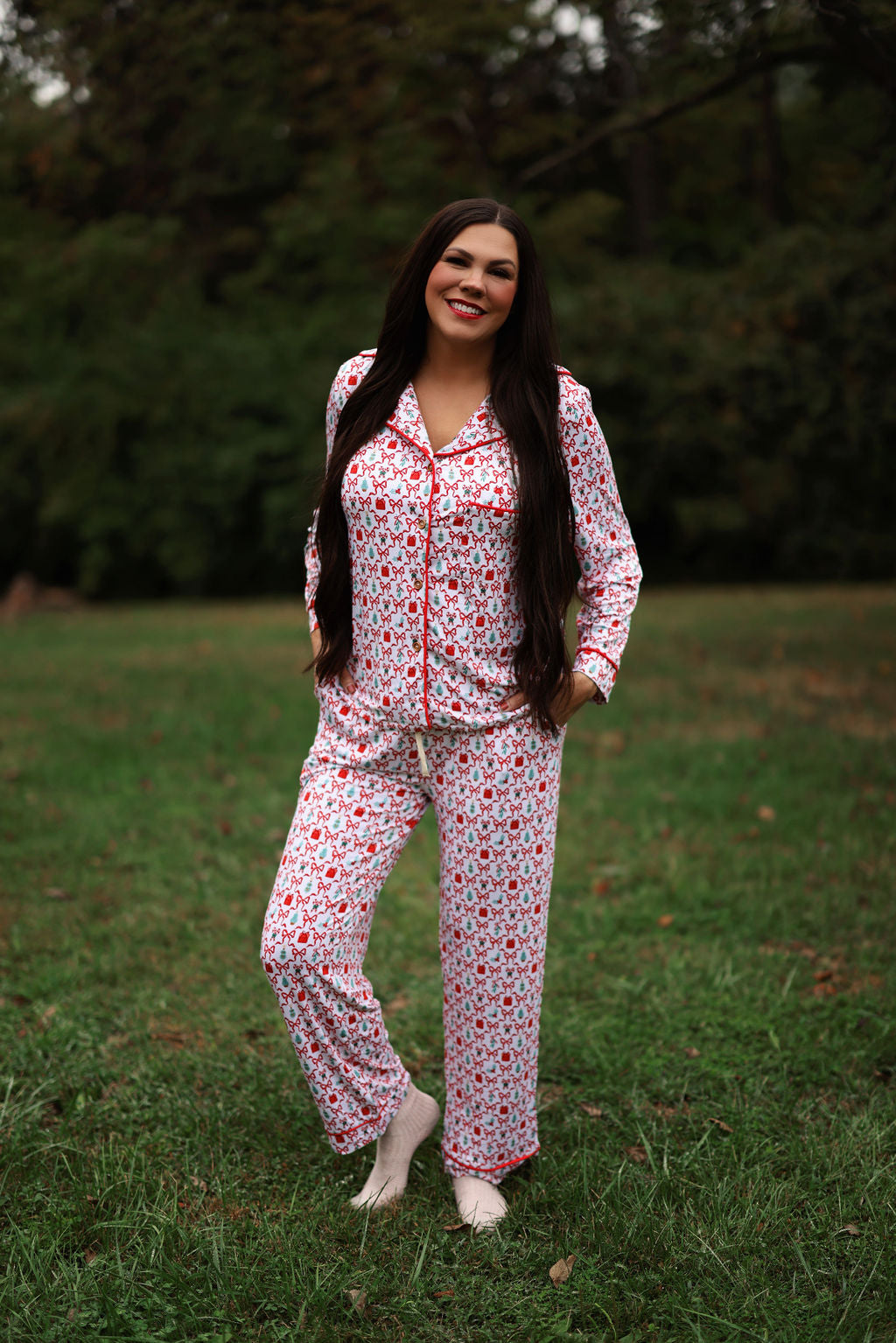 Women’s Holiday - The Women's Holiday Style Butter Jams have a collar, shirt pocket and functional wooden buttons. The trim is edged with beautiful piping for a classic and elevated style. Women's pants are straight leg and loose in style with a wide cuff and piping on the hem. Yes! Of course they have pockets because #momlife